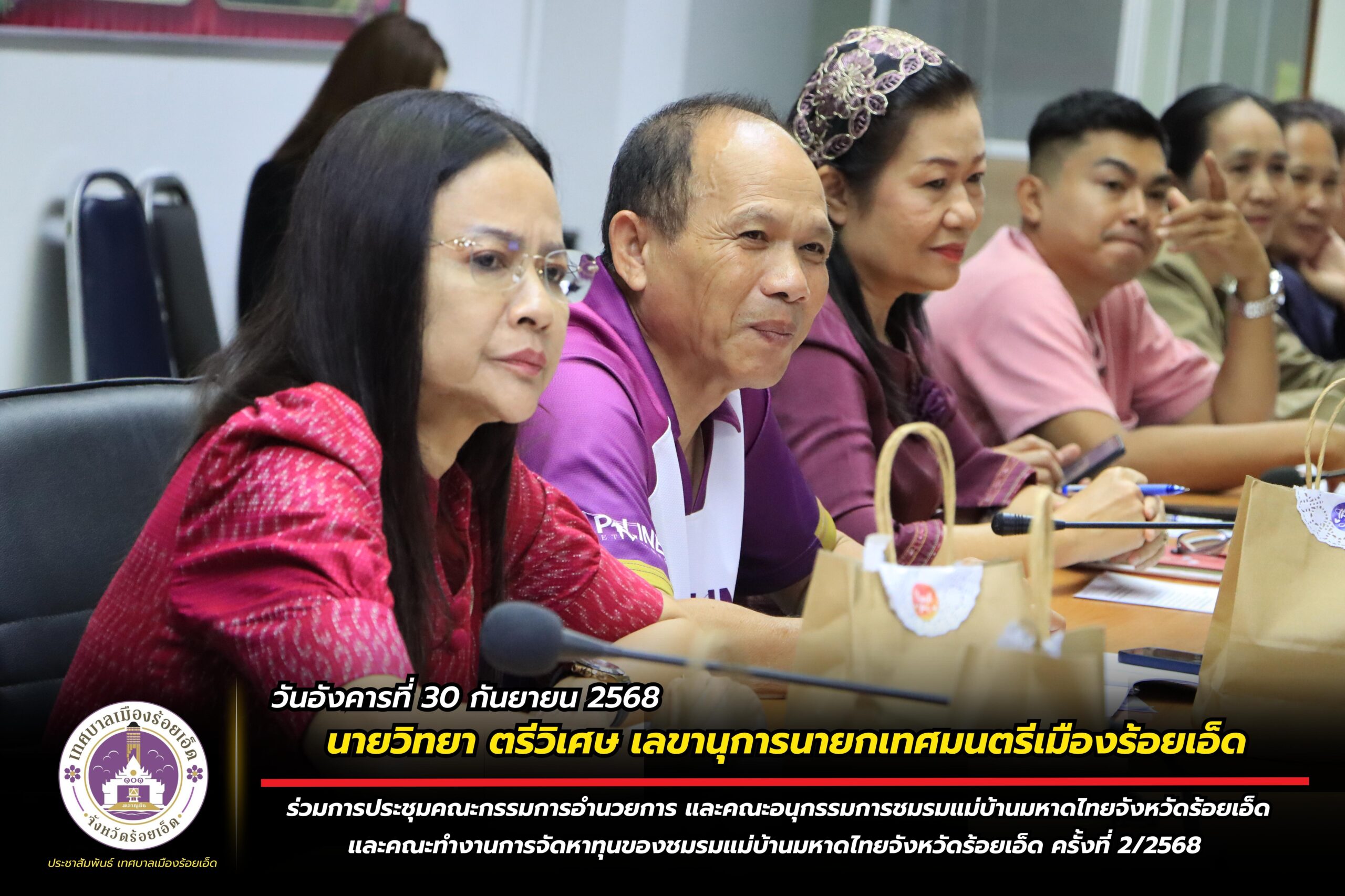 วันอังคารที่ 30 กันยายน 2568 เวลา 14.00 น. นายวิทยา ตรีวิเศษ เลขานุการนายกเทศมนตรีเมืองร้อยเอ็ด ร่วมการประชุมคณะกรรมการอำนวยการ และคณะอนุกรรมการชมรมแม่บ้านมหาดไทยจังหวัดร้อยเอ็ดและคณะทำงานการจัดหาทุนของชมรมแม่บ้านมหาดไทยจังหวัดร้อยเอ็ด ครั้งที่ 2/2568 โดยมี นายชัชวาลย์ เบญจสิริวงศ์ ผู้ว่าราชการจังหวัดร้อยเอ็ด เป็นประธานการประชุม พร้อมด้วยหัวหน้าส่วนราชการ และส่วนเกี่ยวข้องเข้าร่วมประชุมในครั้งนี้ ณ ห้องประชุมพระเวสสันดร ชั้น 3 ศาลากลางจังหวัดร้อยเอ็ด