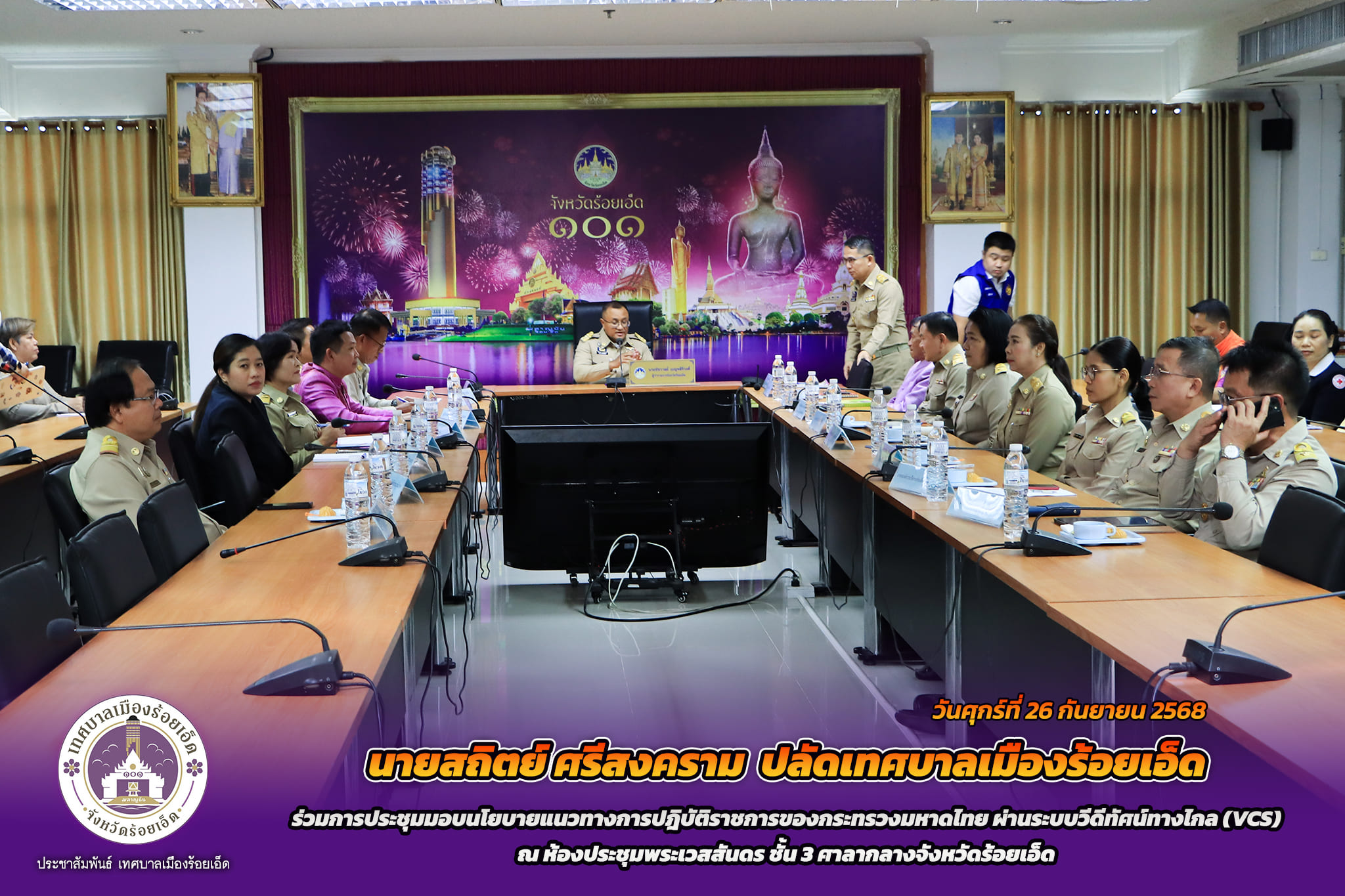 วันศุกร์ที่ 26 กันยายน 2568 เวลา 15.00 น. นายสถิตย์ ศรีสงคราม ปลัดเทศบาลเมืองร้อยเอ็ด ร่วมการประชุมมอบนโยบายแนวทางการปฎิบัติราชการของกระทรวงมหาดไทย ผ่านระบบวีดีทัศน์ทางไกล (VCS) โดยมี นายอนุทิน ชาญวีรกูล นายกรัฐมนตรี และรัฐมนตรีว่าการกระทรวงมหาดไทย เป็นประธานการประชุม ซึ่งมี นายชัชวาลย์ เบญจสิริวงศ์ ผู้ว่าราชการจังหวัดร้อยเอ็ด พร้อมด้วย รองผู้ว่าราชการจังหวัดร้อยเอ็ด, หัวหน้าส่วนราชการ, หัวหน้าหน่วยงานรัฐวิสาหกิจในสังกัดกระทรวงมหาดไทย และเจ้าหน้าที่ผู้เกี่ยวข้อง ร่วมการประชุมฯ ในครั้งนี้ ณ ห้องประชุมพระเวสสันดร ชั้น 3 ศาลากลางจังหวัดร้อยเอ็ด