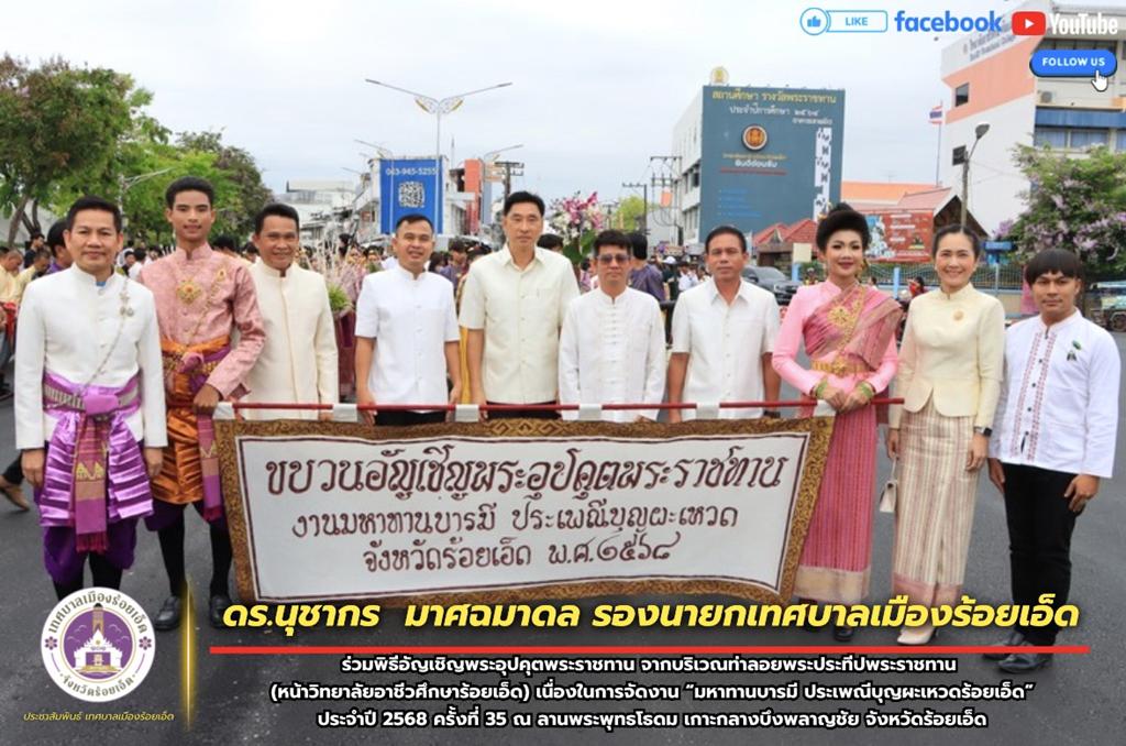 ดร.นุชากร มาศฉมาดล รองนายกเทศมนตรีเมืองร้อยเอ็ด พร้อมด้วย คณะผู้บริหารและเจ้าหน้าที่ผู้เกี่ยวข้อง ร่วมพิธีบวงสรวงและสักการะสิ่งศักดิ์สิทธิ์ เนื่องในการจัดงาน “มหาทานบารมี ประเพณีบุญผะเหวดร้อยเอ็ด” ประจำปี 2568 ครั้งที่ 35 ณ บริเวณสวนสมเด็จพระศรีนครินทร์ร้อยเอ็ดและเกาะกลางบึงพลาญชัย จังหวัดร้อยเอ็ด
