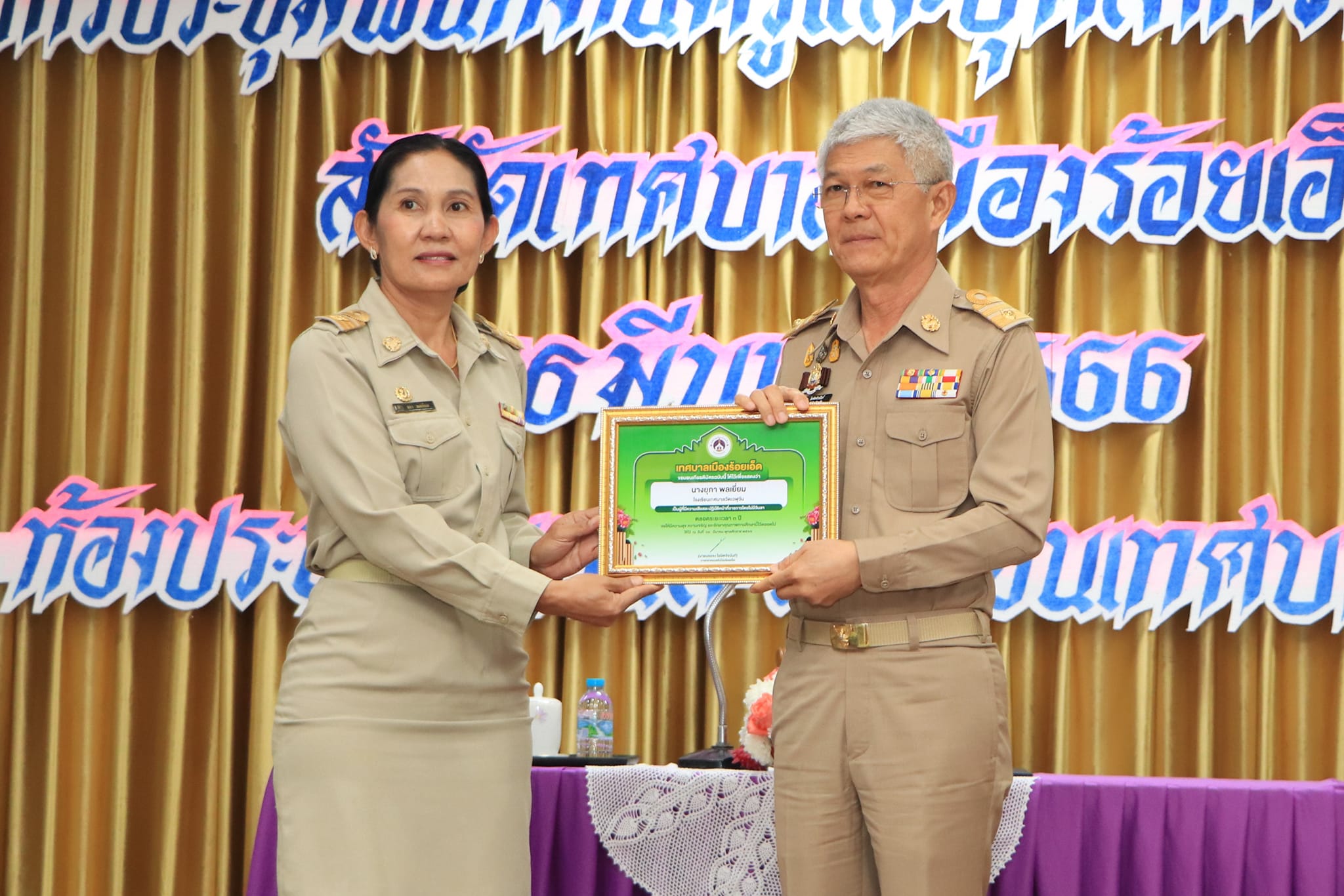 วันพฤหัสบดีที่ 16 มีนาคม 2566 เวลา 13.00 น. นายบรรจง โฆษิตจิรนันท์ นายกเทศมนตรีเมืองร้อยเอ็ด เป็นประธานการประชุมพนักงานครูและบุคลากรทางการศึกษา สังกัดเทศบาลเมืองร้อยเอ็ด พร้อมมอบเกียรติบัตรแก่ครูไม่มีวันลา ประจำปีการศึกษา 2565 และมอบนโยบายการจัดการศึกษาแก่พนักงานครูสังกัดเทศบาลเมืองร้อยเอ็ด ซึ่งมี ดร.นุชากร มาศฉมาดล รองนายกเทศมนตรีเมืองร้อยเอ็ด พร้อมด้วย นายสถิตย์ ศรีสงคราม ปลัดเทศบาลเมืองร้อยเอ็ด มอบนโยบาลแนวทางการปฏิบัติงานแก่พนักงานครูสังกัดเทศบาลเมืองร้อยเอ็ด ณ ห้องประชุมอินทนิล โรงเรียนเทศบาลวัดสระทอง เทศบาลเมืองร้อยเอ็ด