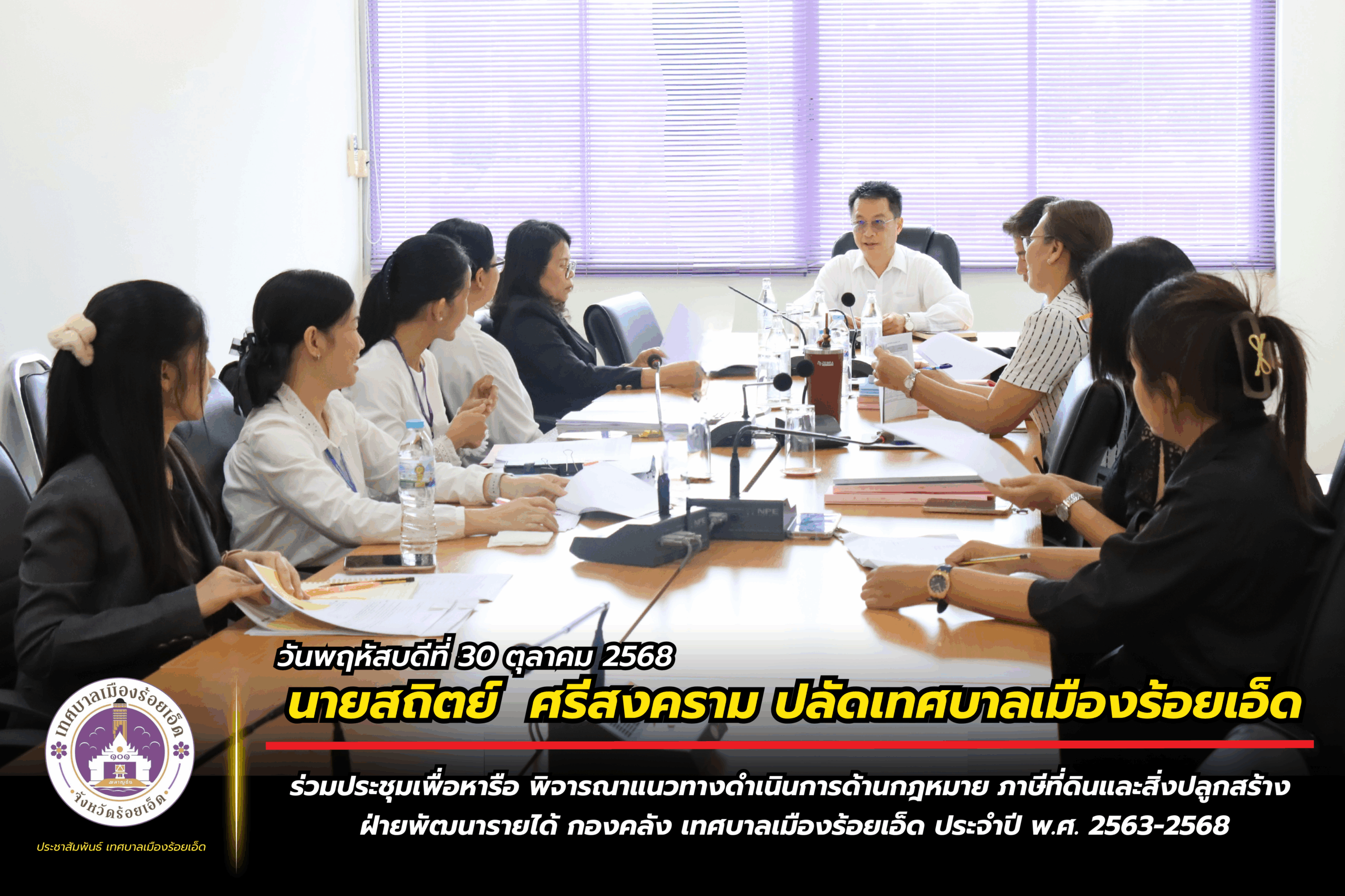 วันพฤหัสบดีที่ 30 ตุลาคม 2568 เวลา 13.30 น. นายสถิตย์ ศรีสงคราม ปลัดเทศบาลเมืองร้อยเอ็ด พร้อมด้วย นางวัชรี ศรีทอง ผู้อำนวยการกองคลัง หัวหน้าฝ่าย หัวหน้างาน และเจ้าหน้าที่ผู้เกี่ยวข้อง ร่วมประชุมเพื่อหารือ พิจารณาแนวทางดำเนินการด้านกฎหมาย ภาษีที่ดินและสิ่งปลูกสร้าง ฝ่ายพัฒนารายได้ กองคลัง เทศบาลเมืองร้อยเอ็ด ประจำปี พ.ศ. 2563-2568 ณ ห้องประชุมเพลินจิต ศูนย์บริการร่วมแบบเบ็ดเสร็จ ( One Stop Service ) สำนักงานเทศบาลเมืองร้อยเอ็ด