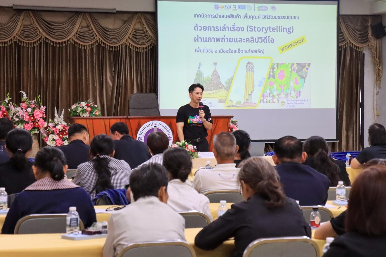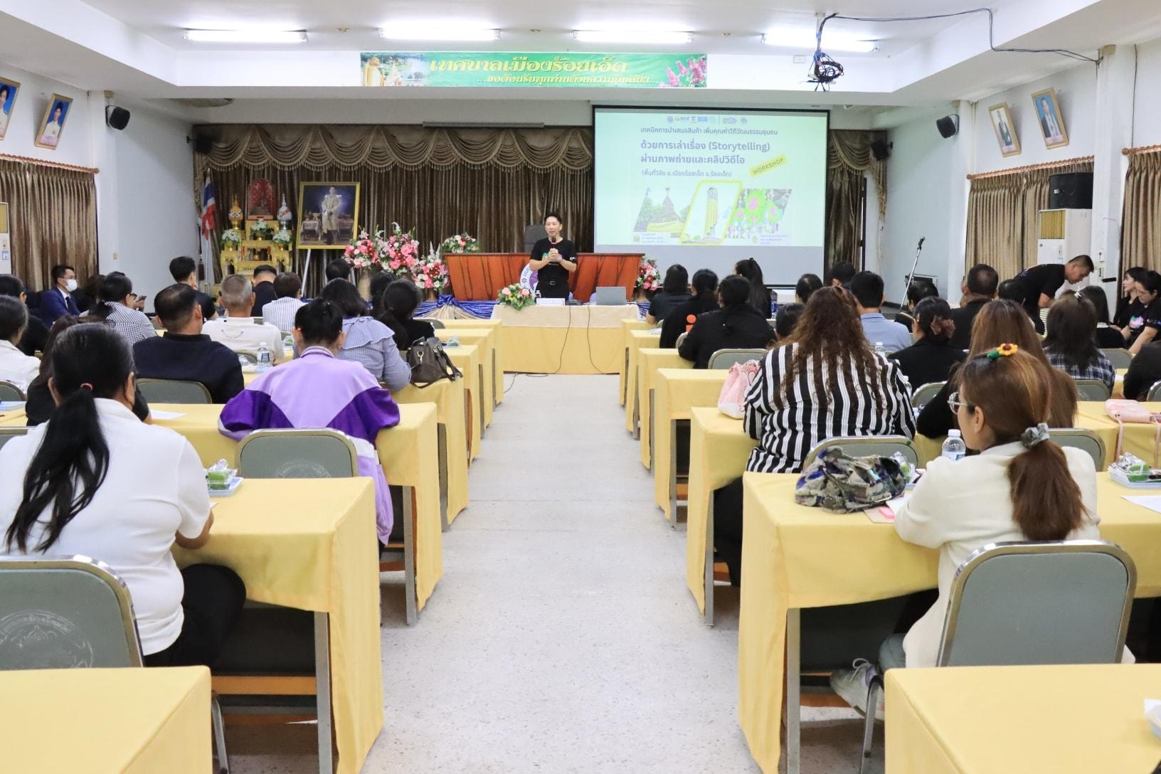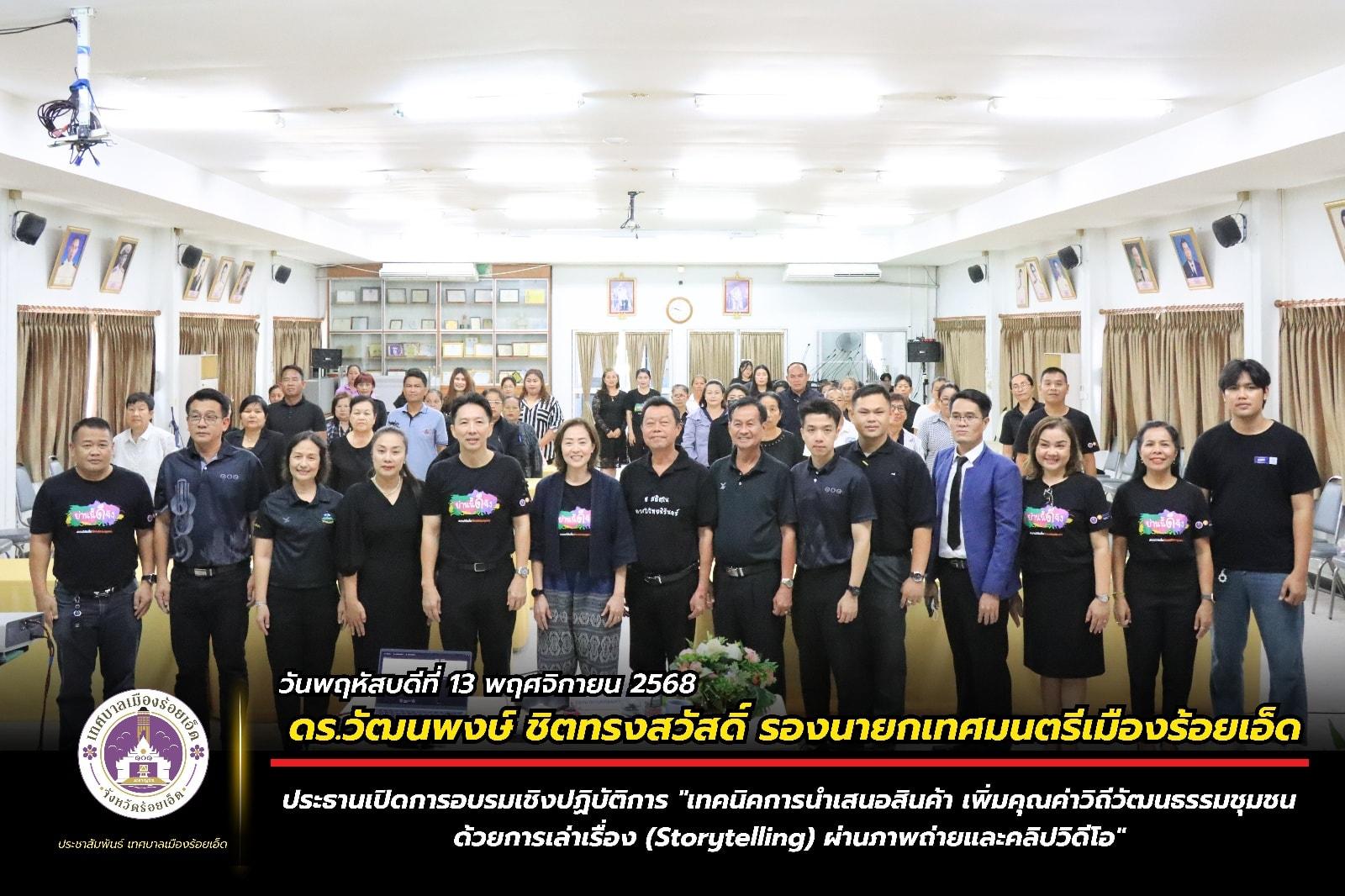 วันพฤหัสบดีที่ 13 พฤศจิกายน 2568 เวลา 09.30 น. ดร.วัฒนพงษ์ ชิตทรงสวัสดิ์ รองนายกเทศมนตรีเมืองร้อยเอ็ด เป็นประธานเปิดการอบรมเชิงปฏิบัติการ “เทคนิคการนำเสนอสินค้า เพิ่มคุณค่าวิถีวัฒนธรรมชุมชนด้วยการเล่าเรื่อง (Storytelling) ผ่านภาพถ่ายและคลิปวิดีโอ” จัดขึ้นโดยเทศบาลเมืองร้อยเอ็ดร่วมกับ โครงการบริหารจัดการสื่อวัฒนธรรมชุมชน “12 พื้นที่วิจัย 38 ย่านวัฒนธรรมชุมชน” ภายใต้โครงการวิจัย เรื่อง “การพัฒนาเมืองแห่งทุนวัฒนธรรมที่ยั่งยืน และเครือข่ายย่านวัฒนธรรมชุมชน มหาวิทยาลัยศิลปากร โดยหน่วยบริหารและจัดการทุนด้านการพัฒนาระดับพื้นที่ (บพท.) กระทรวงการอุดมศึกษา วิทยาศาสตร์ วิจัยและนวัตกรรม (อว.) พร้อมให้สัมภาษณ์เกี่ยวกับการส่งเสริมสินค้าของชุมชน โดยมี ผศ.ดร.สาธิต กฤตลักษณ์ ประธานสภาเทศบาล นายสมเกียรติ กาญจนหงษ์ รองประธานสภาเทศบาล สมาชิกสภาเทศบาล รองปลัดเทศบาล หัวหน้าส่วนการบริหาร หัวหน้าฝ่าย หัวหน้างาน กลุ่มผู้ค้าตลาดชุมชนในเขตเทศบาลเมืองร้อยเอ็ด และเจ้าหน้าที่ผู้เกี่ยวข้อง เข้าร่วมการอบรมฯ ณ ห้องประชุมสุนทรเทพ (ชั้น 3) และ ห้องประชุมปัทมานนท์ Smart Room (ชั้น 2) สำนักงานเทศบาลเมืองร้อยเอ็ด