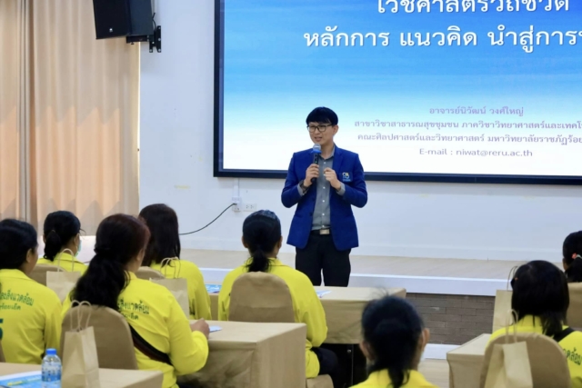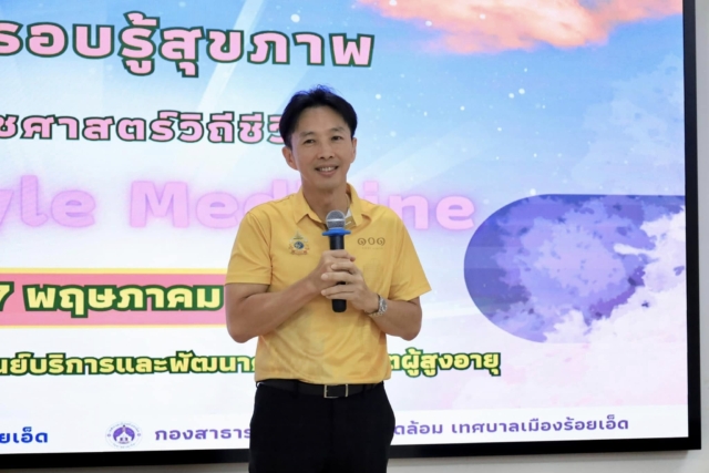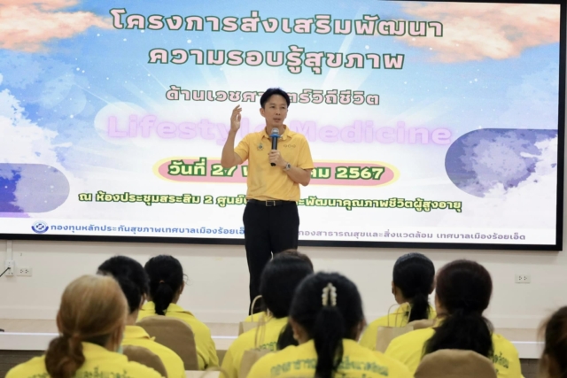 วันจันทร์ที่ 27 พฤษภาคม 2567 เวลา 13.30 น. ดร.วัฒนพงษ์ ชิตทรงสวัสดิ์ รองนายกเทศมนตรีเมืองร้อยเอ็ด เป็นประธานเปิดการอบรมโครงการส่งเสริมพัฒนาความรอบรู้สุขภาพด้านเวชศาสตร์วิถีชีวิต โดยมี ดร.มิตรธีรา วิสูตรานุกูล ประธานสภาเทศบาล, ว่าที่ ร.ท.อนันต์ เมาะราษี รองปลัดเทศบาล, นางเพ็ญละดา ภารัง ผู้อำนวยการกองสาธารณสุขฯ, หัวหน้าฝ่าย, หัวหน้างาน และเจ้าหน้าที่ผู้เกี่ยวข้อง ร่วมเปิดโครงการครั้งนี้ ด้วยเทศบาลเมืองร้อยเอ็ด ดำเนินโครงการส่งเสริมพัฒนาความรอบรู้สุขภาพด้านเวชศาสตร์วิถีชีวิต กำหนดจัดอบรมความรู้เกี่ยวกับแนวทางและการปรับเปลี่ยนพฤติกรรมอย่างมีคุณภาพตามหลักเวชศาสตร์วิถีชีวิต(Lifestyle Medicine) เพื่อให้พนักงานจ้าง กองสาธารณสุขและสิ่งแวดล้อมเทศบาลเมืองร้อยเอ็ด มีความรอบรู้และตระหนักในการดูแลสุขภาพเพื่อลดปัจจัยเสี่ยง ป้องกันการเกิดโรคและการเจ็บป่วยได้ พร้อมทั้งรับฟังบรรยายความรู้เรื่อง “เวชศาสตร์วิถีขีวิต หลักการ แนวคิดนำสู่การปฏิบัติ” โดยอาจารย์นิวัฒน์ วงศ์ใหญ่ สังกัดสาขาวิชาสาธารณสุขชุมชน ภาควิชาวิทยาศาสตร์และเทคโนโลยี คณะศิลปศาสตร์และวิทยาศาสตร์ มหาวิทยาลัยราชภัฏร้อยเอ็ด ณ ห้องประชุมสระสิม2 (ชั้น2) ศูนย์บริการและพัฒนาคุณภาพชีวิตผู้สูงอายุเทศบาลเมืองร้อยเอ็ด