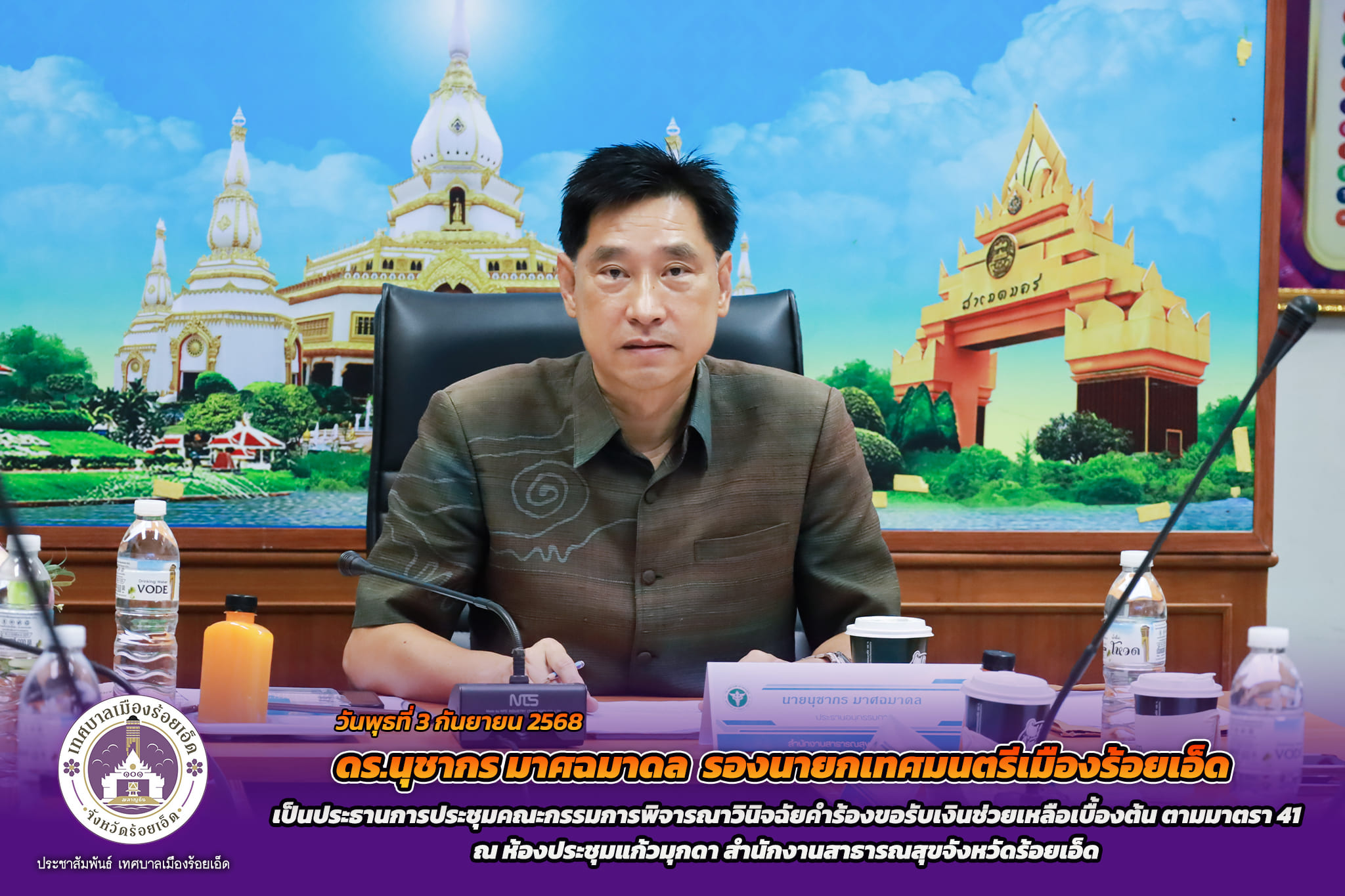 ดร.นุชากร มาศฉมาดล รองนายกเทศมนตรีเมืองร้อยเอ็ด เป็นประธานการประชุมคณะกรรมการพิจารณาวินิจฉัยคำร้องขอรับเงินช่วยเหลือเบื้องต้น ตามมาตรา 41 ณ สำนักงานสาธารณสุขจังหวัดร้อยเอ็ด