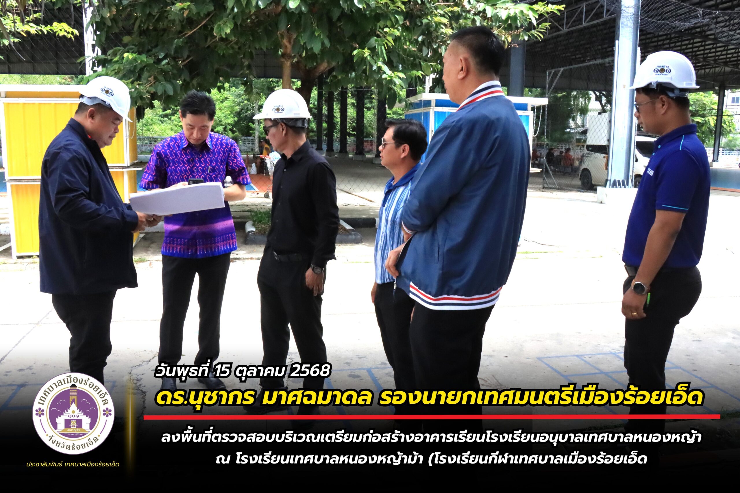 วันพุธที่ 15 ตุลาคม 2568 เวลา 10.00 น. ดร.นุชากร มาศฉมาดล รองนายกเทศมนตรีเมืองร้อยเอ็ด พร้อมด้วย นายพัฒนพงศ์ ศรีทอง ผู้อำนวยการกองช่างเทศบาลเมืองร้อยเอ็ด, นายยุทธพงษ์ คุริรัง ผู้อำนวยการสถานศึกษา, นายวิโรจน์ กลิ่นบัวแก้ว รองผู้อำนวยการสถานศึกษา, นายนิติกร ทองกุล สถาปนิกชำนาญการ กองช่างเทศบาลเมืองร้อยเอ็ด, หัวหน้าฝ่าย และเจ้าหน้าที่กองช่างเทศบาลเมืองร้อยเอ็ด ลงพื้นที่ตรวจสอบบริเวณเตรียมก่อสร้างอาคารเรียนโรงเรียนอนุบาลเทศบาลหนองหญ้า ณ โรงเรียนเทศบาลหนองหญ้าม้า (โรงเรียนกีฬาเทศบาลเมืองร้อยเอ็ด)