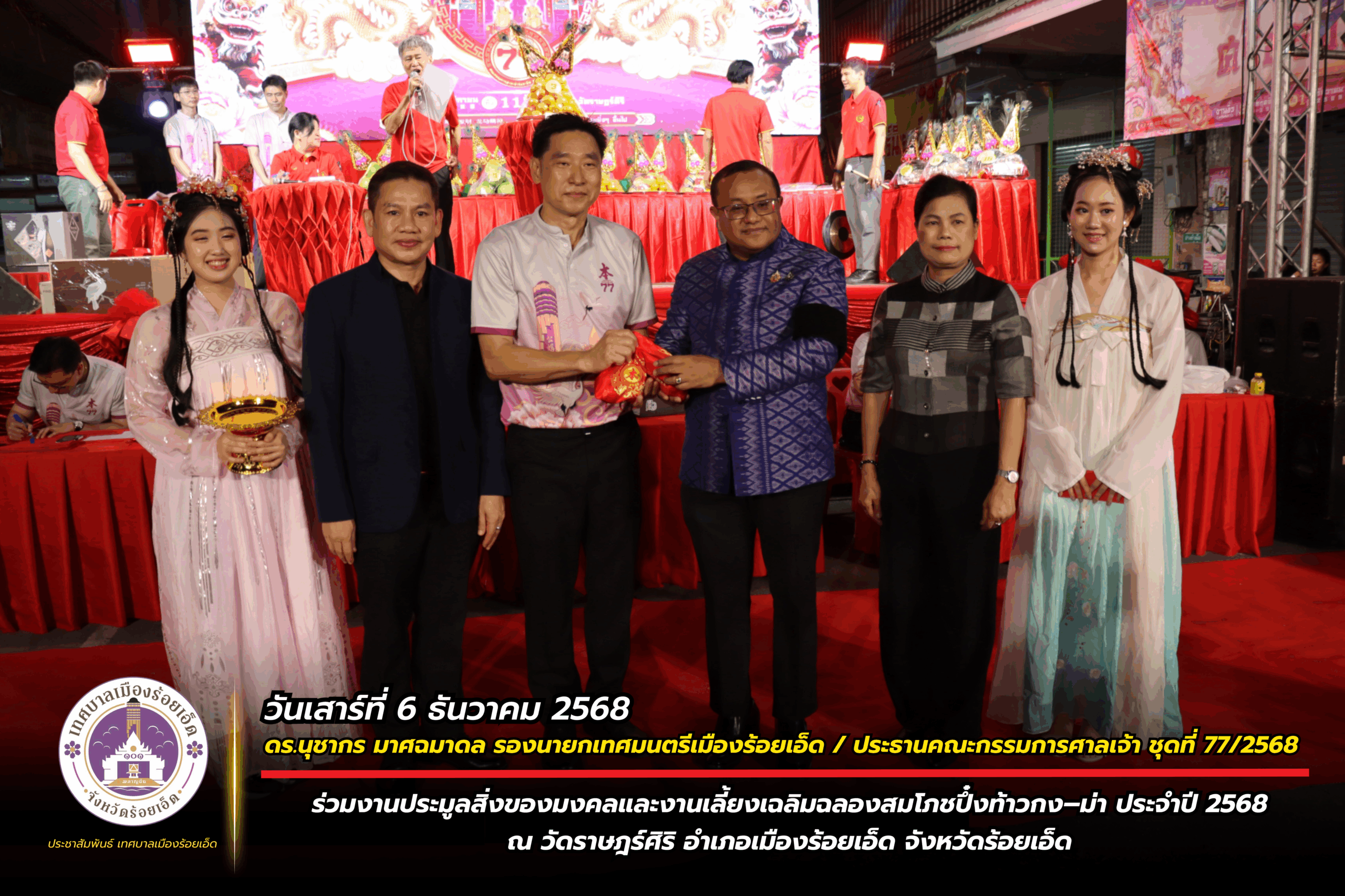 วันเสาร์ที่ 6 ธันวาคม 2568 เวลา 18.30 น. ดร.นุชากร มาศฉมาดล รองนายกเทศมนตรีเมืองร้อยเอ็ด และประธานคณะกรรมการศาลเจ้า ชุดที่ 77/2568 พร้อมด้วย นายเรืองรัตน์ รัตนโภคาสถิต รองนายกเทศมนตรีเมืองร้อยเอ็ด คณะผู้บริหาร สมาชิกสภาเทศบาลเมืองร้อยเอ็ด หัวหน้าส่วนการบริหาร และเจ้าหน้าที่ผู้เกี่ยวข้อง ร่วมงานประมูลสิ่งของมงคลและงานเลี้ยงเฉลิมฉลองสมโภชปึ๋งท้าวกง–ม่า ประจำปี 2568 โดยมี นายชัชวาลย์ เบญจสิริวงค์ ผู้ว่าราชการจังหวัดร้อยเอ็ด เป็นประธานในงานฯ พร้อมด้วยรองผู้ว่าราชการจังหวัดร้อยเอ็ด หัวหน้าส่วนราชการ คณะกรรมการศาลเจ้า และประชาชนชาวร้อยเอ็ดเชื้อสายจีน เข้าร่วมงาน ณ วัดราษฎร์ศิริ อำเภอเมืองร้อยเอ็ด จังหวัดร้อยเอ็ด