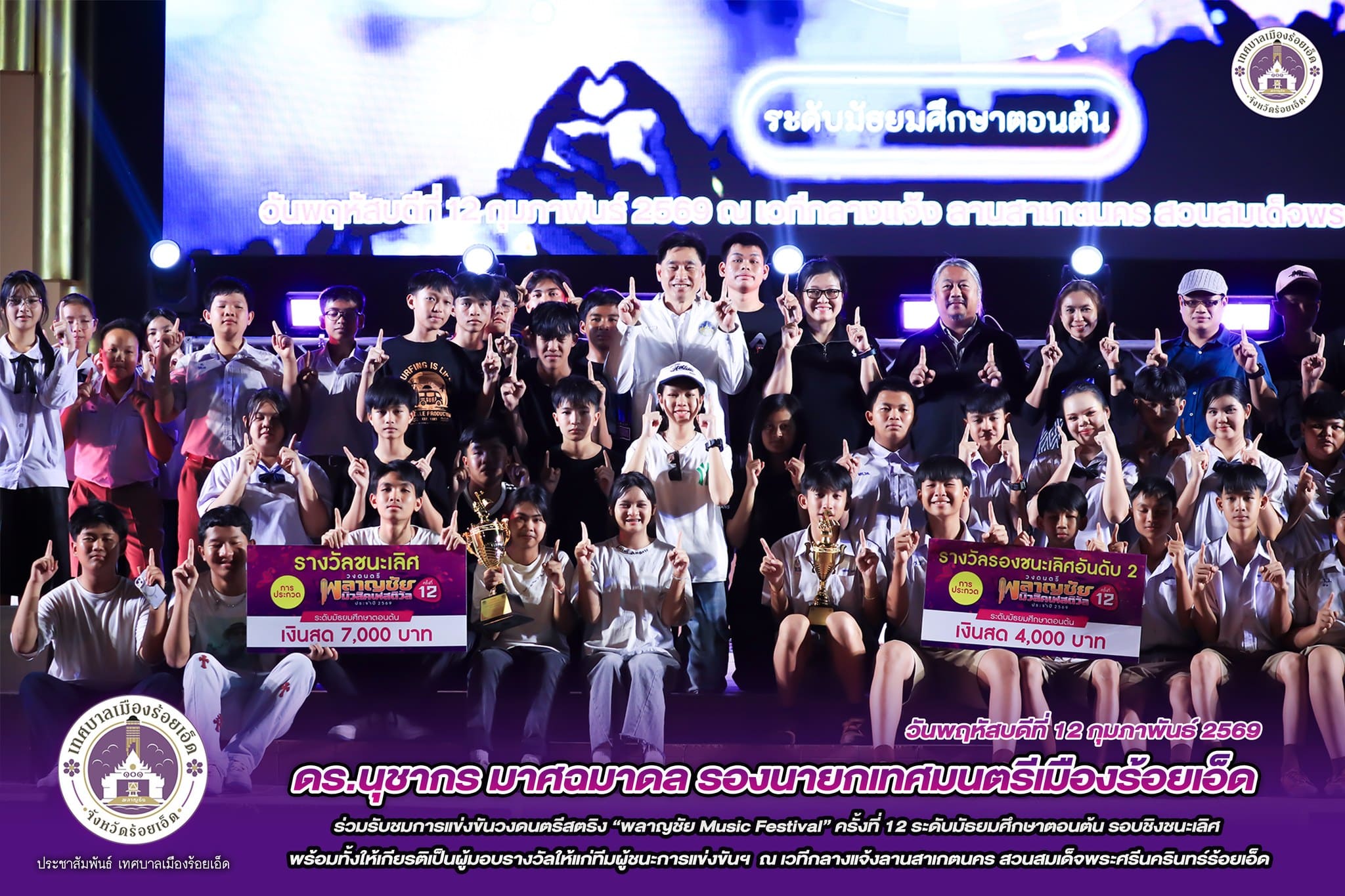 วันพฤหัสบดีที่ 12 กุมภาพันธ์ 2569 เวลา 18.00 – 21.30 น. ดร.นุชากร มาศฉมาดล รองนายกเทศมนตรีเมืองร้อยเอ็ด ร่วมรับชมการแข่งขันวงดนตรีสตริง “พลาญชัย Music Festival” ครั้งที่ 12 ระดับมัธยมศึกษาตอนต้น รอบชิงชนะเลิศ พร้อมทั้งให้เกียรติเป็นผู้มอบรางวัลให้แก่ทีมผู้ชนะการแข่งขันฯ โดยมี สิบเอกฐิระวัจน์ อรรคนันท์ รองปลัดเทศบาลเมืองร้อยเอ็ด พร้อมด้วย หัวหน้าส่วนการบริหาร คณะผู้บริหารสถานศึกษา หัวหน้าฝ่าย หัวหน้างาน คณะครู ประชาชน และเจ้าหน้าที่ผู้เกี่ยวข้อง ร่วมชมการแข่งขันวงดนตรีฯ ในครั้งนี้ ผลการแข่งขัน รางวัลชนะเลิศ ได้แก่ วงเด็กน้อย (โรงเรียนเมืองร้อยเอ็ด), รางวัลรองชนะเลิศอันดับ 1 ได้แก่ วง Small Room (โรงเรียนพนมไพรวิทยาคาร) และรางวัลรองชนะเลิศอันดับ 2 ได้แก่ วง RW Band Junior (โรงเรียนร้อยเอ็ดวิทยาลัย) ซึ่งได้รับเกียรติจาก ผู้ช่วยศาสตราจารย์ชญานิศ โนมะยา ฟลอส์ซี, อาจารย์จักพันธุ์ จันโทมุข และดร.วัชระ หอมหวน ร่วมเป็นกรรมตัดสินการประกวดฯ ในครั้งนี้ ณ เวทีกลางแจ้ง ลานสาเกตนคร สวนสมเด็จพระศรีนครินทร์ร้อยเอ็ด จังหวัดร้อยเอ็ด