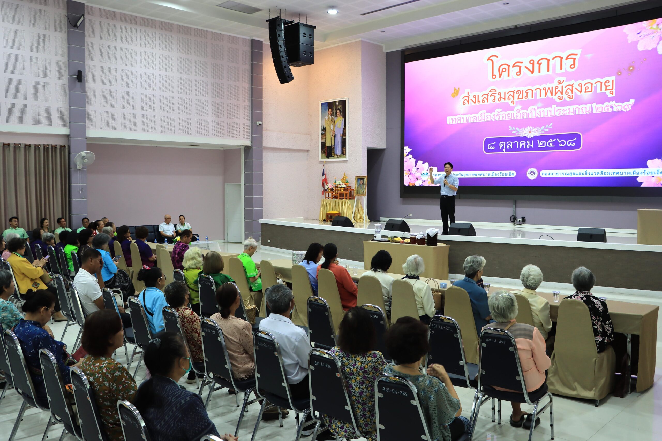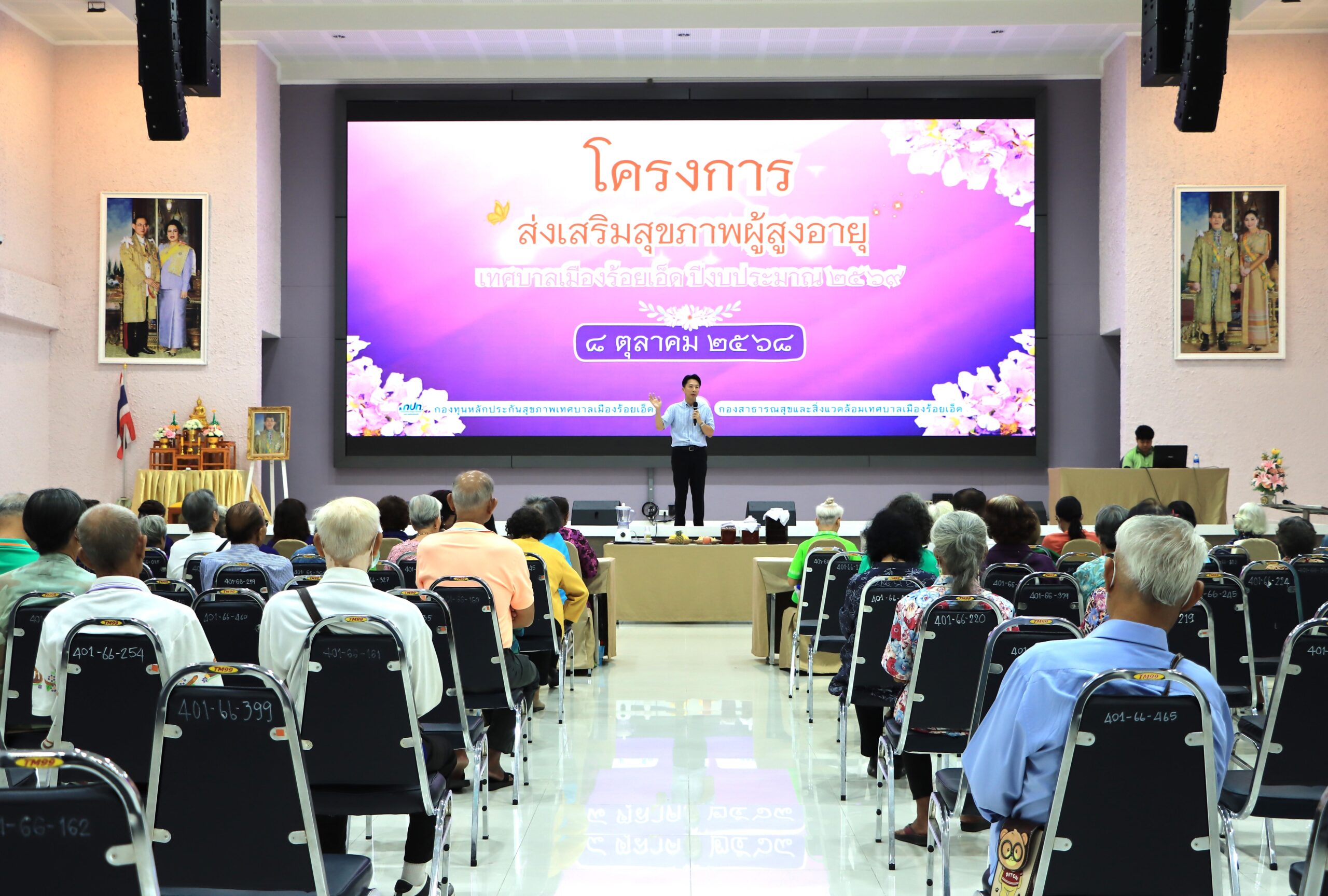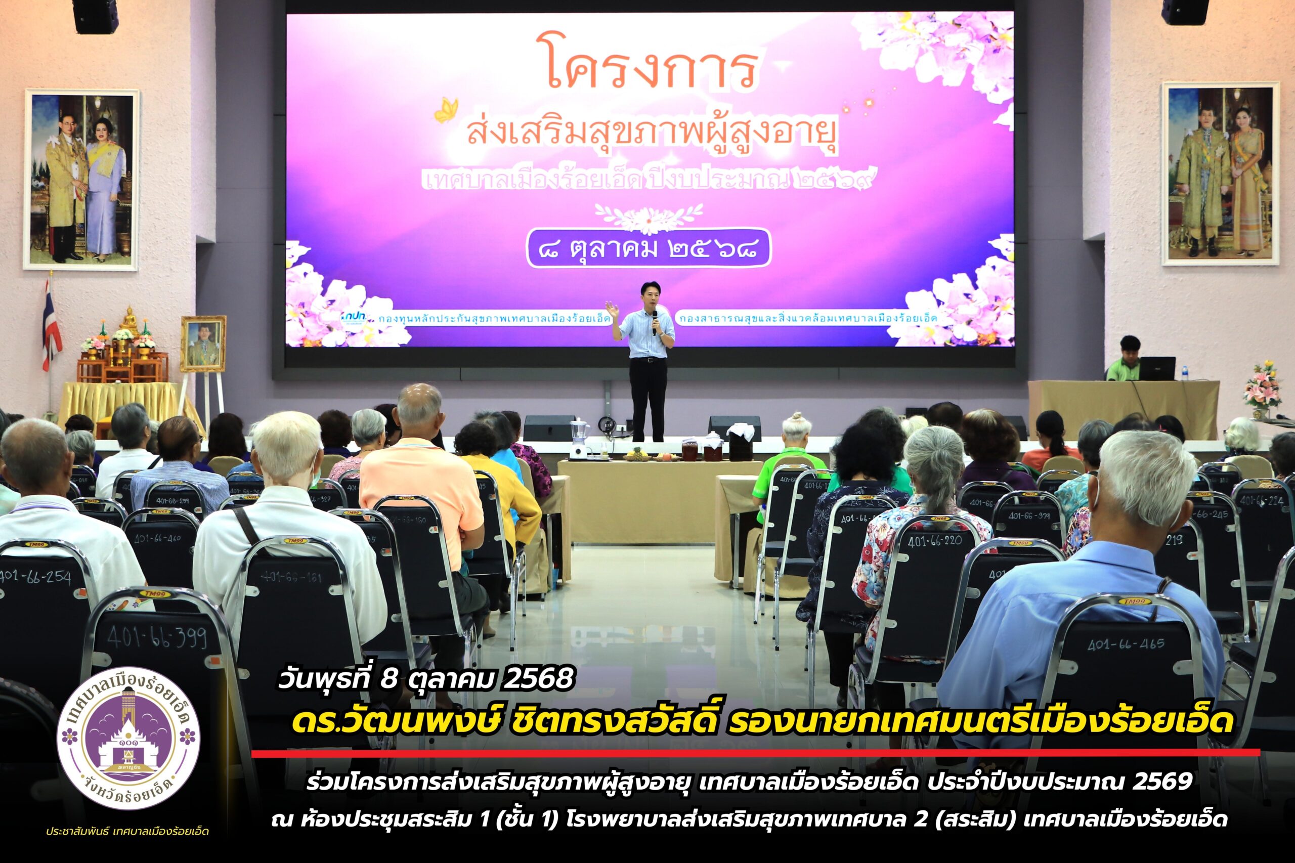 วันพุธที่ 8 ตุลาคม 2568 เวลา 09.00 น. ดร.วัฒนพงษ์ ชิตทรงสวัสดิ์ รองนายกเทศมนตรีเมืองร้อยเอ็ด พร้อมด้วย ประธานสภาเทศบาล, รองประธานสภาเทศบาล, สมาชิกสภาเทศบาล, รองปลัดเทศบาล, หัวหน้าส่วนการบริหาร, หัวหน้าฝ่าย, หัวหน้างาน, ประธานชุมชน, อสม. และเจ้าหน้าที่ผู้เกี่ยวข้อง ร่วมโครงการส่งเสริมสุขภาพผู้สูงอายุ เทศบาลเมืองร้อยเอ็ด ประจำปีงบประมาณ 2569 โดยมี นายพีรพงศ์ จุรีมาศ สมาชิกสภาองค์การบริหารส่วนจังหวัดร้อยเอ็ด ร่วมเป็นเกียรติและให้กำลังใจผู้สูงอายุในเขตเทศบาลเมืองร้อยเอ็ดในโอกาสนี้ ณ ห้องประชุมสระสิม 1 (ชั้น 1) โรงพยาบาลส่งเสริมสุขภาพเทศบาล 2 (สระสิม) เทศบาลเมืองร้อยเอ็ด