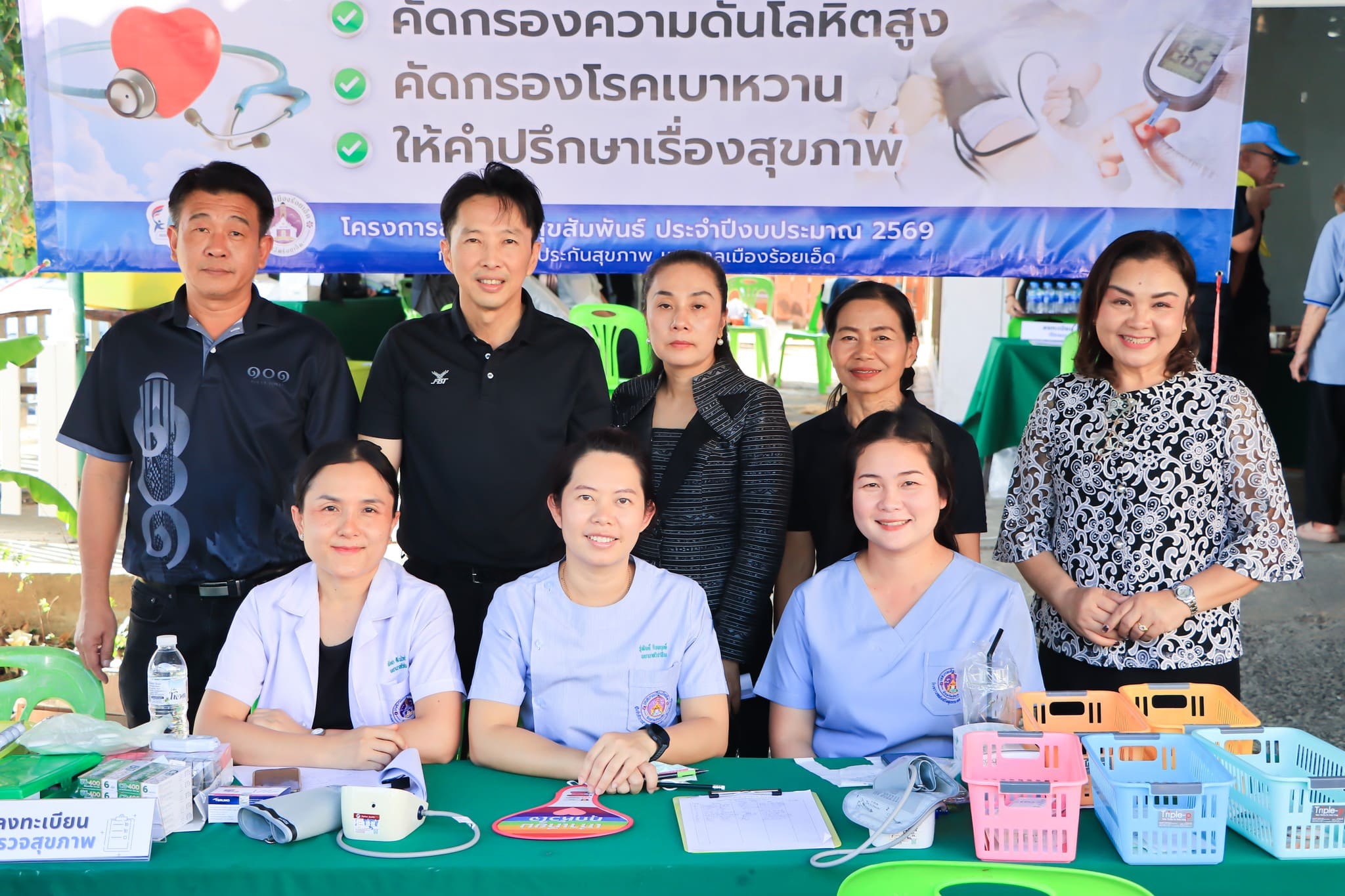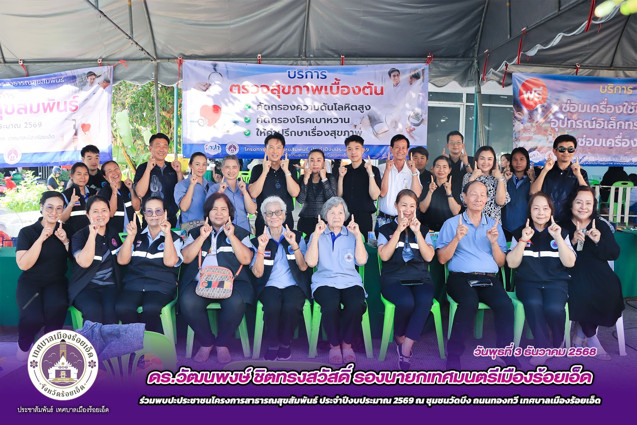 วันพุธที่ 3 ธันวาคม 2568 เวลา 14.00 น. ดร.วัฒนพงษ์ ชิตทรงสวัสดิ์ รองนายกเทศมนตรีเมืองร้อยเอ็ด พร้อมด้วย นายสมเกียรติ กาญจนหงษ์ รองประธานสภาเทศบาล, สมาชิกสภาเทศบาล, รองปลัดเทศบาล, หัวหน้าส่วนการบริหาร, หัวหน้าฝ่าย, หัวหน้างาน, คณะกรรมการชุมชน, อสม. และเจ้าหน้าที่ผู้เกี่ยวข้อง ร่วมพบปะประชาชนโครงการสาธารณสุขสัมพันธ์ ประจำปีงบประมาณ 2569 โดยจัดกิจกรรมให้ครอบคลุมพื้นที่ในเขตเทศบาลเมืองร้อยเอ็ด ซึ่งให้บริการในด้านสาธารณสุข, การตรวจรักษาโรคเบื้องต้น, การวางแผนคุมกำเนิด, ตรวจภาวะโภชนาการ, รณรงค์การใช้ทรายอะเบทกำจัดลูกน้ำยุงลาย, รณรงค์การวางยาเบื่อหนูซึ่งเป็นพาหะนำโรค, บริการนวดคลายเครียดเพื่อสุขภาพ, บริการตัดผมชาย-หญิง และบริการซ่อมเครื่องใช้ไฟฟ้าและอิเล็กทรอนิกส์ ณ ชุมชนวัดบึง ถนนทองทวี เทศบาลเมืองร้อยเอ็ด