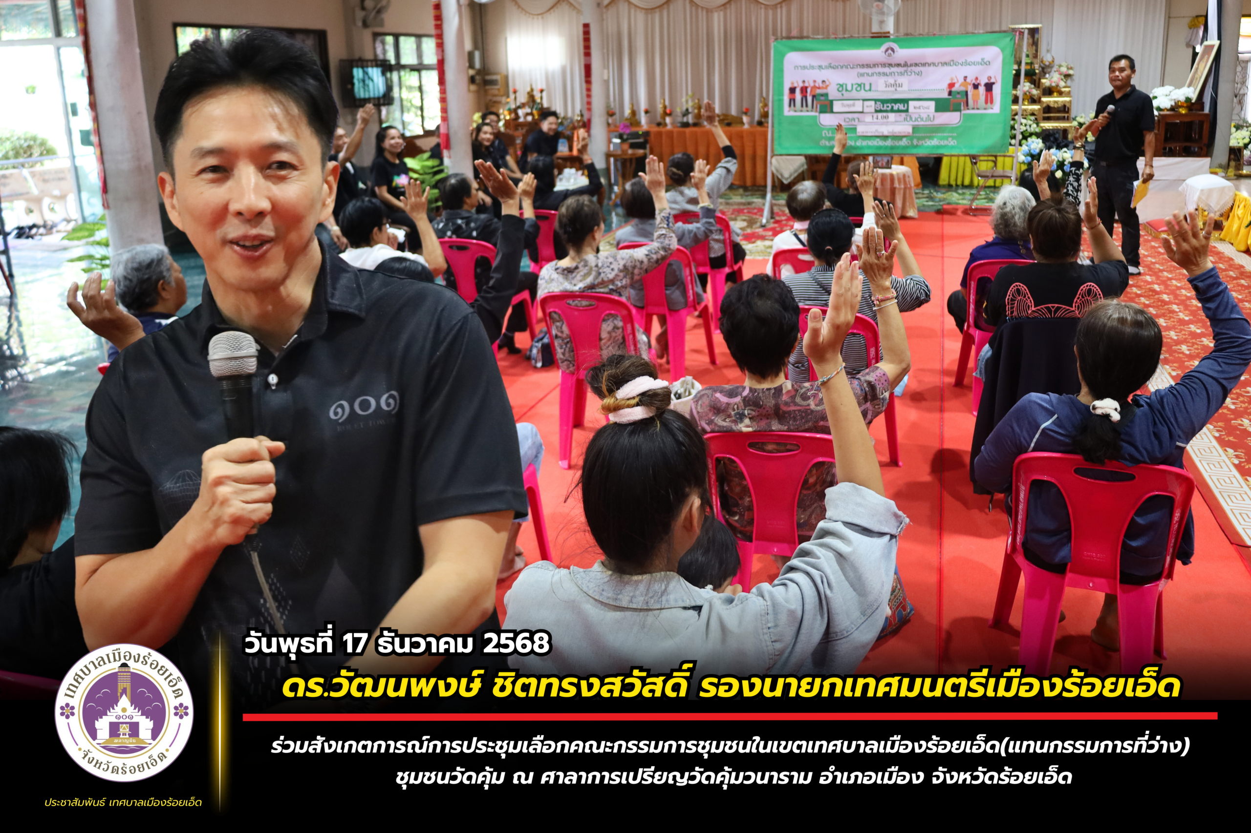 วันพุธที่ 17 ธันวาคม 2568 เวลา 14.00 น. ดร.วัฒนพงษ์ ชิตทรงสวัสดิ์ รองนายกเทศมนตรีเมืองร้อยเอ็ด พร้อมด้วย สมาชิกสภาเทศบาล, รองปลัดเทศบาล, หัวหน้าส่วนการบริหาร, หัวหน้าฝ่าย, หัวหน้างาน และเจ้าหน้าที่ผู้เกี่ยวข้อง ร่วมสังเกตการณ์การประชุมเลือกคณะกรรมการชุมชนในเขตเทศบาลเมืองร้อยเอ็ด (แทนกรรมการที่ว่าง) ชุมชนวัดคุ้ม ณ ศาลาการเปรียญวัดคุ้มวนาราม อำเภอเมือง จังหวัดร้อยเอ็ด