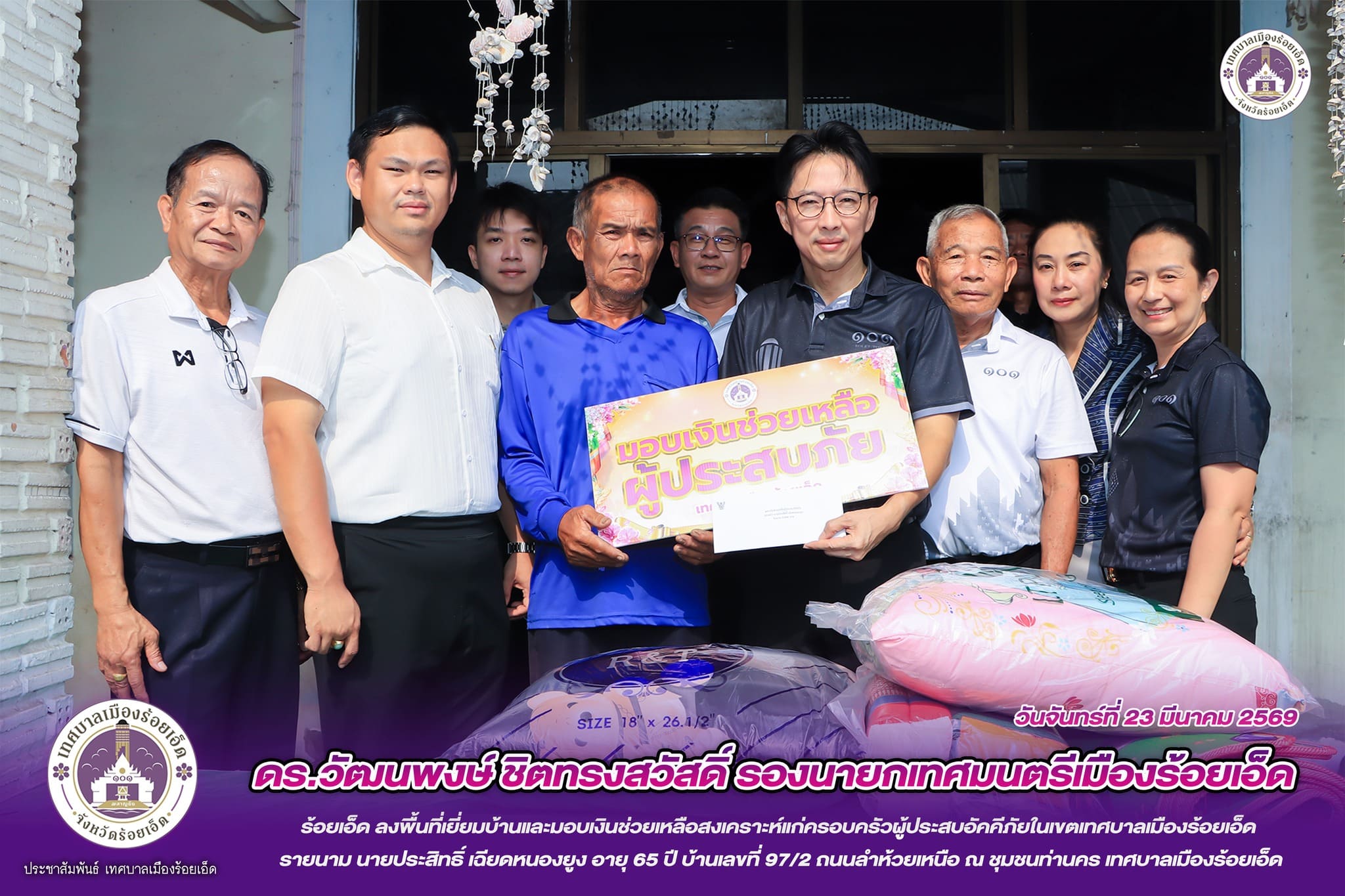 วันจันทร์ที่ 23 มีนาคม 2569 เวลา 09.00 น. เทศบาลเมืองร้อยเอ็ด นำโดย ดร.วัฒนพงษ์ ชิตทรงสวัสดิ์ รองนายกเทศมนตรีเมืองร้อยเอ็ด พร้อมด้วย สมาชิกสภาเทศบาล, หัวหน้าส่วนการบริหาร หัวหน้างาน, ประธานชุมชน, อสม. และเจ้าหน้าที่กองสวัสดิการสังคม เทศบาลเมืองร้อยเอ็ด ลงพื้นที่เยี่ยมบ้านและมอบเงินช่วยเหลือสงเคราะห์แก่ครอบครัวผู้ประสบอัคคีภัยในเขตเทศบาลเมืองร้อยเอ็ด เพื่อบรรเทาความเดือดร้อนเบื้องต้น เสริมสร้างขวัญกำลังใจ และนำถุงยังชีพ เครื่องอุปโภคบริโภคไปมอบให้แก่ผู้ที่ได้รับผลกระทบจากเหตุเพลิงไหม้ รายนาม นายประสิทธิ์ เฉียดหนองยูง อายุ 65 ปี บ้านเลขที่ 97/2 ถนนลำห้วยเหนือ ต.ในเมือง อ.เมือง จ.ร้อยเอ็ด ณ ชุมชนท่านคร เทศบาลเมืองร้อยเอ็ด