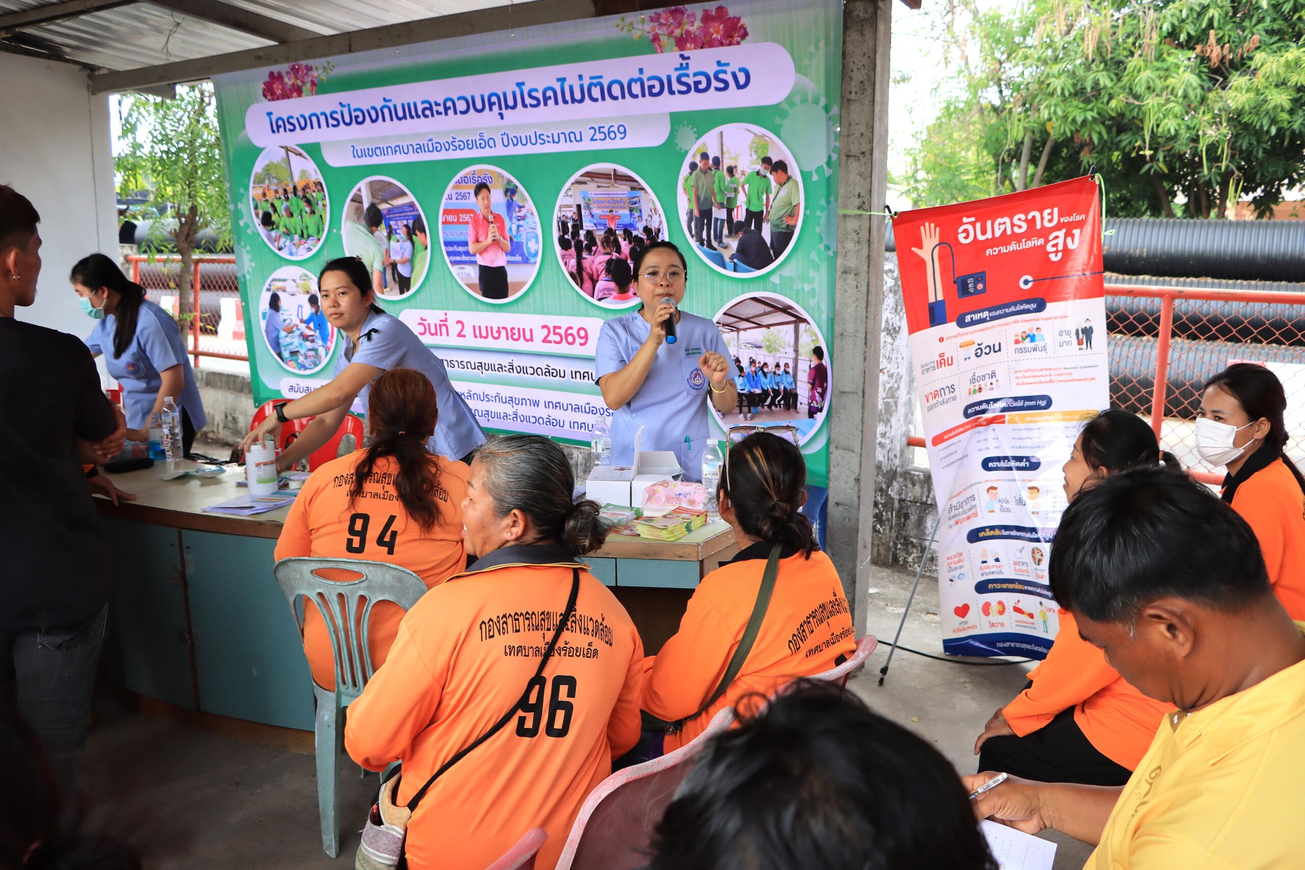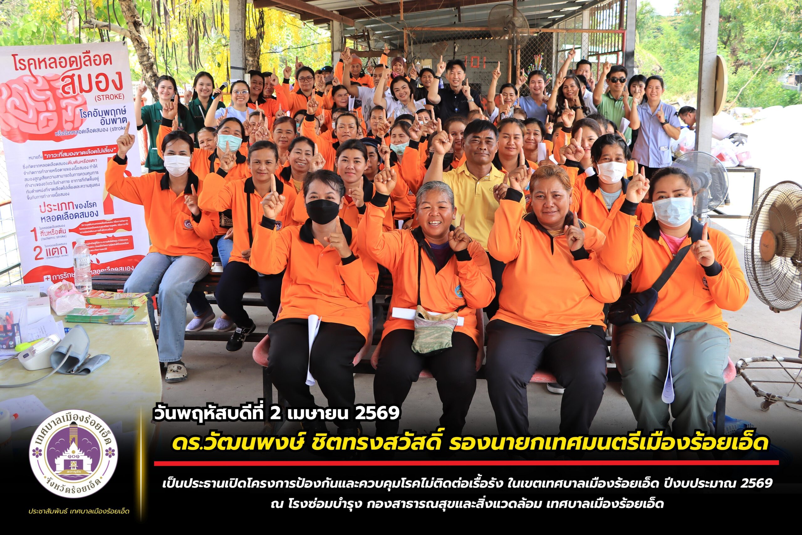 วันพฤหัสบดีที่ 2 เมษายน 2569 เวลา 13.00 น. ดร.วัฒนพงษ์ ชิตทรงสวัสดิ์ รองนายกเทศมนตรีเมืองร้อยเอ็ด เป็นประธานเปิดโครงการป้องกันและควบคุมโรคไม่ติดต่อเรื้อรัง ในเขตเทศบาลเมืองร้อยเอ็ด ปีงบประมาณ 2569 โดยมี นางสาวกรชนก ยุคะลัง รองปลัดเทศบาล หัวหน้าส่วนการบริหาร หัวหน้าฝ่าย หัวหน้างาน และเจ้าหน้าที่กองสาธารณสุขและสิ่งแวดล้อม เทศบาลเมืองร้อยเอ็ดผู้เกี่ยวข้อง เข้าร่วมโครงการฯ ในครั้งนี้ ซึ่งกิจกรรมประกอบไปด้วย การตรวจคัดกรองภาวะสุขภาพ รวมถึงให้ความรู้เกี่ยวกับโรค การแปลผลตรวจ วิธีการปรับเปลี่ยนพฤติกรรมในการดำเนินชีวิต ณ โรงซ่อมบำรุง กองสาธารณสุขและสิ่งแวดล้อม เทศบาลเมืองร้อยเอ็ด