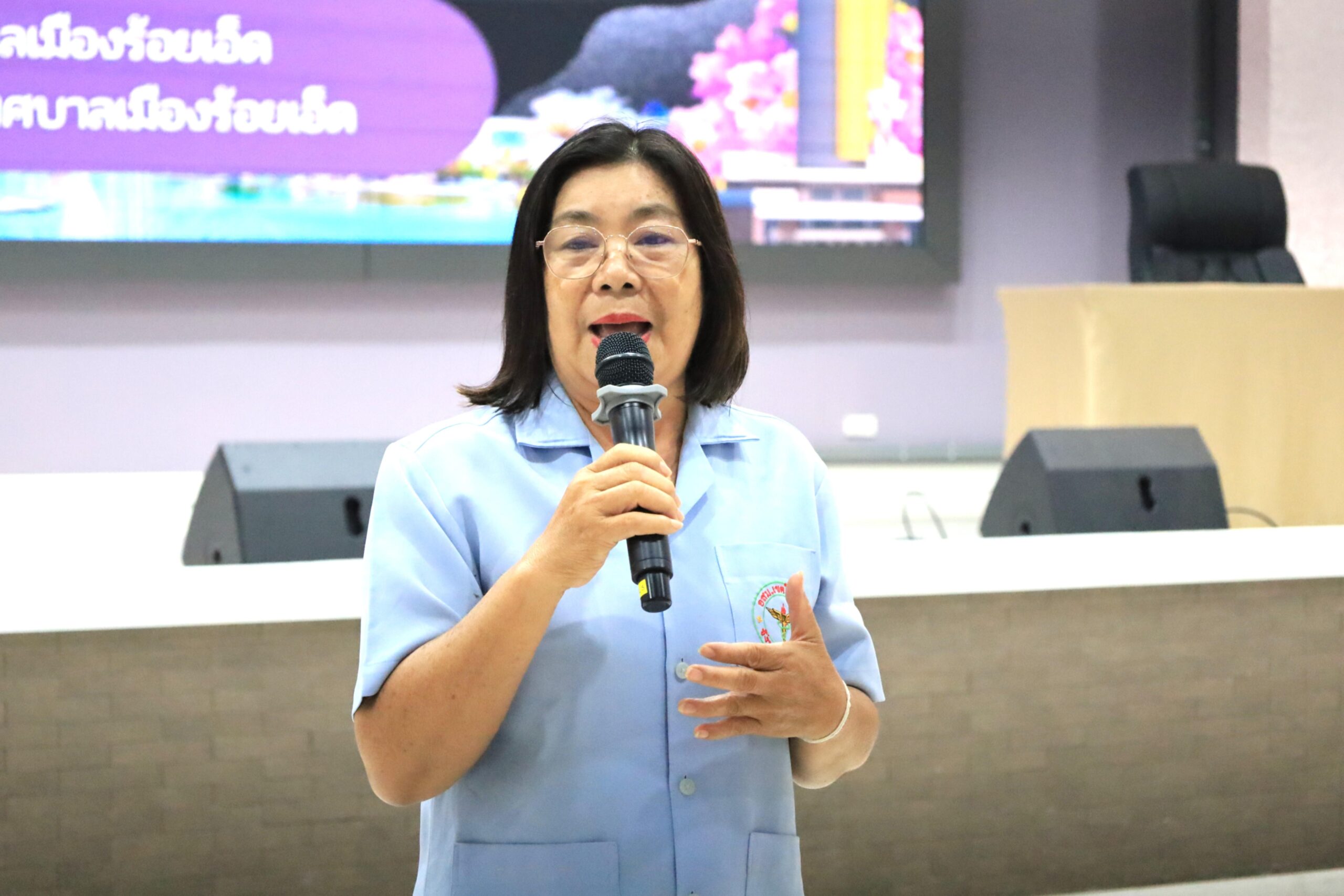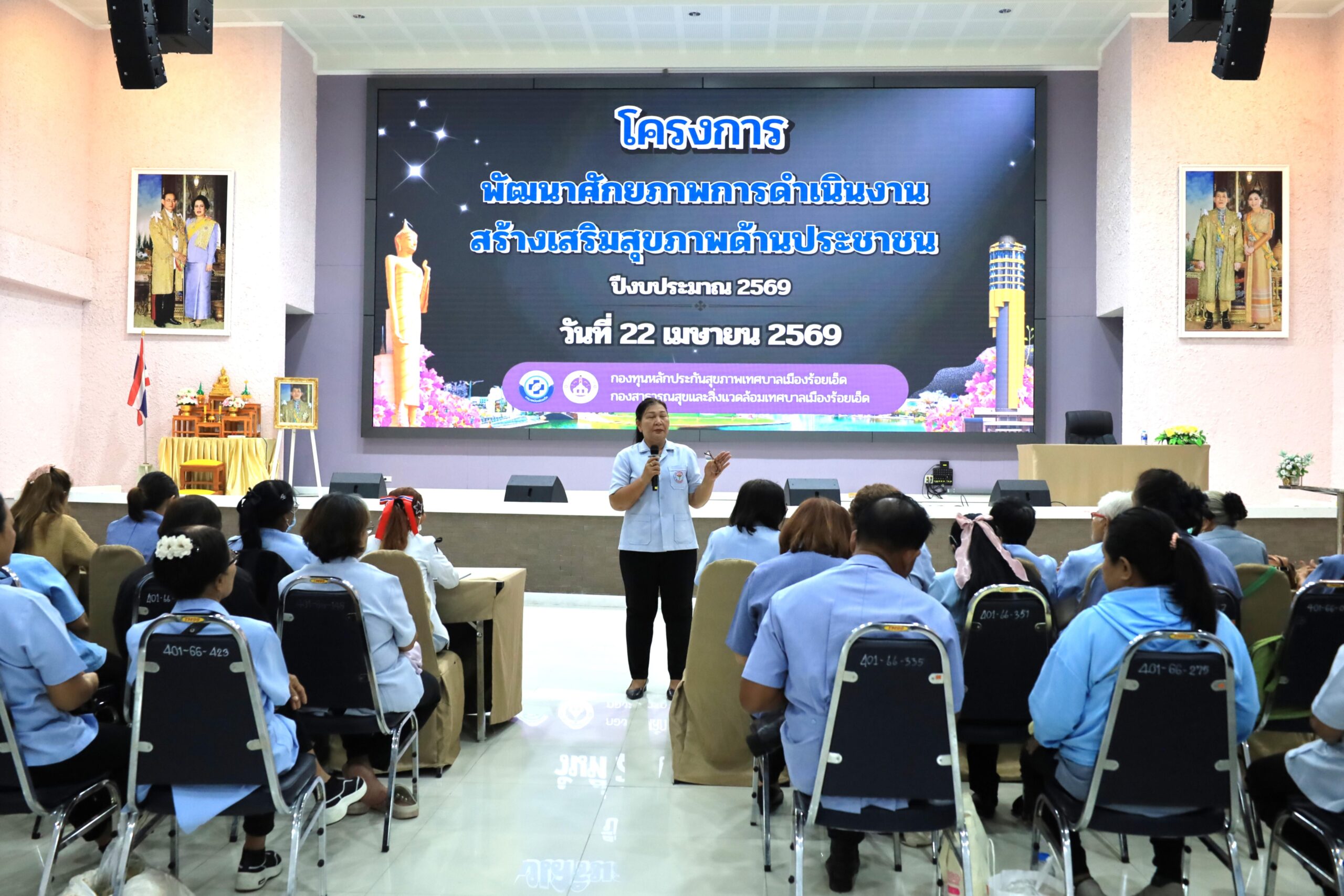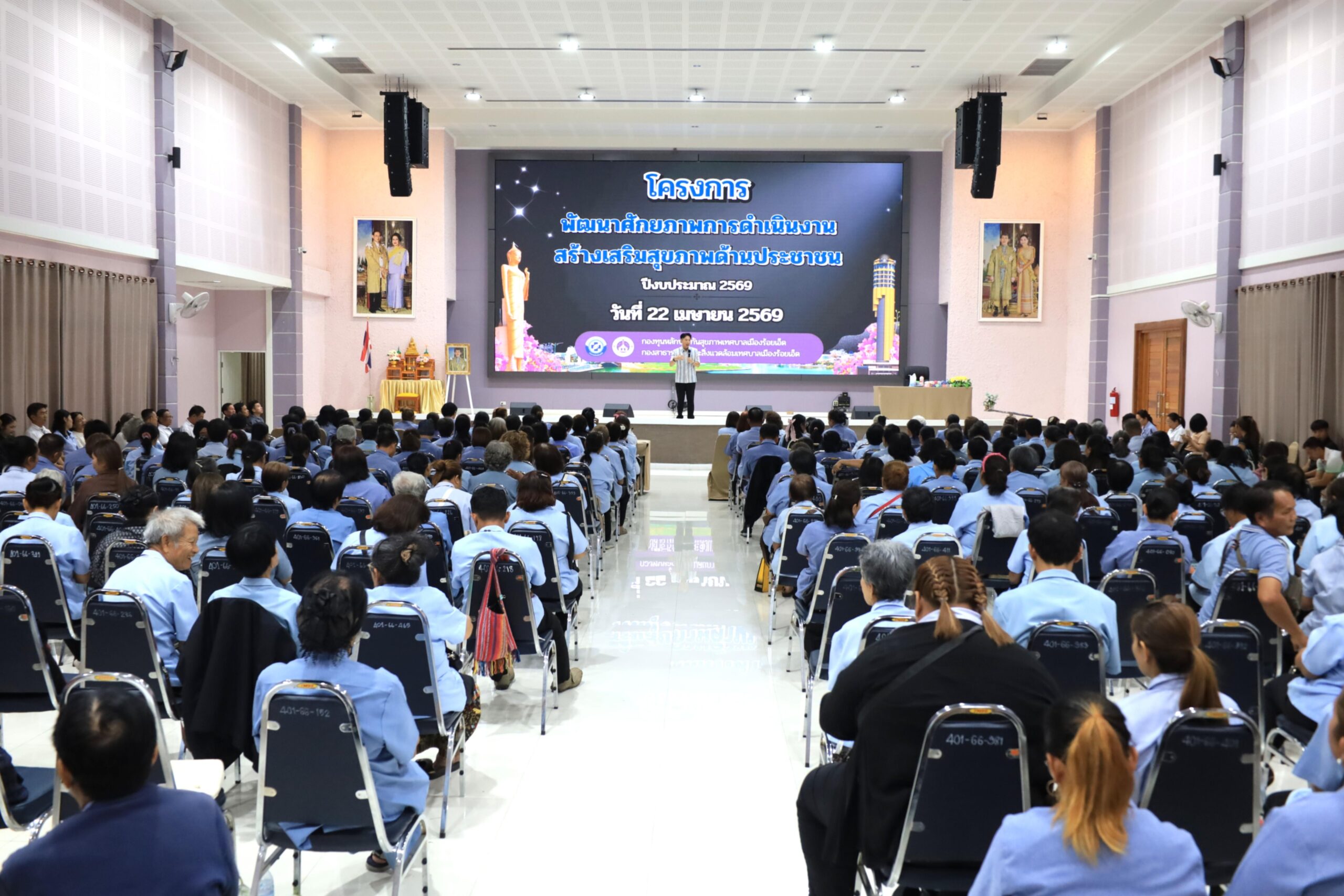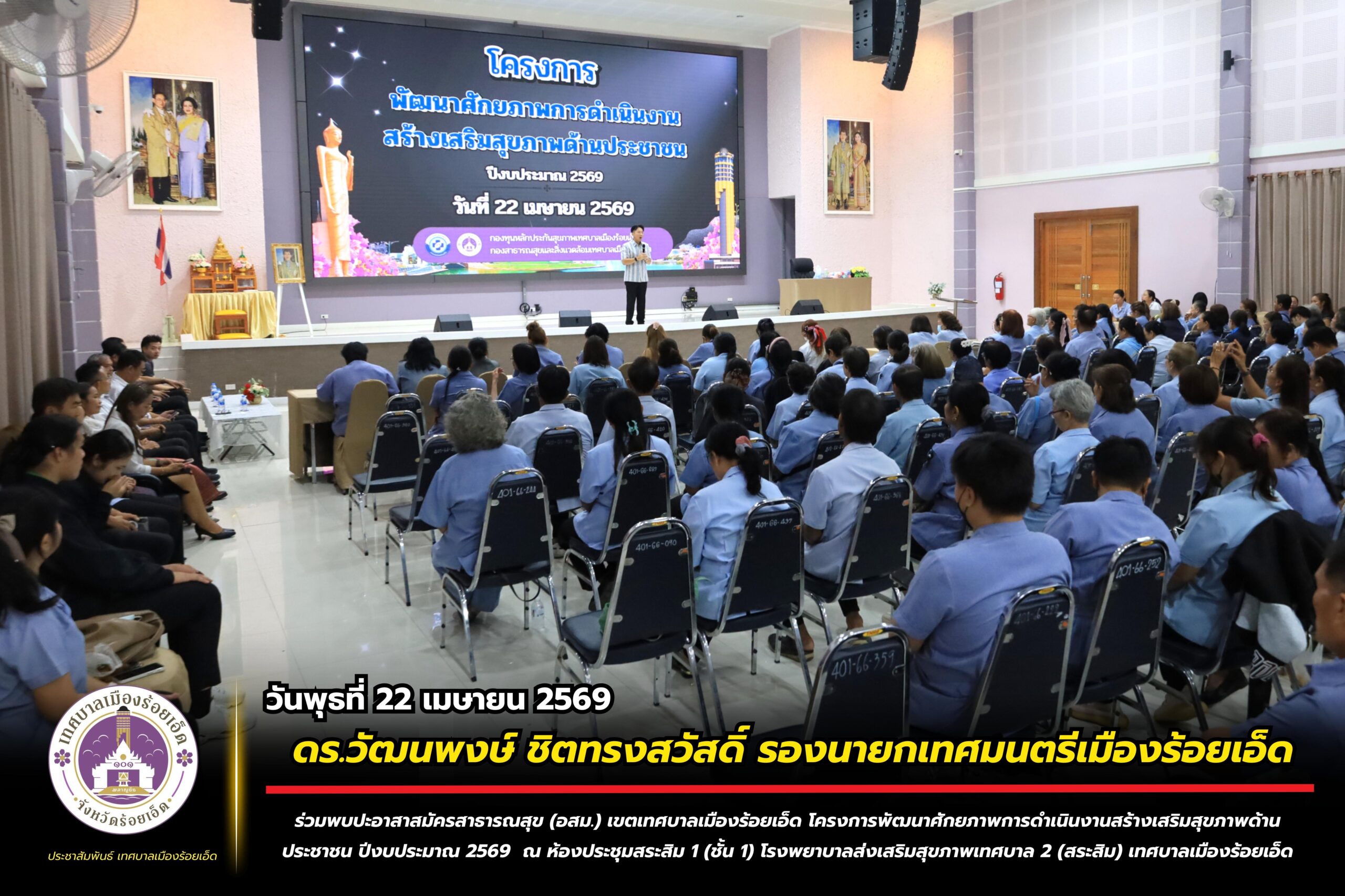 วันพุธที่ 22 เมษายน 2569 เวลา 09.30 น. ดร.วัฒนพงษ์ ชิตทรงสวัสดิ์ รองนายกเทศมนตรีเมืองร้อยเอ็ด พร้อมด้วย นายสมเกียรติ กาญจนหงษ์ รองประธานสภาเทศบาล สมาชิกสภาเทศบาล รองปลัดเทศบาล หัวหน้าส่วนการบริหาร หัวหน้าฝ่าย หัวหน้างาน ภาคีเครือข่ายสุขภาพ และเจ้าหน้าที่ผู้เกี่ยวข้อง ร่วมพบปะอาสาสมัครสาธารณสุข (อสม.) เขตเทศบาลเมืองร้อยเอ็ด โครงการพัฒนาศักยภาพการดำเนินงานสร้างเสริมสุขภาพด้านประชาชน ปีงบประมาณ 2569 โดยมีคณะวิทยากรจากสำนักงานสาธารณสุขอำเภอศรีสมเด็จ จังหวัดร้อยเอ็ด เป็นผู้บรรยายให้ความรู้ ณ ห้องประชุมสระสิม 1 (ชั้น 1) โรงพยาบาลส่งเสริมสุขภาพเทศบาล 2 (สระสิม) เทศบาลเมืองร้อยเอ็ด