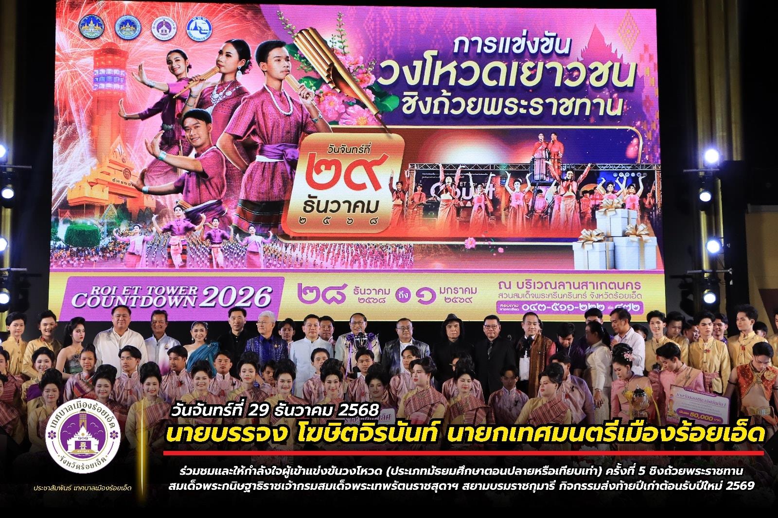 นายกเทศมนตรีเมืองร้อยเอ็ด ร่วมชมและให้กำลังใจผู้เข้าแข่งขันวงโหวด (ประเภทมัธยมศึกษาตอนปลายหรือเทียบเท่า) ครั้งที่ 5 ชิงถ้วยพระราชทาน สมเด็จพระกนิษฐาธิราชเจ้า กรมสมเด็จพระเทพรัตนราชสุดาฯ สยามบรมราชกุมารี กิจกรรมส่งท้ายปีเก่าต้อนรับปีใหม่ 2569