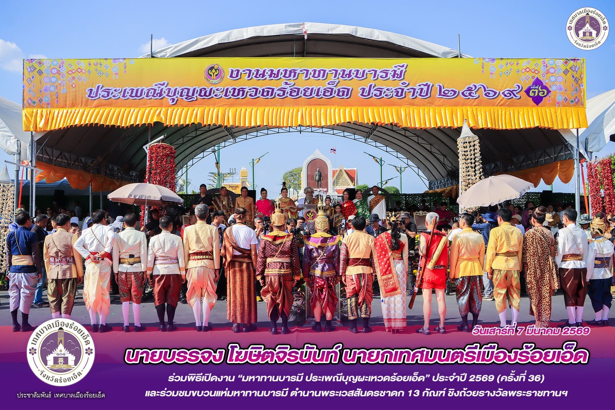 วันเสาร์ที่ 7 มีนาคม 2569 เวลา 15.30 น. เทศบาลเมืองร้อยเอ็ด นำโดย นายบรรจง โฆษิตจิรนันท์ นายกเทศมนตรีเมืองร้อยเอ็ด พร้อมด้วย คณะผู้บริหารเทศบาล, ประธานสภาเทศบาล, สมาชิกสภาเทศบาล, ปลัดเทศบาล, หัวหน้าส่วนการบริหาร, คณะผู้บริหารสถานศึกษา, หัวหน้าฝ่าย, หัวหน้างาน, คณะครู และพนักงานในสังกัดเทศบาลเมืองร้อยเอ็ด ร่วมพิธีเปิดงาน “มหาทานบารมี ประเพณีบุญผะเหวดร้อยเอ็ด” ประจำปี 2569 (ครั้งที่ 36) และร่วมชมขบวนแห่มหาทานบารมี ตำนานพระเวสสันดรชาดก 13 กัณฑ์ จากทุกภาคส่วนและอำเภอทุกอำเภอ ชิงถ้วยรางวัลพระราชทานพระบาทสมเด็จพระเจ้าอยู่หัว และสมเด็จพระนางเจ้าพระบรมราชินี โดยมี นายชัชวาลย์ เบญจสิริวงศ์ ผู้ว่าราชการจังหวัดร้อยเอ็ด เป็นประธานในพิธีฯ ซึ่งมี สมาชิกสภาผู้แทนราษฎรจังหวัดร้อยเอ็ด, ผู้ตรวจราชการกระทรวงวัฒนธรรม, รองผู้ว่าราชการจังหวัดร้อยเอ็ด, นายกองค์การบริหารส่วนจังหวัดร้อยเอ็ด, หัวหน้าส่วนราชการ, หน่วยงานภาครัฐและภาคเอกชน และประชาชนชาวจังหวัดร้อยเอ็ดและจังหวัดใกล้เคียงเข้าร่วมพิธี ฯ ในครั้งนี้ ณ บริเวณลานสาเกตนคร สวนสมเด็จพระศรีนครินทร์ร้อยเอ็ด อำเภอเมือง จังหวัดร้อยเอ็ด