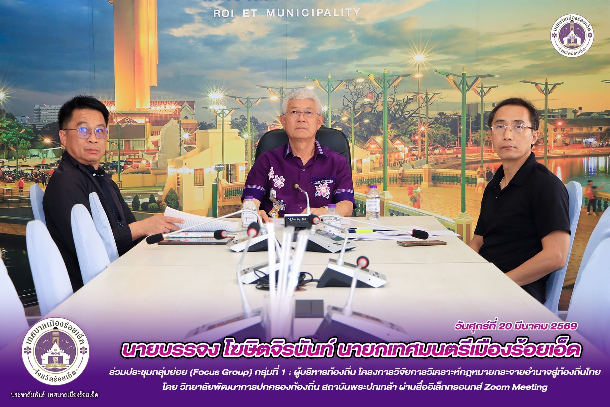 วันศุกร์ที่ 20 มีนาคม 2569 เวลา 13.30 น. นายบรรจง โฆษิตจิรนันท์ นายกเทศมนตรีเมืองร้อยเอ็ด พร้อมด้วย นายสถิตย์ ศรีสงคราม ปลัดเทศบาลเมืองร้อยเอ็ด และนายปรัชญา สุทธิพิริยะหทัย หัวหน้างานนิติกรรมสัญญา ร่วมประชุมกลุ่มย่อย (Focus Group) กลุ่มที่ 1 : ผู้บริหารท้องถิ่น โครงการวิจัยการวิเคราะห์กฎหมายกระจายอำนาจสู่ท้องถิ่นไทย เพื่อระดมและรับฟังความคิดเห็นจากกลุ่มผู้ทรงคุณวุฒิที่เกี่ยวข้องกับงานวิจัยฯ โดย วิทยาลัยพัฒนาการปกครองท้องถิ่น สถาบันพระปกเกล้า ผ่านสื่ออิเล็กทรอนกส์ Zoom Meeting ณ ห้องประชุมปัทมานนท์ Smart Room ชั้น 2 สำนักงานเทศบาลเมืองร้อยเอ็ด