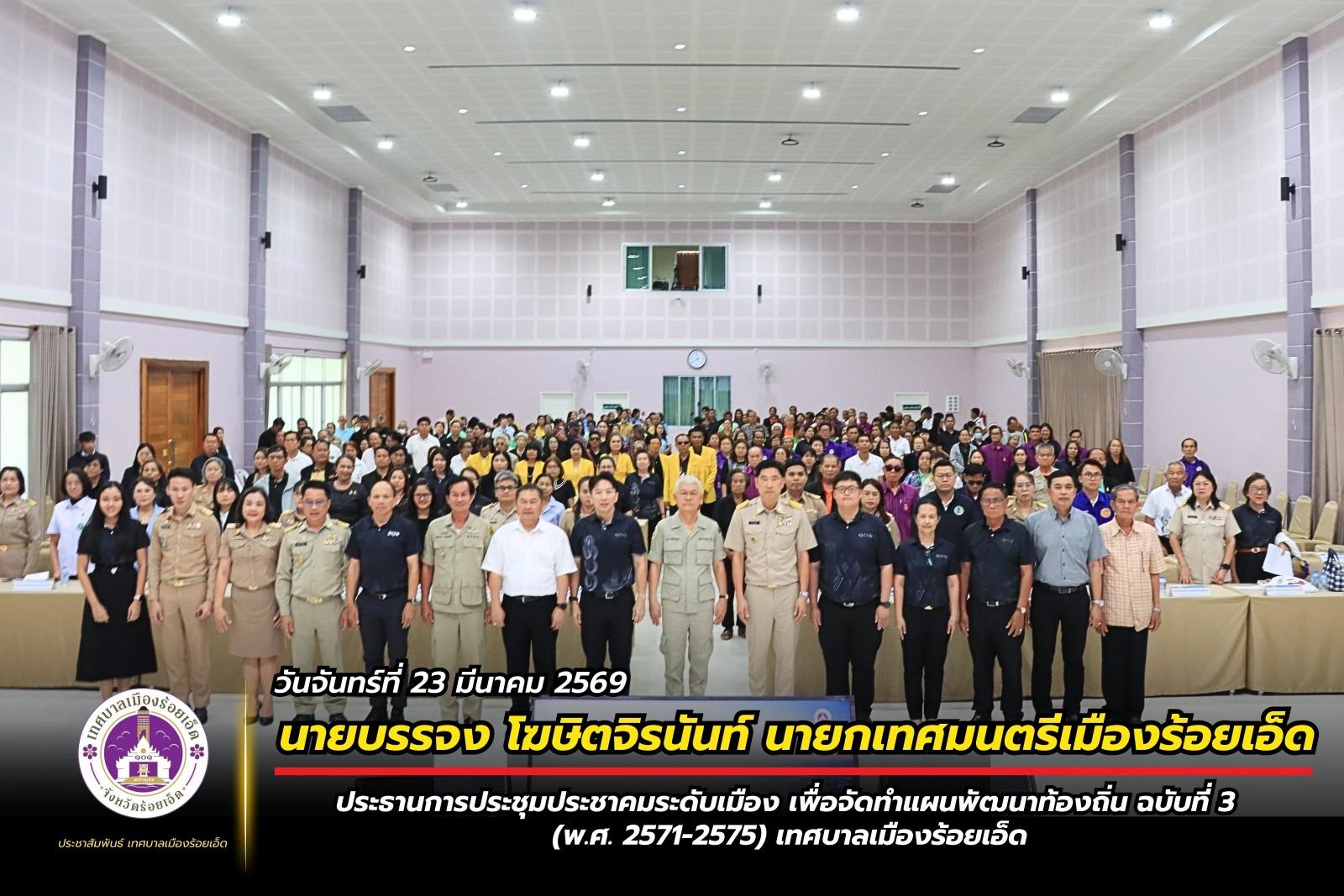 วันจันทร์ที่ 23 มีนาคม 2569 เวลา 09.30 น. นายบรรจง โฆษิตจิรนันท์ นายกเทศมนตรีเมืองร้อยเอ็ด เป็นประธานการประชุมประชาคมระดับเมือง เพื่อจัดทำแผนพัฒนาท้องถิ่น ฉบับที่ 3 (พ.ศ. 2571-2575) เทศบาลเมืองร้อยเอ็ด โดยมีคณะผู้บริหารเทศบาล ประธานสภาเทศบาล รองประธานสภาเทศบาล สมาชิกสภาเทศบาล หัวหน้าส่วนราชการ ผู้แทนรัฐวิสาหกิจ หัวหน้าส่วนการบริหาร ผู้บริหารสถานศึกษา ผู้นำชุมชน และพนักงานสังกัดเทศบาลเมืองร้อยเอ็ด เข้าร่วมประชุมฯ เพื่อให้ทุกภาคส่วนมีส่วนร่วมในการแสดงความคิดเห็น เพื่อนำไปสู่การพัฒนาท้องถิ่นให้เกิดความต่อเนื่องตามสถานการณ์ปัจจุบัน แก้ไขปัญหาความเดือดร้อนของประชาชน เอกชน ส่วนราชการ และรัฐวิสาหกิจที่เกี่ยวข้อง ณ ห้องประชุมสระสิม 1 (ชั้น 1) โรงพยาบาลส่งเสริมสุขภาพเทศบาล 2 (สระสิม) เทศบาลเมืองร้อยเอ็ด