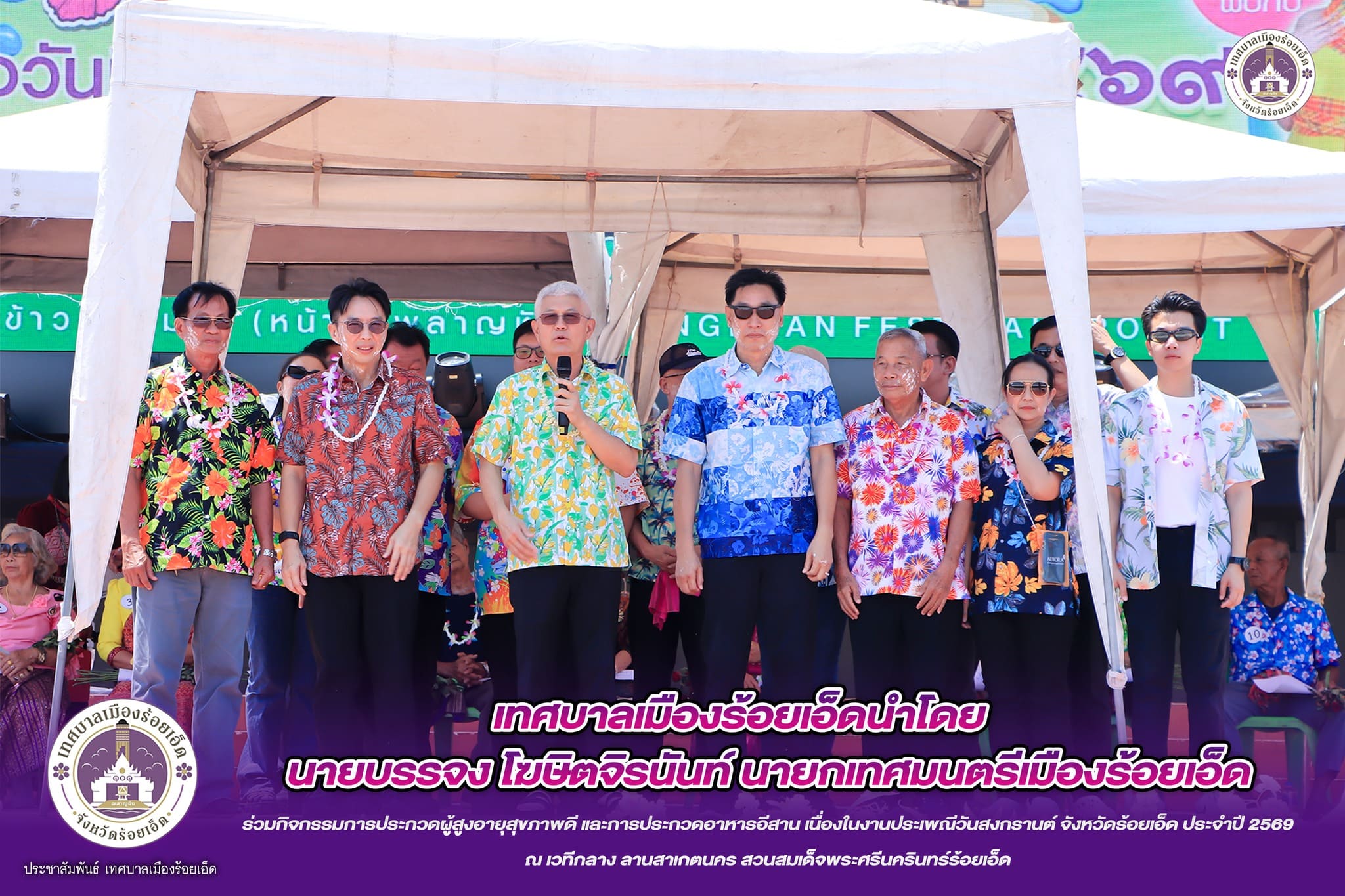 วันจันทร์ที่ 13 เมษายน 2569 เวลา 08.00 น. เทศบาลเมืองร้อยเอ็ดนำโดย นายบรรจง โฆษิตจิรนันท์ นายกเทศมนตรีเมืองร้อยเอ็ด พร้อมด้วย คณะผู้บริหารเทศบาลเมืองร้อยเอ็ด, สมาชิกสภาเทศบาลเมืองร้อยเอ็ด, ปลัดเทศบาลเมืองร้อยเอ็ด, รองปลัดเทศบาลเมืองร้อยเอ็ด, หัวหน้าส่วนการบริหาร, หัวหน้าฝ่าย, หัวหน้างาน และพนักงานสังกัดเทศบาลเมืองร้อยเอ็ด ร่วมกิจกรรมการประกวดผู้สูงอายุสุขภาพดี และการประกวดอาหารอีสาน เนื่องในงานประเพณีวันสงกรานต์ จังหวัดร้อยเอ็ด ประจำปี 2569 ซึ่งผลการประกวดผู้สูงอายุสุขภาพดี ชุมชนชนะเลิศการประกวด ได้แก่ ชุมชนโรงเรียนเมือง, รองชนะเลิศอันดับ 1 ได้แก่ ชุมชนวัดบึง, รางวัลรองชนะเลิศอันดับ 2 ได้แก่ ชุมชนโรงพยาบาล และ รางวัลขวัญใจประชาชน ได้แก่ ชุมชนท่านคร และการประกวดอาหารอีสาน รางวัลชนะเลิศ ได้แก่ ชุมชนวัดบึง, รางวัลรองชนะเลิศอันดับ 1 ได้แก่ ชุมชนเหนือ และรางวัลรองชนะเลิศอันดับ 2 ได้แก่ ชุมชนบขส. โดยมี นายพีรพงศ์ จุรีมาศ สมาชิกสภาองค์การบริหารส่วนจังหวัดร้อยเอ็ด ร่วมกิจกรรมในครั้งนี้ พร้อมทั้งร่วมรดน้ำขอพรผู้สูงอายุ ณ เวทีกลาง ลานสาเกตนคร สวนสมเด็จพระศรีนครินทร์ร้อยเอ็ด