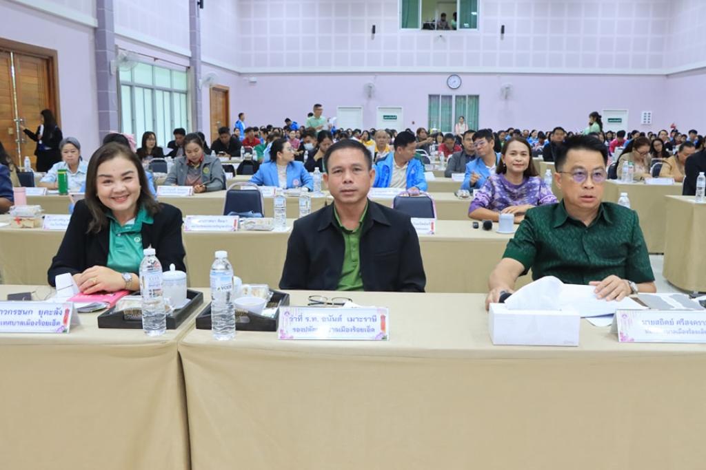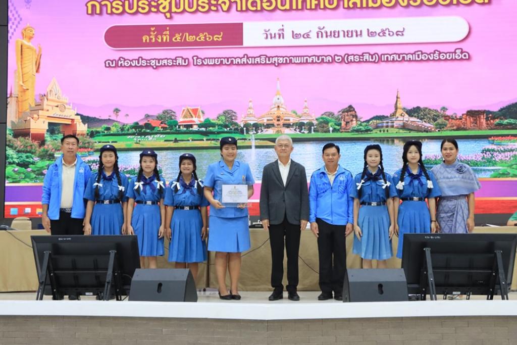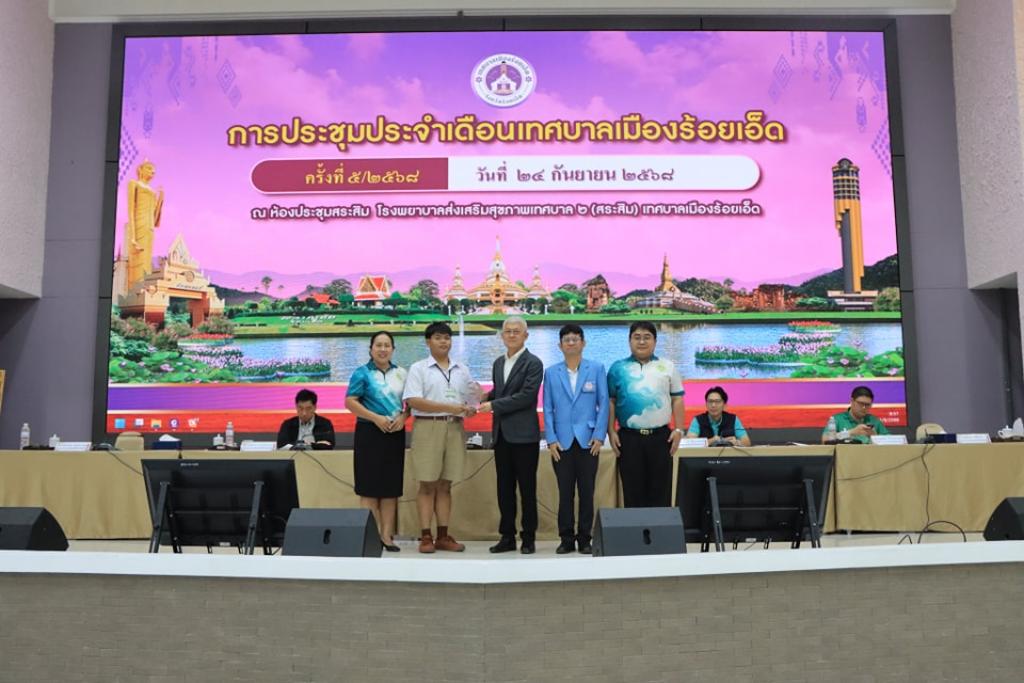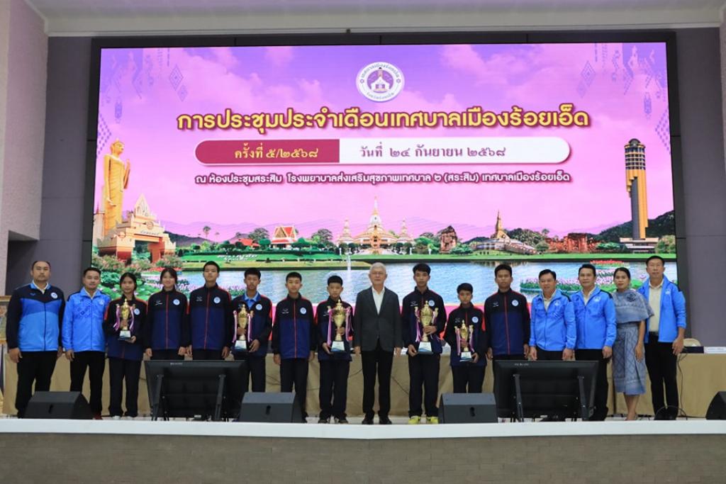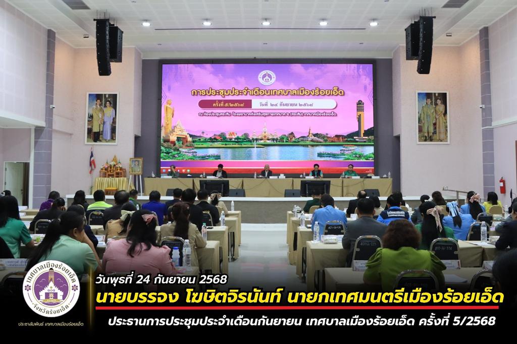 วันพุธที่ 24 กันยายน 2568 เวลา 08.30 น. เทศบาลเมืองร้อยเอ็ด เปิดประชุมประจำเดือนกันยายน ครั้งที่ 5/2568 โดยมี นายบรรจง โฆษิตจิรนันท์ นายกเทศมนตรีเมืองร้อยเอ็ด เป็นประธานในการประชุม และร่วมบันทึกภาพพร้อมแสดงความยินดีกับนักเรียนและบุคลากรในสังกัดเทศบาลเมืองร้อยเอ็ด ที่สร้างชื่อเสียงให้กับโรงเรียนและองค์กร ซึ่งมีคณะผู้บริหารเทศบาล หัวหน้าส่วนการบริหาร ผู้บริหารสถานศึกษา หัวหน้าฝ่าย หัวหน้างาน และพนักงานสังกัดเทศบาลเมืองร้อยเอ็ด ร่วมรายงานผลการดำเนินงานในรอบเดือนที่ผ่านมา และรับฟังนโยบายการทำงานจากผู้บริหารเทศบาลเมืองร้อยเอ็ด ณ ห้องประชุมสระสิม 1 (ชั้น 1) โรงพยาบาลส่งเสริมสุขภาพเทศบาล 2 เทศบาลเมืองร้อยเอ็ด