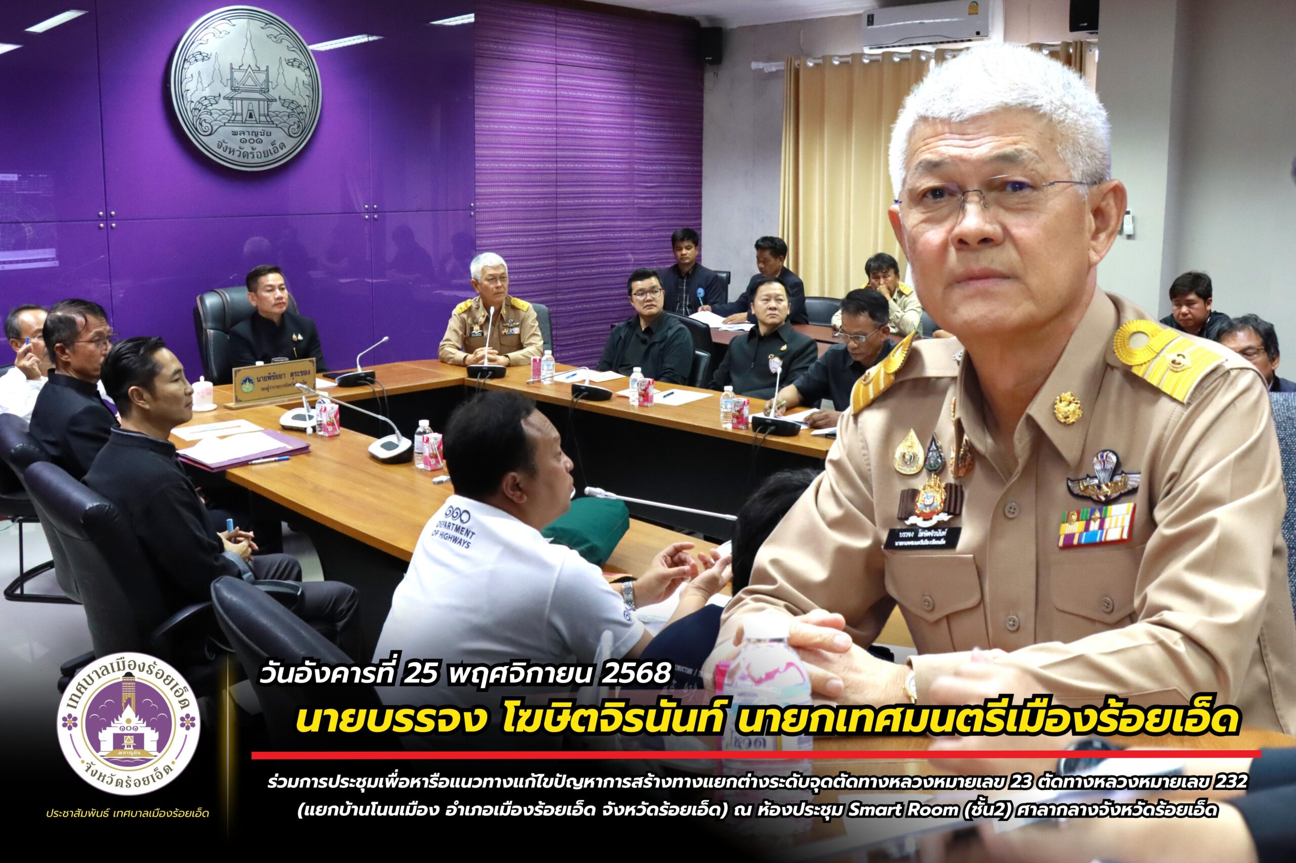 วันอังคารที่ 25 พฤศจิกายน 2568 เวลา 15.00 น. นายบรรจง โฆษิตจิรนันท์ นายกเทศมนตรีเมืองร้อยเอ็ด พร้อมด้วย นายพัฒนพงศ์ ศรีทอง ผู้อำนวยการกองช่าง, นายสันติ ทวีแสง หัวหน้าฝ่ายควบคุมอาคารและผังเมือง ร่วมการประชุมเพื่อหารือแนวทางแก้ไขปัญหาการสร้างทางแยกต่างระดับจุดตัดทางหลวงหมายเลข 23 ตัดทางหลวงหมายเลข 232 (แยกบ้านโนนเมือง อำเภอเมืองร้อยเอ็ด จังหวัดร้อยเอ็ด) ซึ่งมีสำนักก่อสร้างสะพาน กรมทางหลวง และกระทรวงคมนาคม เป็นผู้รับผิดชอบโครงการ โดยมี นายพิชัยยา ตุระซอง รองผู้ว่าราชการจังหวัดร้อยเอ็ด ประประธานการประชุมฯ ในครั้งนี้ พร้อมด้วยหัวหน้าส่วนราชการ, ภาครัฐและเอกชน และหน่วยงานที่เกี่ยวข้อง ณ ห้องประชุม Smart Room (ชั้น2) ศาลากลางจังหวัดร้อยเอ็ด
