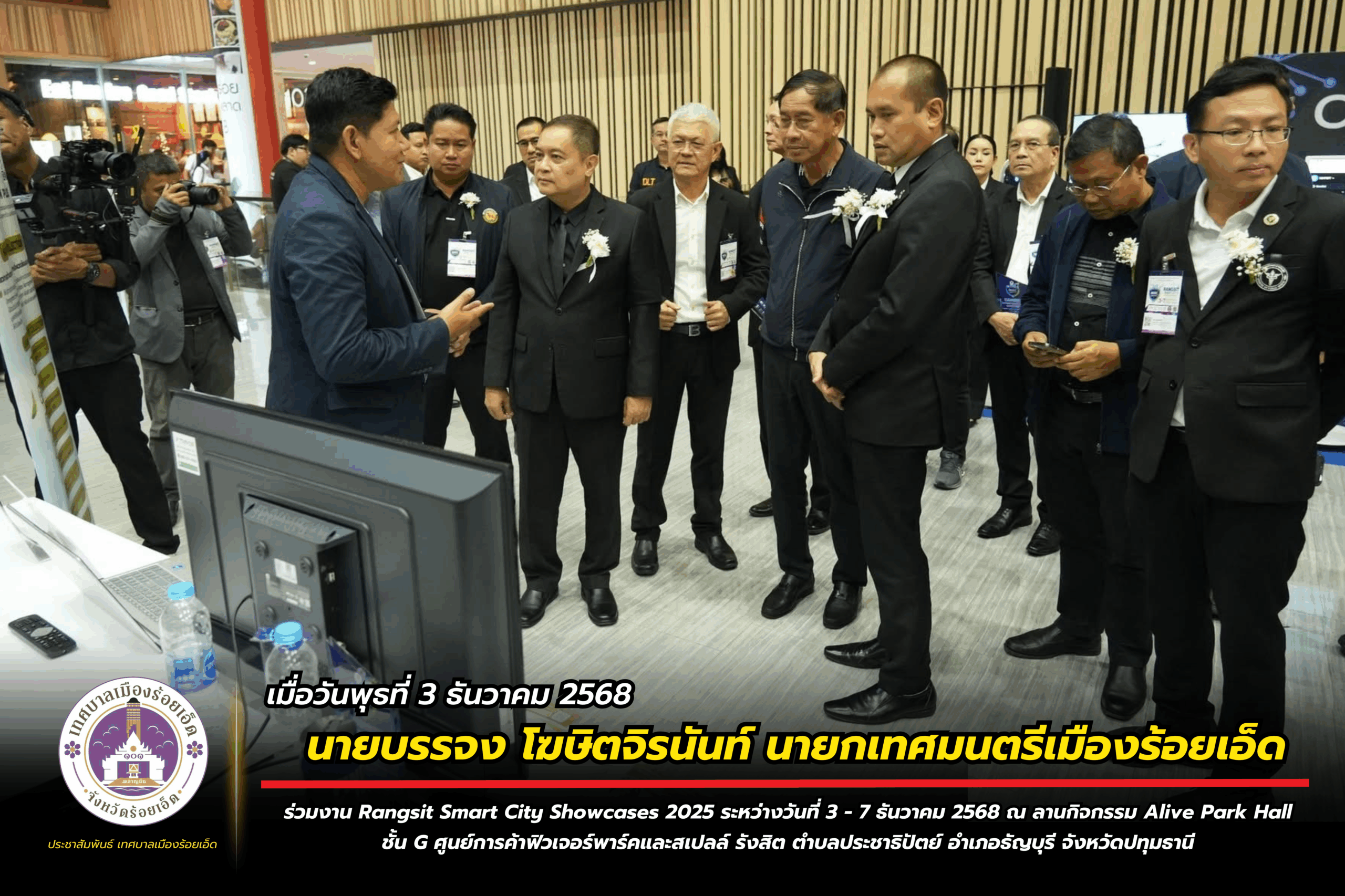 เมื่อวันพุธที่ 3 ธันวาคม 2568 เวลา 11.00 น. นายบรรจง โฆษิตจิรนันท์ นายกเทศมนตรีเมืองร้อยเอ็ด ร่วมงาน Rangsit Smart City Showcases 2025 ระหว่างวันที่ 3 – 7 ธันวาคม 2568 ภายในงาน พบกับการจัดแสดงนิทรรศการเกี่ยวกับผลงานของเทศบาลรังสิต และหน่วยงานส่วนราชการ ภาคเอกชน ที่นำรูปแบบเทคโนโลยีนวัตกรรมเพื่อเมืองอัจฉริยะจาก ผู้ประกอบการหลายด้าน พบโซลูชันเมืองอัจฉริยะที่มากกว่า เหมาะสมกับเมือง และฟังแนวคิดอนาคตเมืองอัจฉริยะที่เกิดคุณภาพชีวิตที่ดีอย่างยั่งยืน ณ ลานกิจกรรม Alive Park Hall ชั้น G ศูนย์การค้าฟิวเจอร์พาร์คและสเปลล์ รังสิต ตำบลประชาธิปัตย์ อำเภอธัญบุรี จังหวัดปทุมธานี