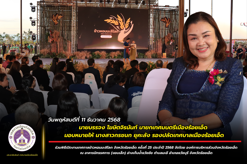 วันพฤหัสบดีที่ 11 ธันวาคม 2568 เวลา 16.30 น. นายบรรจง โฆษิตจิรนันท์ นายกเทศมนตรีเมืองร้อยเอ็ด มอบหมายให้ นางสาวกรชนก ยุคะลัง รองปลัดเทศบาลเมืองร้อยเอ็ด พร้อมด้วย นายอภิชาติ นรทีทาน หัวหน้าฝ่ายแผนงานและงบประมาณ รักษาราชการแทน ผู้อำนวยการกองยุทธศาสตร์และงบประมาณ ร่วมพิธีเปิดงานเทศกาลข้าวหอมมะลิโลก จังหวัดร้อยเอ็ด ครั้งที่ 25 ประจำปี 2568 จัดโดย องค์การบริหารส่วนจังหวัดร้อยเอ็ด ซึ่งเป็นเจ้าภาพหลักของการจัดงานในปีนี้ โดยมี นายชัชวาลย์ เบญจสิริวงศ์ ผู้ว่าราชการจังหวัดร้อยเอ็ด เป็นประธานในพิธี พร้อมด้วย รองผู้ว่าราชการจังหวัดร้อยเอ็ด, หัวหน้าส่วนราชการ, หน่วยงานภาครัฐและเอกชน และส่วนที่เกี่ยวข้องเข้าร่วมพิธีเปิดฯ ในครั้งนี้ ณ อาคารนิทรรศการ (งอบเล็ก) อ่างเก็บน้ำธวัชชัย ตำบลมะอึ อำเภอธวัชบุรี จังหวัดร้อยเอ็ด