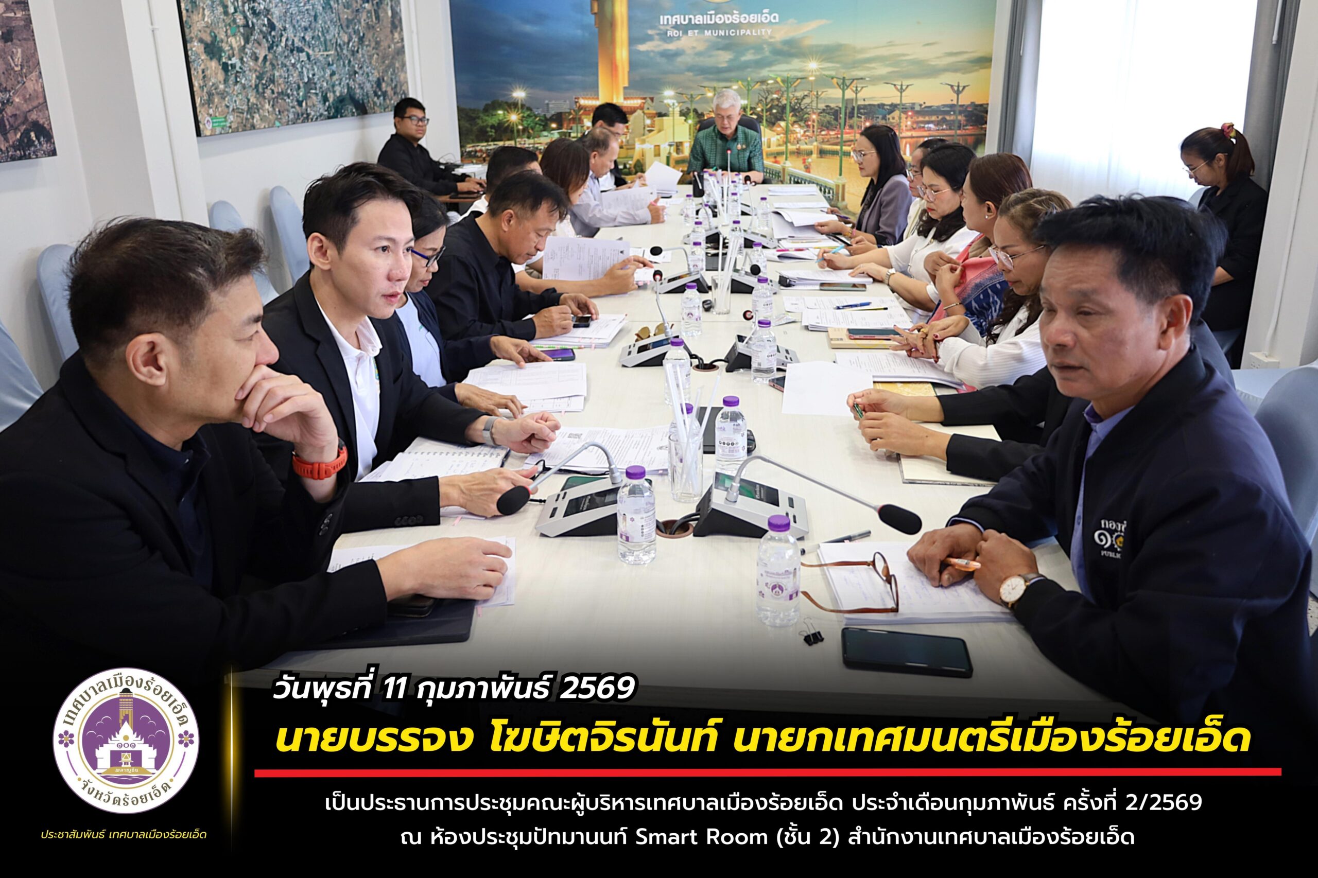 วันพุธที่ 11 กุมภาพันธ์ 2569 เวลา 10.00 น. เทศบาลเมืองร้อยเอ็ด นำโดย นายบรรจง โฆษิตจิรนันท์ นายกเทศมนตรีเมืองร้อยเอ็ด เป็นประธานการประชุมคณะผู้บริหารเทศบาลเมืองร้อยเอ็ด ประจำเดือนกุมภาพันธ์ ครั้งที่ 2/2569 โดยมี คณะผู้บริหารเทศบาล ปลัดเทศบาล รองปลัดเทศบาล หัวหน้าส่วนการบริหาร และเจ้าหน้าที่ผู้เกี่ยวข้อง ร่วมรายงานผลการดำเนินงานในรอบเดือนที่ผ่านมา และรับมอบนโยบายการทำงาน ณ ห้องประชุมปัทมานนท์ Smart Room (ชั้น 2) สำนักงานเทศบาลเมืองร้อยเอ็ด