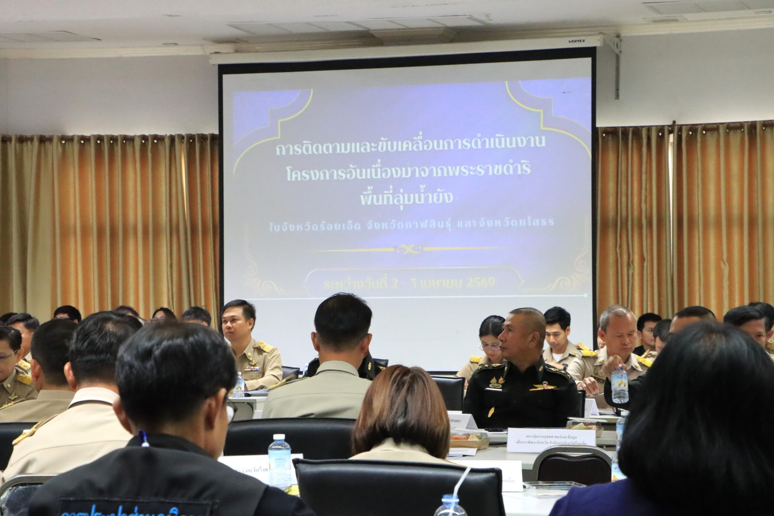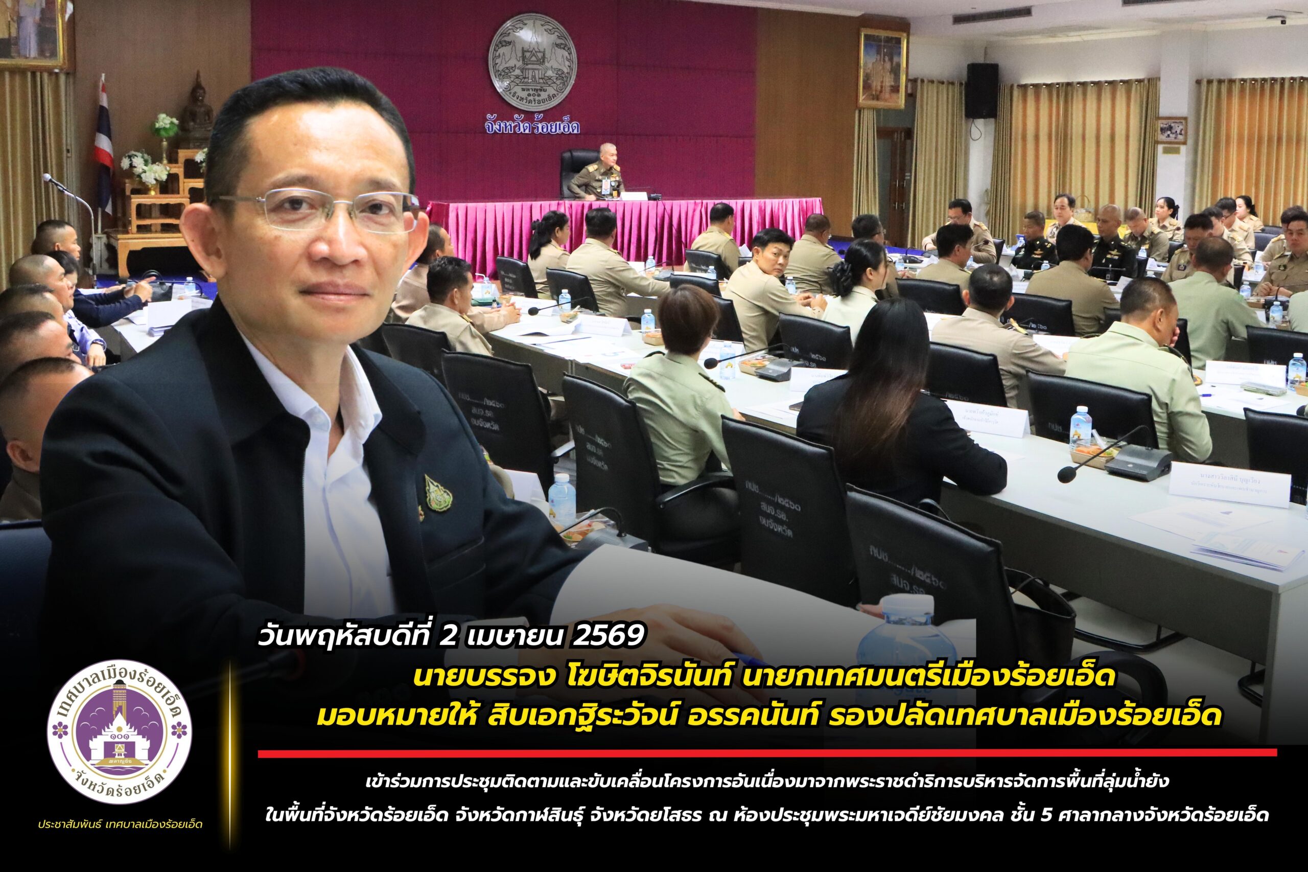 วันพฤหัสบดีที่ 2 เมษายน 2569 เวลา 09.30 น. นายบรรจง โฆษิตจิรนันท์ นายกเทศมนตรีเมืองร้อยเอ็ด มอบหมายให้ สิบเอกฐิระวัจน์ อรรคนันท์ รองปลัดเทศบาลเมืองร้อยเอ็ด เข้าร่วมการประชุมติดตามและขับเคลื่อนโครงการอันเนื่องมาจากพระราชดำริการบริหารจัดการพื้นที่ลุ่มน้ำยังในพื้นที่จังหวัดร้อยเอ็ด จังหวัดกาฬสินธุ์ และจังหวัดยโสธร โดยมี พลอากาศเอก จอม รุ่งสว่าง องคมนตรี รองประธานกรรมการติดตามและขับเคลื่อนโครงการอันเนื่องมาจากพระราชดำริ เป็นประธานการประชุม พร้อมด้วย นายชัชวาลย์ เบญจสิริวงศ์ ผู้ว่าราชการจังหวัดร้อยเอ็ด นายสุวรรธณ์ เข็มธนเพชร ผู้ว่าราชการจังหวัดกาฬสินธุ์ นายชาญชัย ศรศรีวิชัย ผู้ว่าราชการจังหวัดยโสธร ตลอดจนหัวหน้าส่วนราชการ ทหาร ตำรวจ นายอำเภอ และหน่วยงานที่เกี่ยวข้องเข้าร่วมประชุมฯ ในครั้งนี้ ณ ห้องประชุมพระมหาเจดีย์ชัยมงคล ชั้น 5 ศาลากลางจังหวัดร้อยเอ็ด