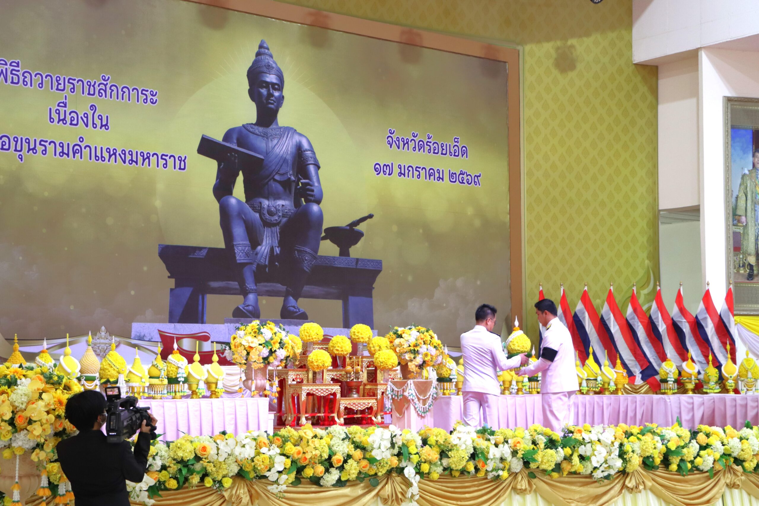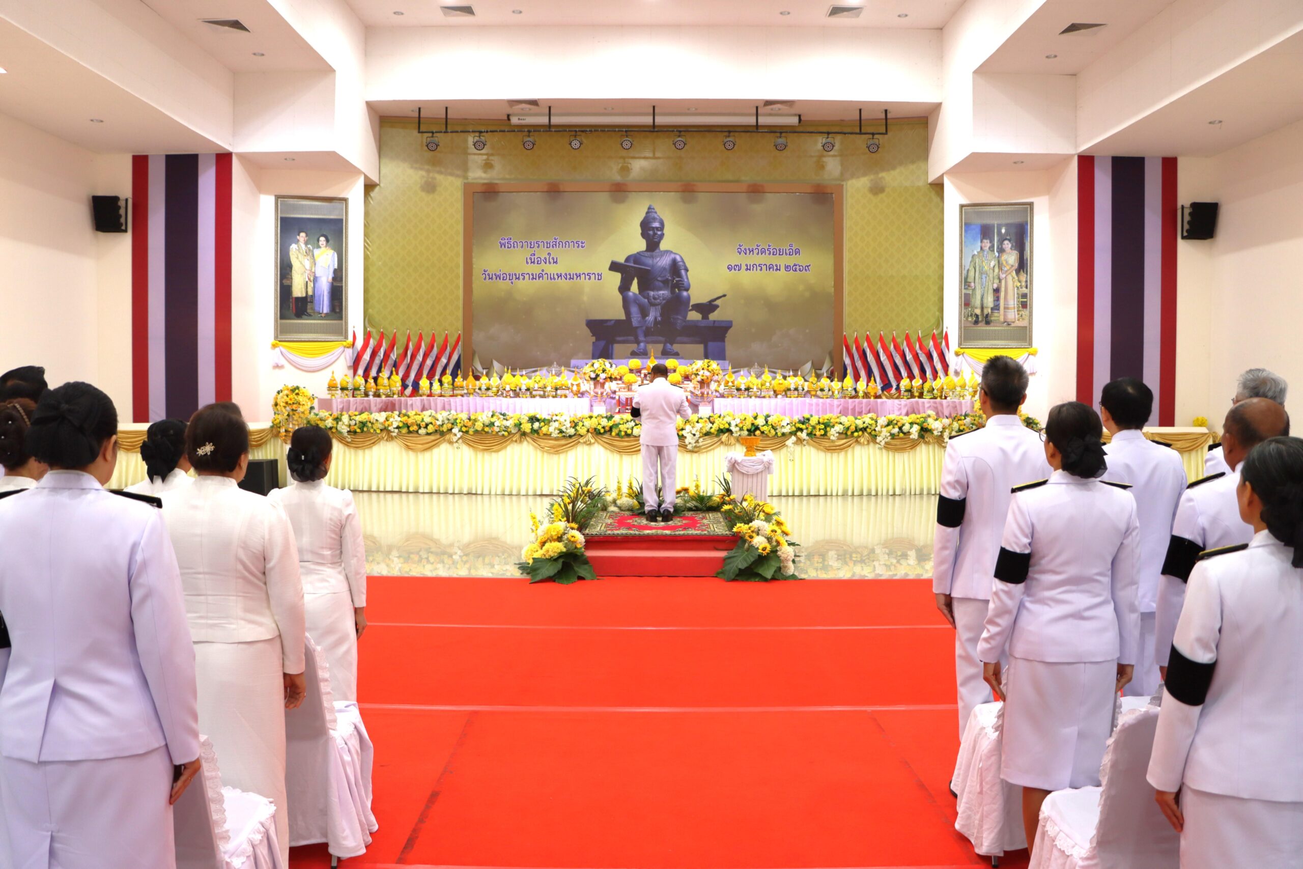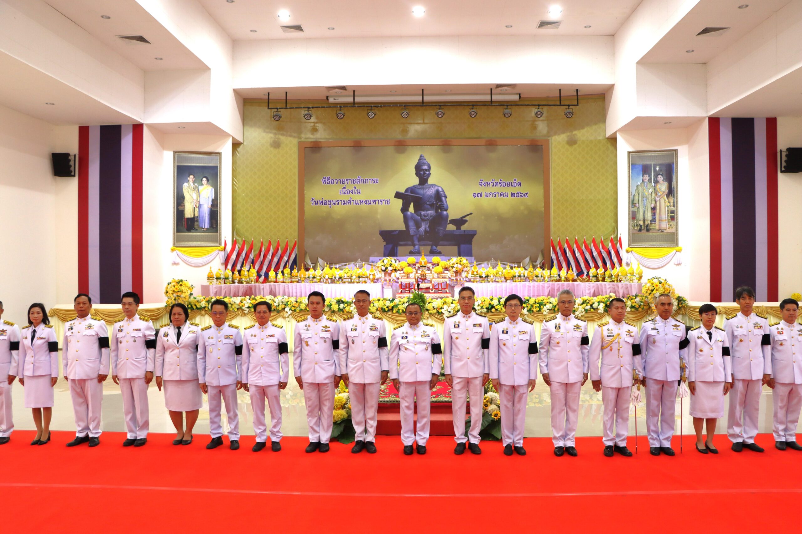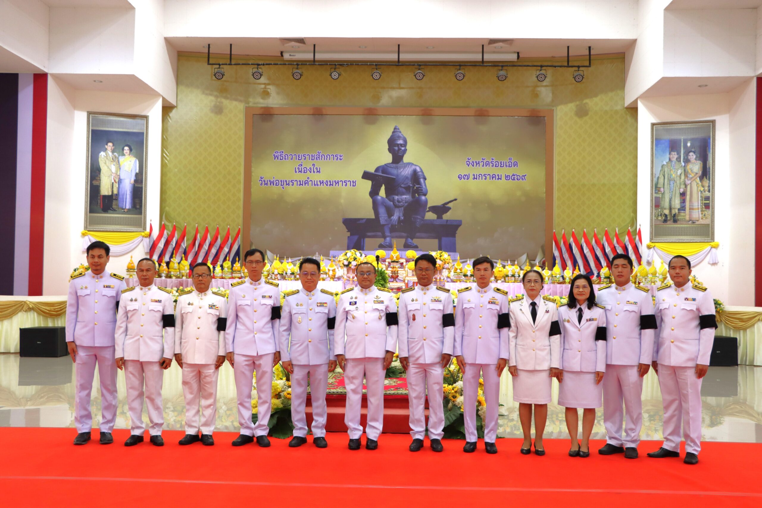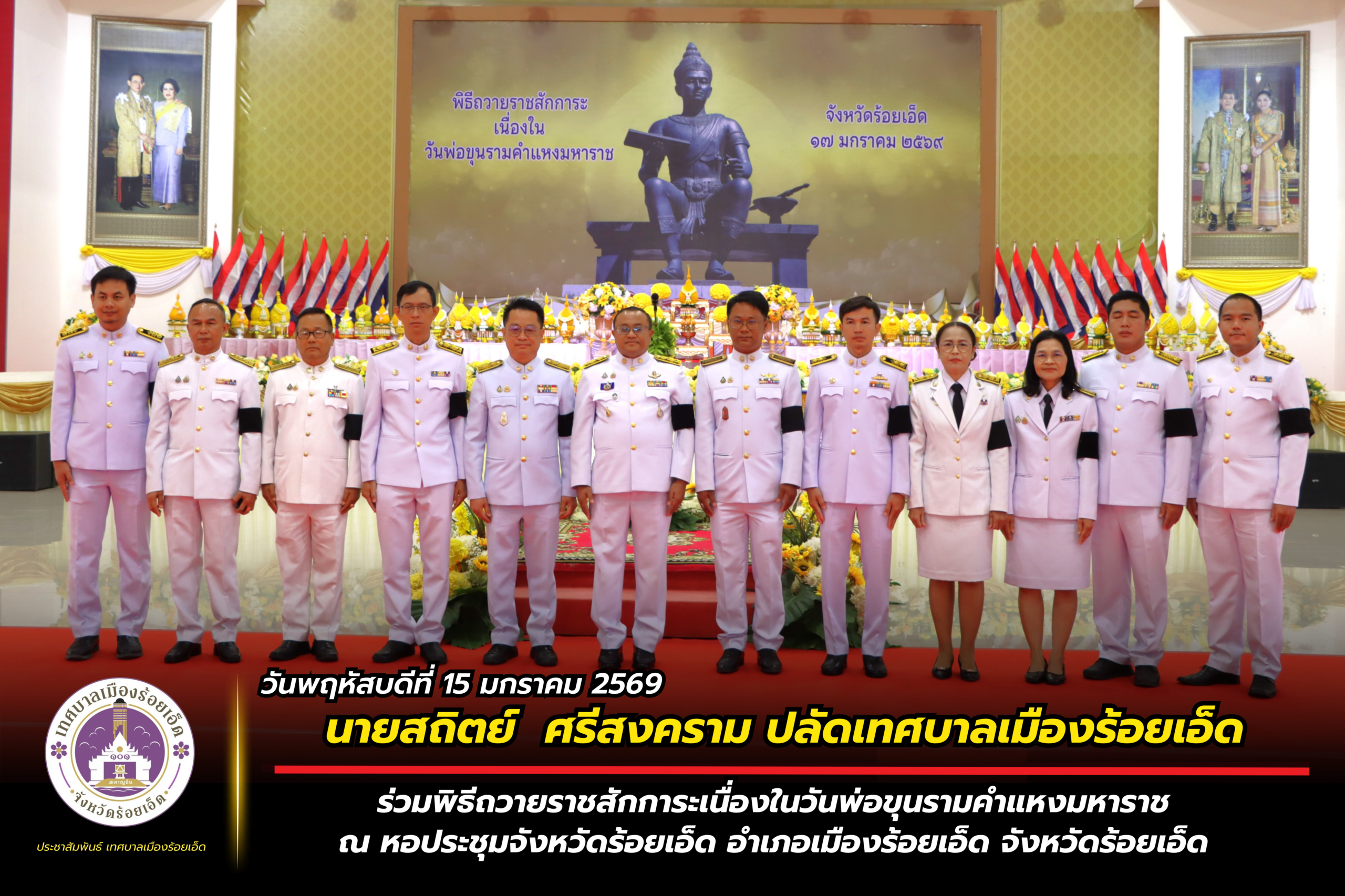 วันพฤหัสบดีที่ 15 มกราคม 2569 เวลา 07.00 น. เทศบาลเมืองร้อยเอ็ด นำโดย นายสถิตย์ ศรีสงคราม ปลัดเทศบาลเมืองร้อยเอ็ด พร้อมด้วย หัวหน้าฝ่าย, หัวหน้างาน, เจ้าหน้าที่กองช่างและกองช่างสุขาภิบาลเทศบาลเมืองร้อยเอ็ด ร่วมพิธีถวายราชสักการะเนื่องในวันพ่อขุนรามคำแหงมหาราช โดยมี นายชัชวาลย์ เบญจสิริวงศ์ ผู้ว่าราชการจังหวัดร้อยเอ็ด เป็นประธานในพิธีฯ พร้อมด้วย หัวหน้าส่วนราชการ หัวหน้าหน่วยงานรัฐวิสาหกิจ และส่วนเกี่ยวข้อง เพื่อเป็นการร่วมน้อมรำลึกในพระมหากรุณาธิคุณ ณ หอประชุมจังหวัดร้อยเอ็ด อำเภอเมืองร้อยเอ็ด จังหวัดร้อยเอ็ด