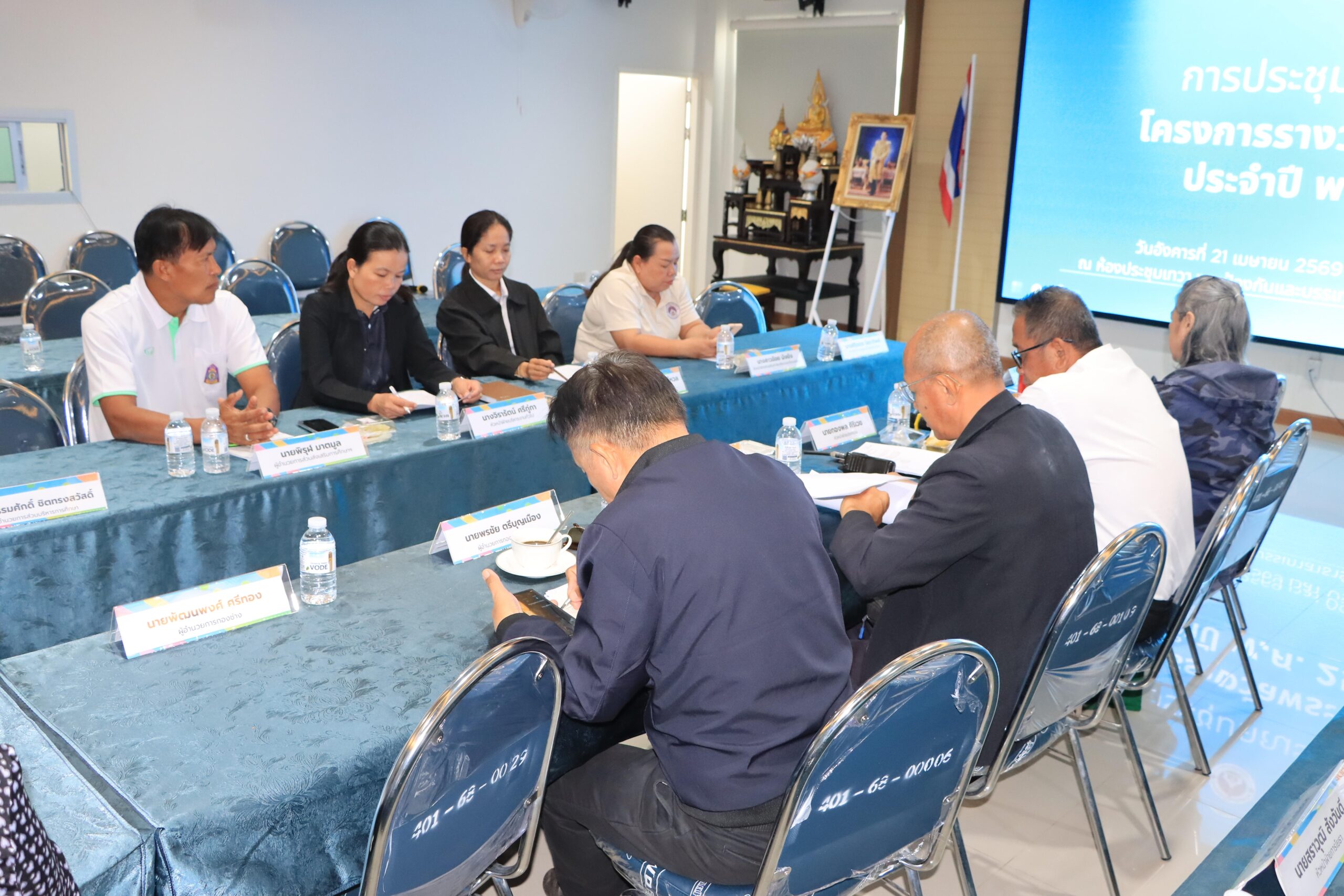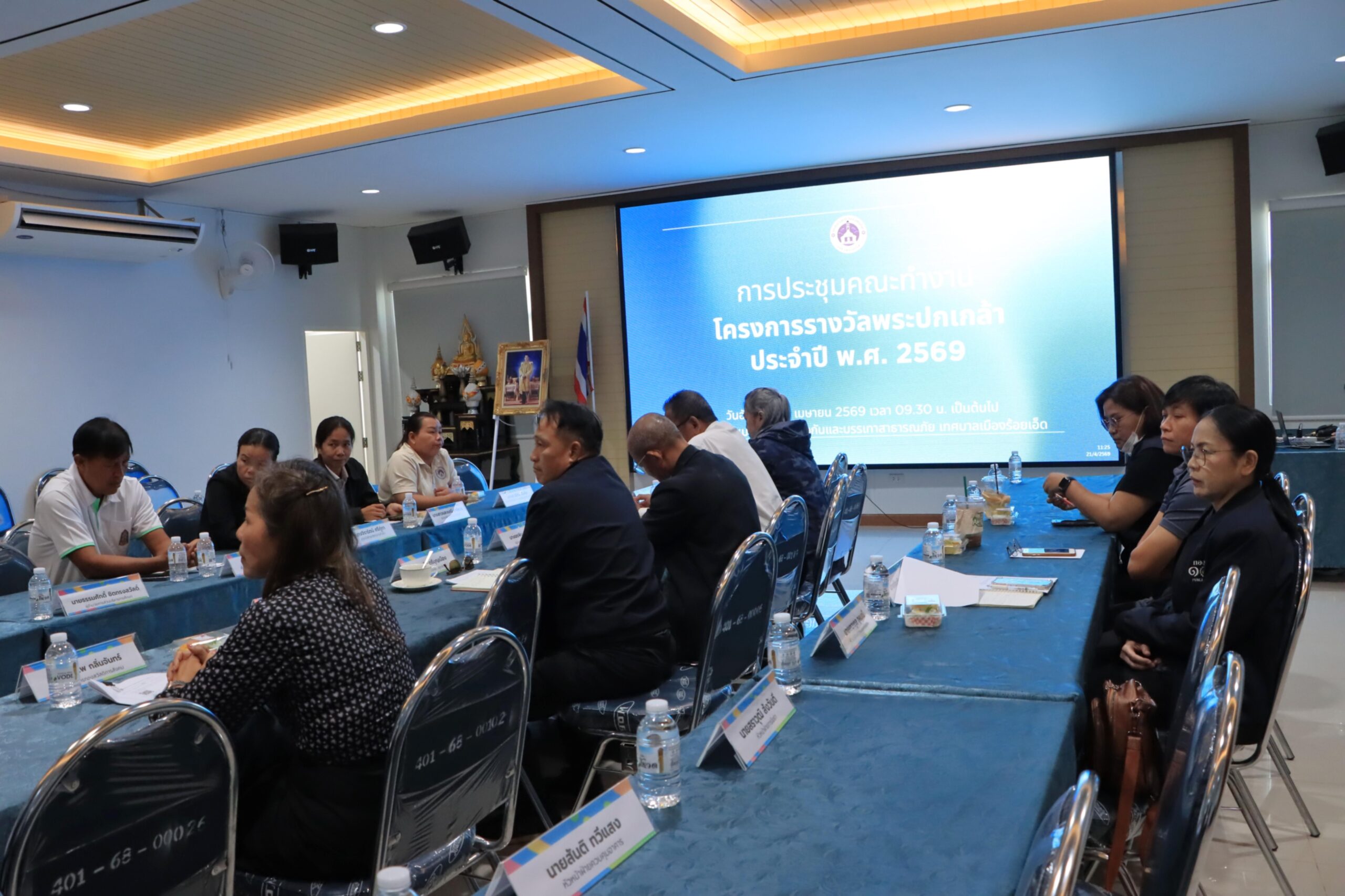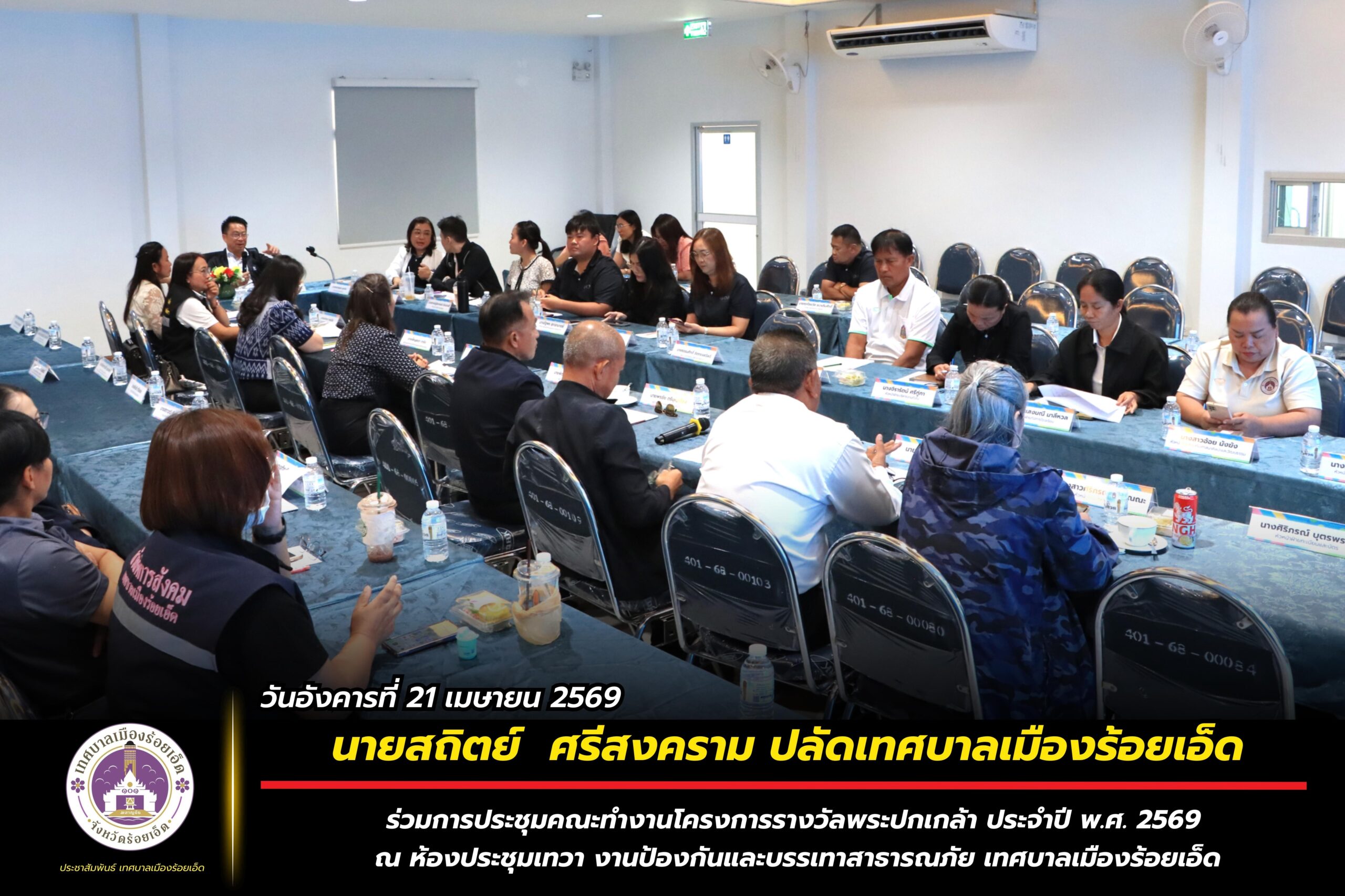 วันอังคารที่ 21 เมษายน 2569 เวลา 09.30 น. นายสถิตย์ ศรีสงคราม ปลัดเทศบาลเมืองร้อยเอ็ด พร้อมด้วย นางสาวกรชนก ยุคะลัง รองปลัดเทศบาลเมืองร้อยเอ็ด หัวหน้าส่วนการบริหาร หัวหน้าฝ่าย หัวหน้างาน เจ้าหน้าที่วิเคราะห์นโยบายและแผน กองยุทธศาสตร์และงบประมาณเทศบาลเมืองร้อยเอ็ด และเจ้าหน้าที่ผู้เกี่ยวข้อง ร่วมการประชุมคณะทำงานโครงการรางวัลพระปกเกล้า ประจำปี พ.ศ. 2569 ณ ห้องประชุมเทวา งานป้องกันและบรรเทาสาธารณภัย เทศบาลเมืองร้อยเอ็ด