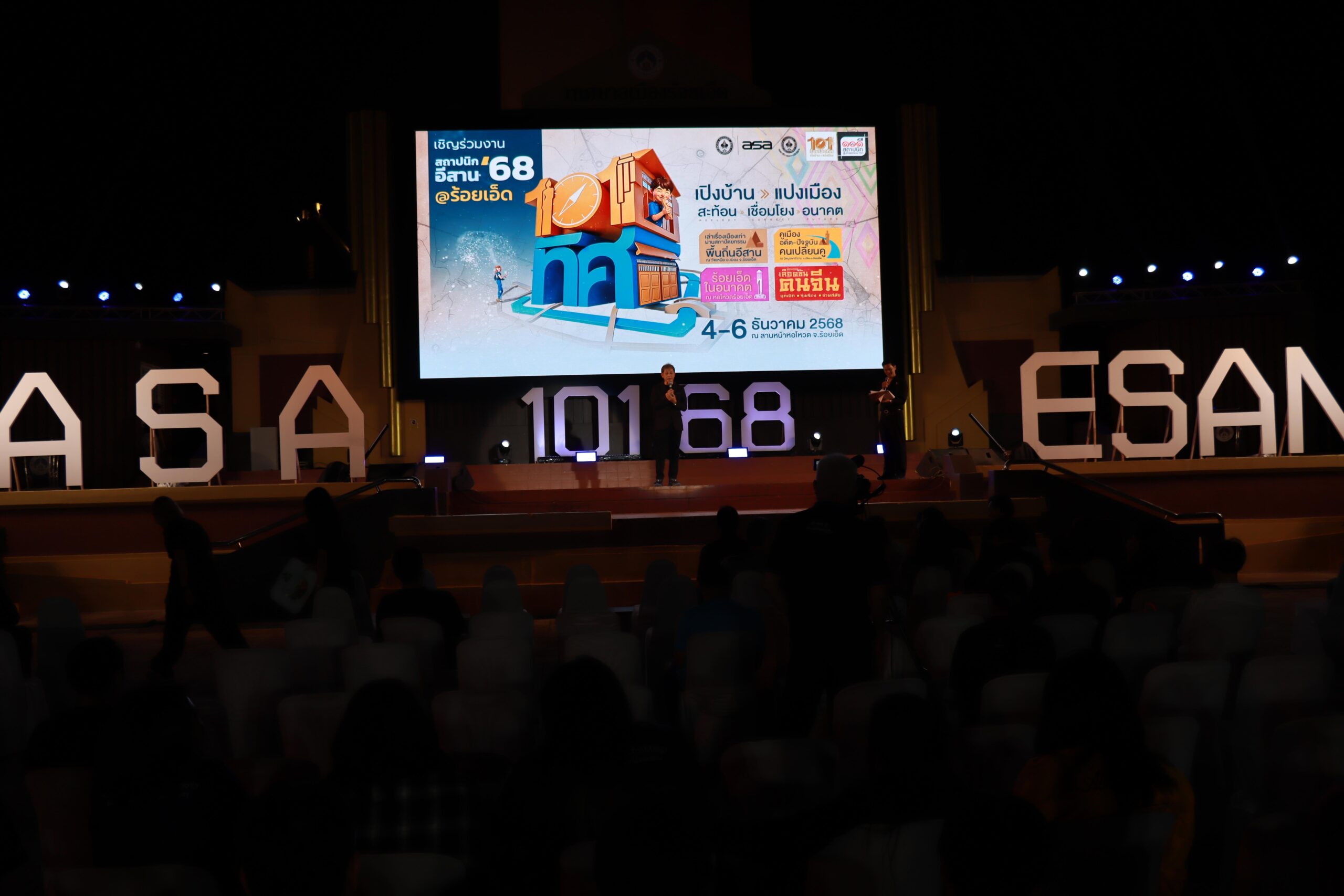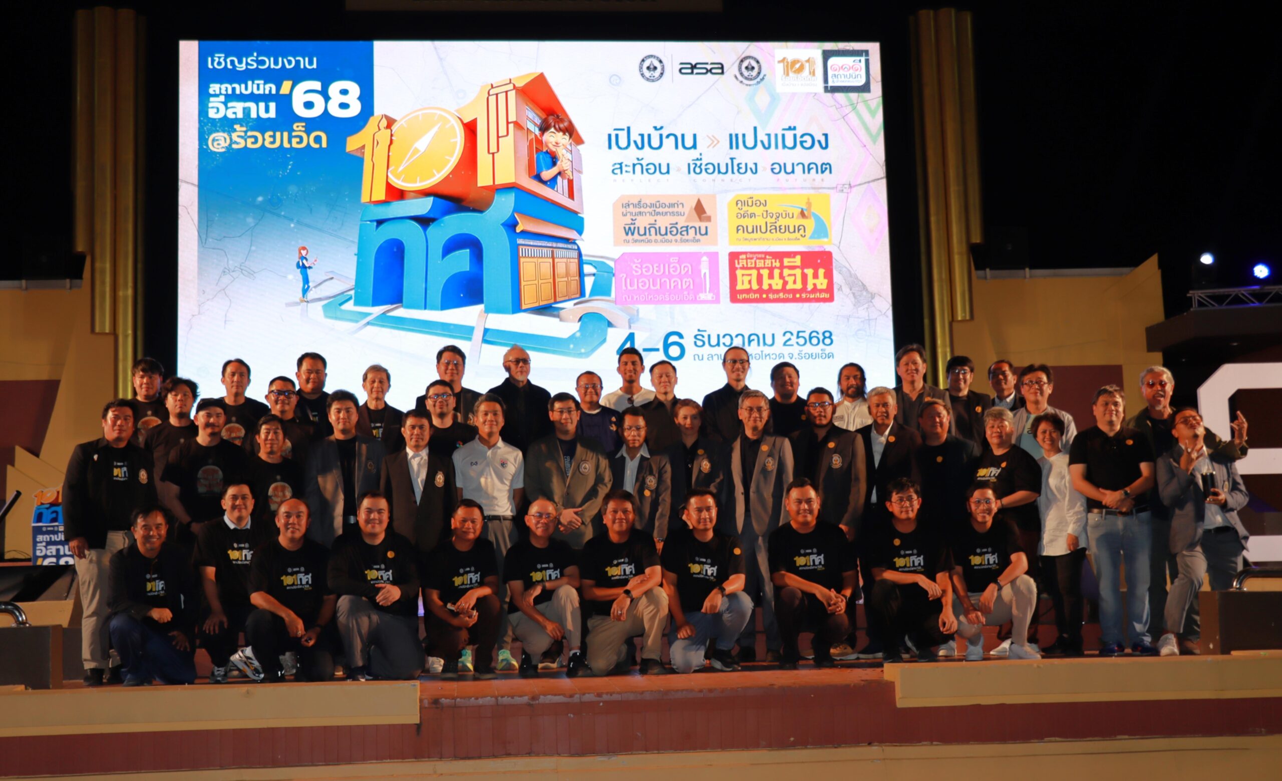 วันพฤหัสบดีที่ 4 ธันวาคม 2568 เวลา 18.00 น. นายเรืองรัตน์ รัตนโภคาสถิต รองนายกเทศมนตรีเมืองร้อยเอ็ด พร้อมด้วย นายนิติกร ทองกุล สถาปนิกชำนาญการ กองช่างเทศบาลเมืองร้อยเอ็ด, หัวหน้าฝ่าย, หัวหน้างาน และเจ้าหน้าที่ผู้เกี่ยวข้อง ร่วมงานสถาปนิกอีสาน‘68 | 101 ทิศ “เปิงบ้าน แปงเมือง” สะท้อน>เชื่อมโยง>อนาคต ระหว่างวันที่ 4-6 ธันวาคม 2568 โดยมี นายชัชวาลย์ เบญจสิริวงศ์ ผู้ว่าราชการร้อยเอ็ด เป็นประธานในพิธี พร้อมด้วย นายกสมาคมสถาปนิก, ประธานกรรมาธิการสถาปนิกภาคอีสาน หน่วยงานภาครัฐและเอกชน, สถาปนิกทั่วประเทศไทย พร้อมกิจกรรมออกบูธต่างๆ อีกมากมาย ณ ลานหน้าหอโหวด จังหวัดร้อยเอ็ด