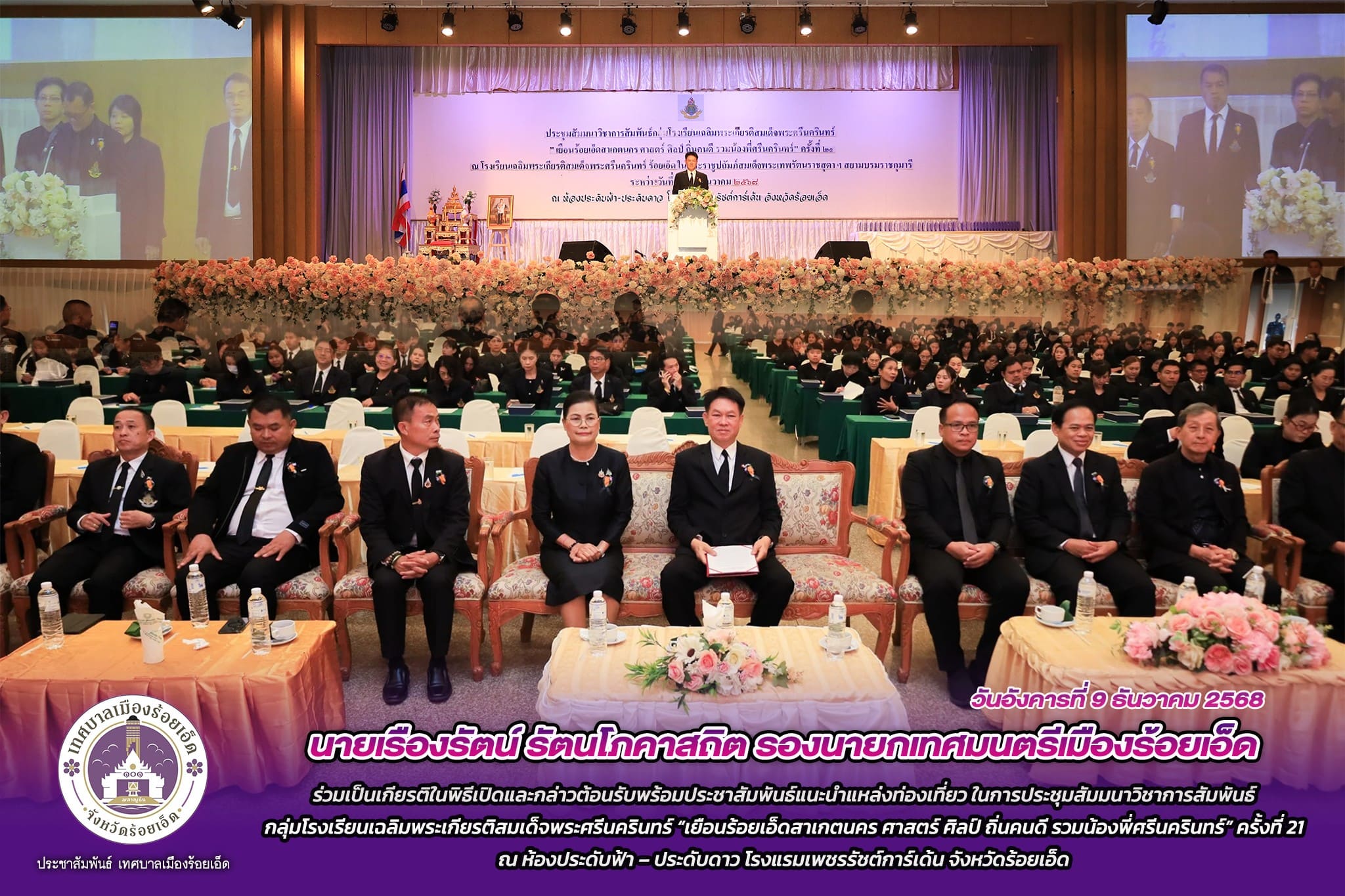 วันอังคารที่ 9 ธันวาคม 2568 เวลา 09.00 น. นายเรืองรัตน์ รัตนโภคาสถิต รองนายกเทศมนตรีเมืองร้อยเอ็ด ร่วมเป็นเกียรติในพิธีเปิดและกล่าวต้อนรับพร้อมประชาสัมพันธ์แนะนำแหล่งท่องเที่ยว ในการประชุมสัมมนาวิชาการสัมพันธ์กลุ่มโรงเรียนเฉลิมพระเกียรติสมเด็จพระศรีนครินทร์ “เยือนร้อยเอ็ดสาเกตนคร ศาสตร์ ศิลป์ ถิ่นคนดี รวมน้องพี่ศรีนครินทร์” ครั้งที่ 21 ณ โรงเรียนเฉลิมพระเกียรติสมเด็จพระศรีนครินทร์ ร้อยเอ็ด ในพระราชูปถัมภ์สมเด็จพระเทพรัตนราชสุดาฯ สยามบรมราชกุมารี ซึ่งมี นางสาวปราณี วงศ์บุตร รองผู้ว่าราชการจังหวัดร้อยเอ็ด กล่าวต้อนรับผู้เข้าร่วมประชุมสัมมนาฯ โดยมี นายเอกภาพ พลซื่อ โฆษกกระทรวงเกษตรและสหกรณ์ เป็นประธานเปิดงานฯ พร้อมมอบโล่รางวัลเชิดชูเกียรติในครั้งนี้ ณ ห้องประดับฟ้า – ประดับดาว โรงแรมเพชรรัชต์การ์เด้น จังหวัดร้อยเอ็ด