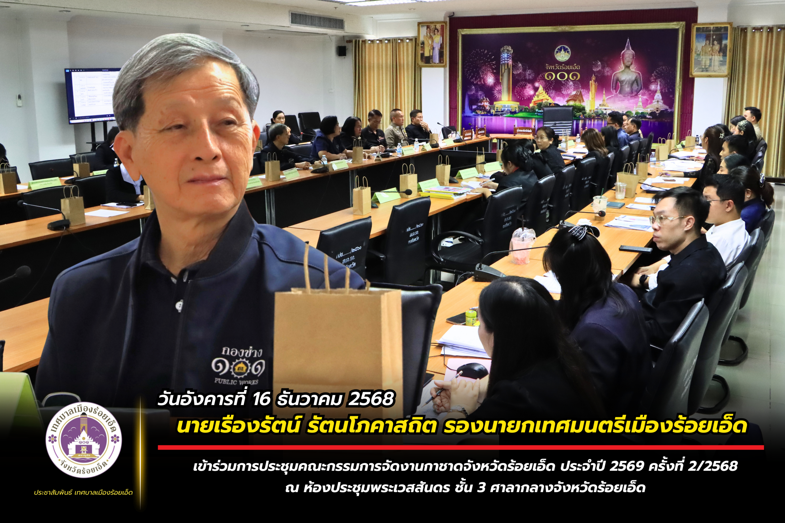 วันอังคารที่ 16 ธันวาคม 2568 เวลา 13.30 น. นายเรืองรัตน์ รัตนโภคาสถิต รองนายกเทศมนตรีเมืองร้อยเอ็ด พร้อมด้วย นายสันติ ทวีแสง หัวหน้าฝ่ายควบคุมอาคารและผังเมือง เข้าร่วมการประชุมคณะกรรมการจัดงานกาชาดจังหวัดร้อยเอ็ด ประจำปี 2569 ครั้งที่ 2/2568 เพื่อพิจารณาและติดตามความคืบหน้าการเตรียมการจัดงานในแต่ละด้าน โดยมี นายนันทวิทย์ นาคแสง รองผู้ว่าราชการจังหวัดร้อยเอ็ด เป็นประธานการประชุม และนายพิชัยยา ตุระซอง รองผู้ว่าราชการจังหวัดร้อยเอ็ด ร่วมพิจารณาและให้ข้อเสนอแนะในการดำเนินงาน พร้อมด้วย คณะกรรมการจัดงานกาชาดจังหวัดร้อยเอ็ด, หัวหน้าส่วนราชการ, และหน่วยงานที่เกี่ยวข้อง เข้าร่วมการประชุมฯ ในครั้งนี้ ณ ห้องประชุมพระเวสสันดร ชั้น 3 ศาลากลางจังหวัดร้อยเอ็ด