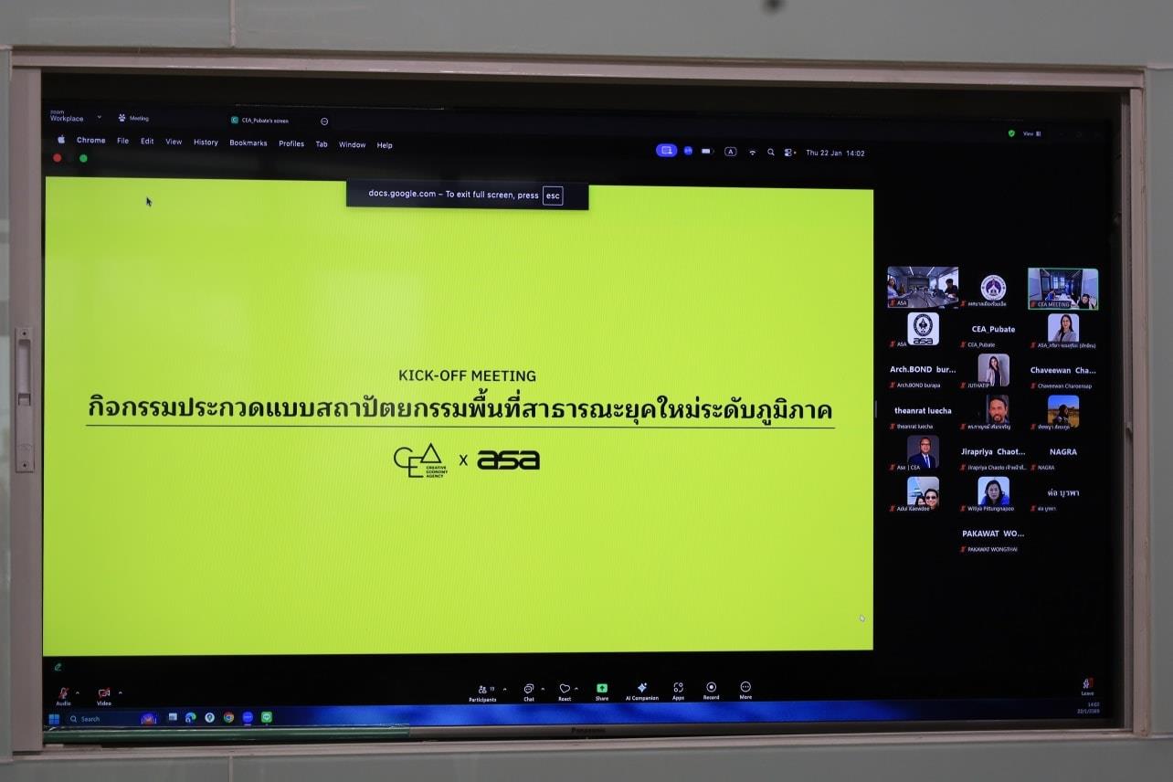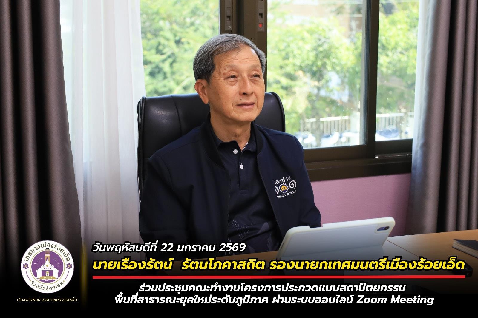 วันพฤหัสบดีที่ 22 มกราคม 2569 เวลา 14.00 น. นายเรืองรัตน์ รัตนโภคาสถิต รองนายกเทศมนตรีเมืองร้อยเอ็ด ร่วมประชุมคณะทำงานโครงการประกวดแบบสถาปัตยกรรม พื้นที่สาธารณะยุคใหม่ระดับภูมิภาค ร่วมกับสมาคมสถาปนิสยาม ในพระบรมราชูปถัมภ์ (ASA) ผ่านระบบออนไลน์ Zoom Meeting ณ ห้องประชุมมีโชคชัย สำนักการศึกษา (ชั้น 2) สำนักงานเทศบาลเมืองร้อยเอ็ด