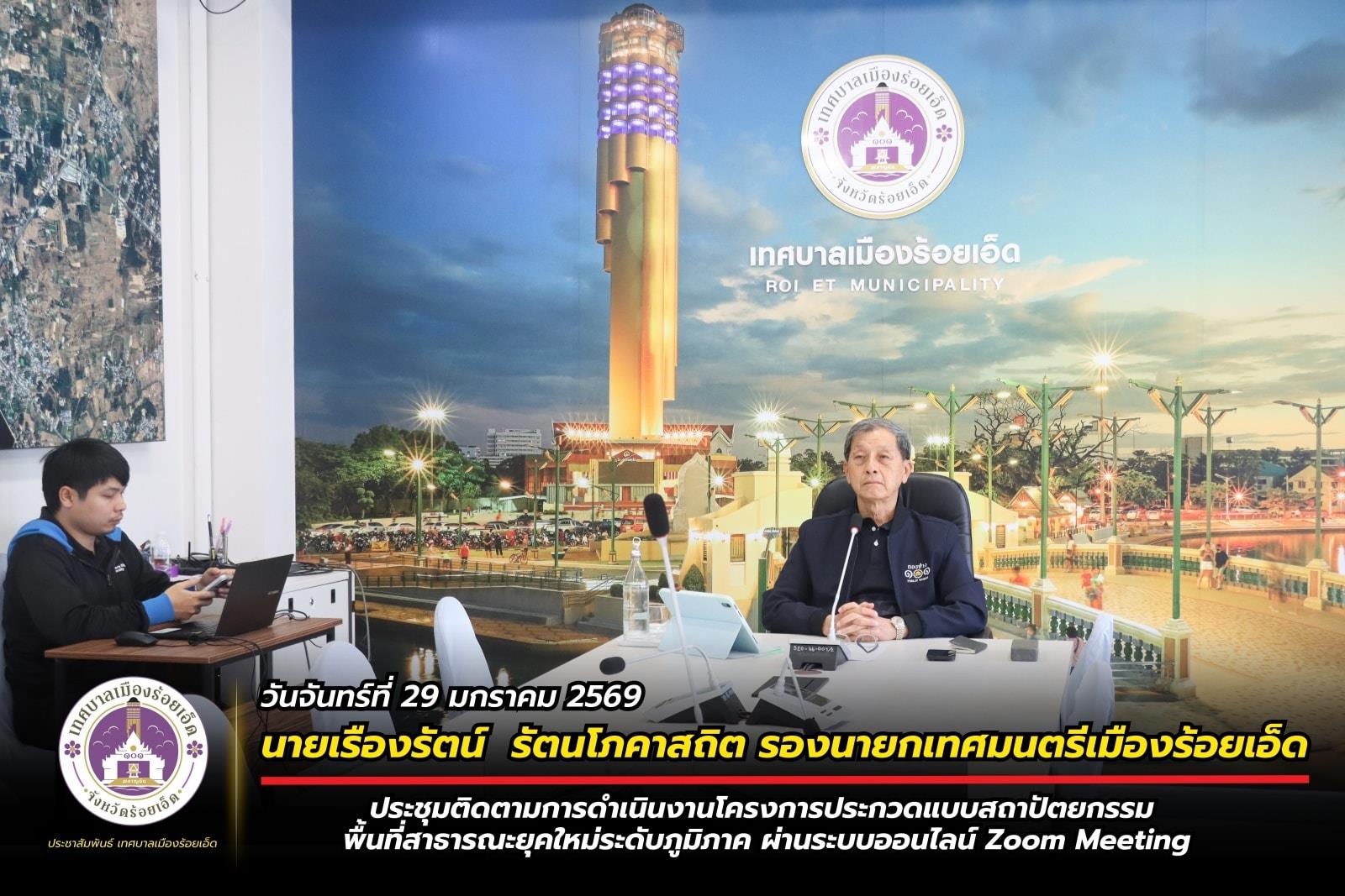 วันพฤหัสบดีที่ 29 มกราคม 2569 เวลา 16.00 น. นายเรืองรัตน์ รัตนโภคาสถิตย์ รองนายกเทศมนตรีเมืองร้อยเอ็ด ร่วมประชุมติดตามการดำเนินงานโครงการประกวดแบบสถาปัตยกรรม พื้นที่สาธารณะยุคใหม่ระดับภูมิภาค ผ่านระบบออนไลน์ Zoom Meeting โดยมีประเด็นหารือ สรุปชื่อโครงการเพื่อการสื่อสาร และประชาสัมพันธ์ สรุปจังหวัดพื้นที่เป้าหมาย แต่ละภูมิภาค เพื่อเข้าร่วมโครงการ ตลอดจนกำหนดการกิจกรรมย่อย ต่างๆ ณ ห้องประชุมปัทมานนท์ Smart Room (ชั้น 2) สำนักงานเทศบาลเมืองร้อยเอ็ด