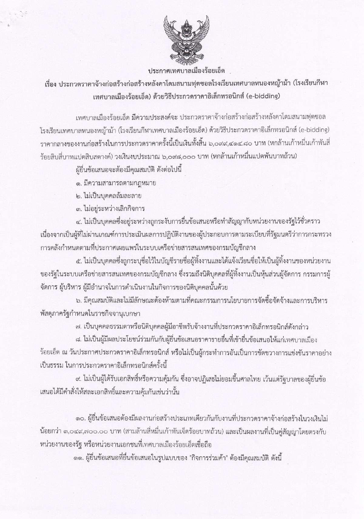 ประกาศจ้างเหมาก่อสร้างหลังคาโดมสนามฟุตซอลโรงเรียนเทศบาลหนองหญ้าม้า (โรงเรียนกีฬาเทศบาลเมืองร้อยเอ็ด) ด้วยวิธีประกวดราคาอิเล็กทรอนิกส์ (e-bidding)