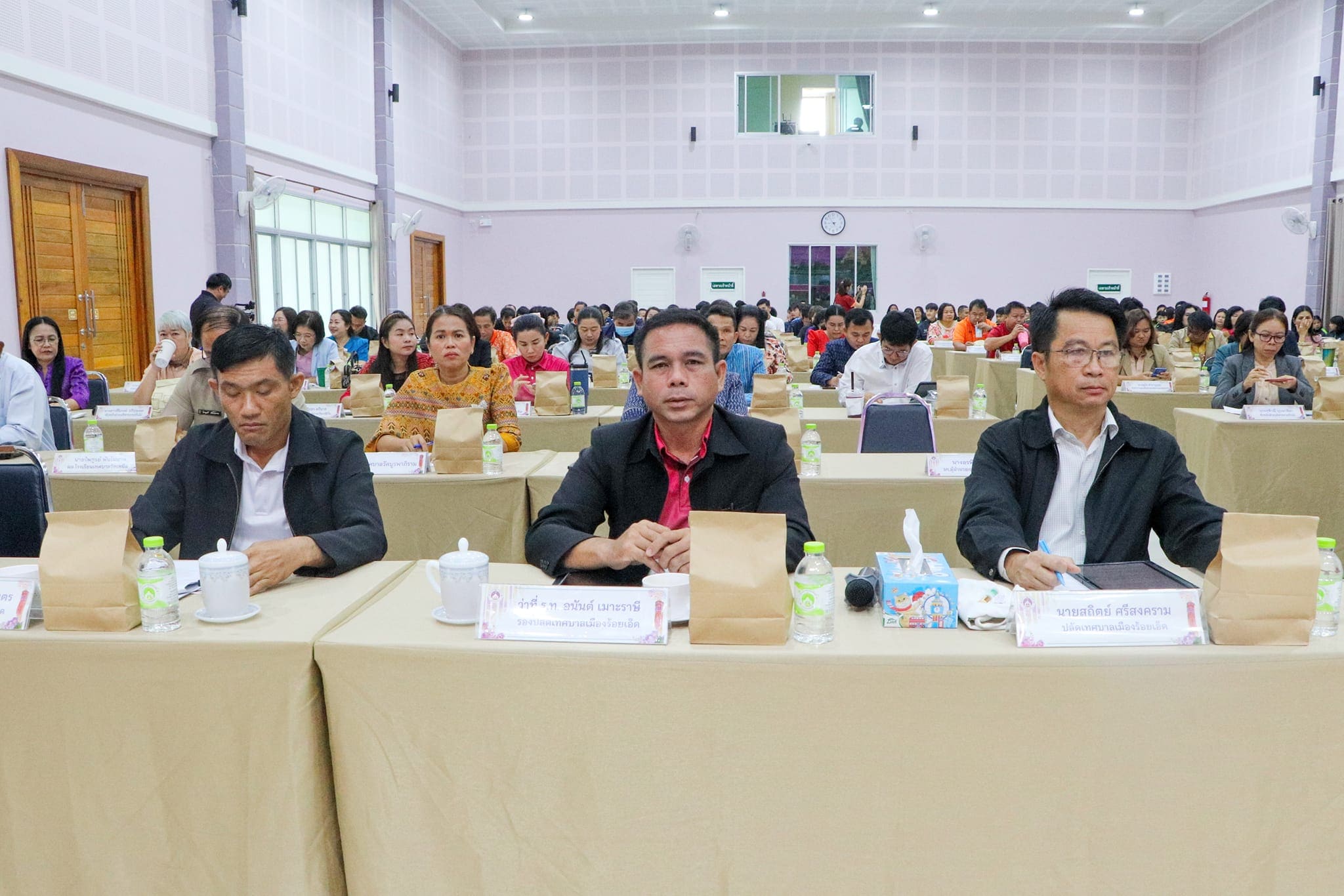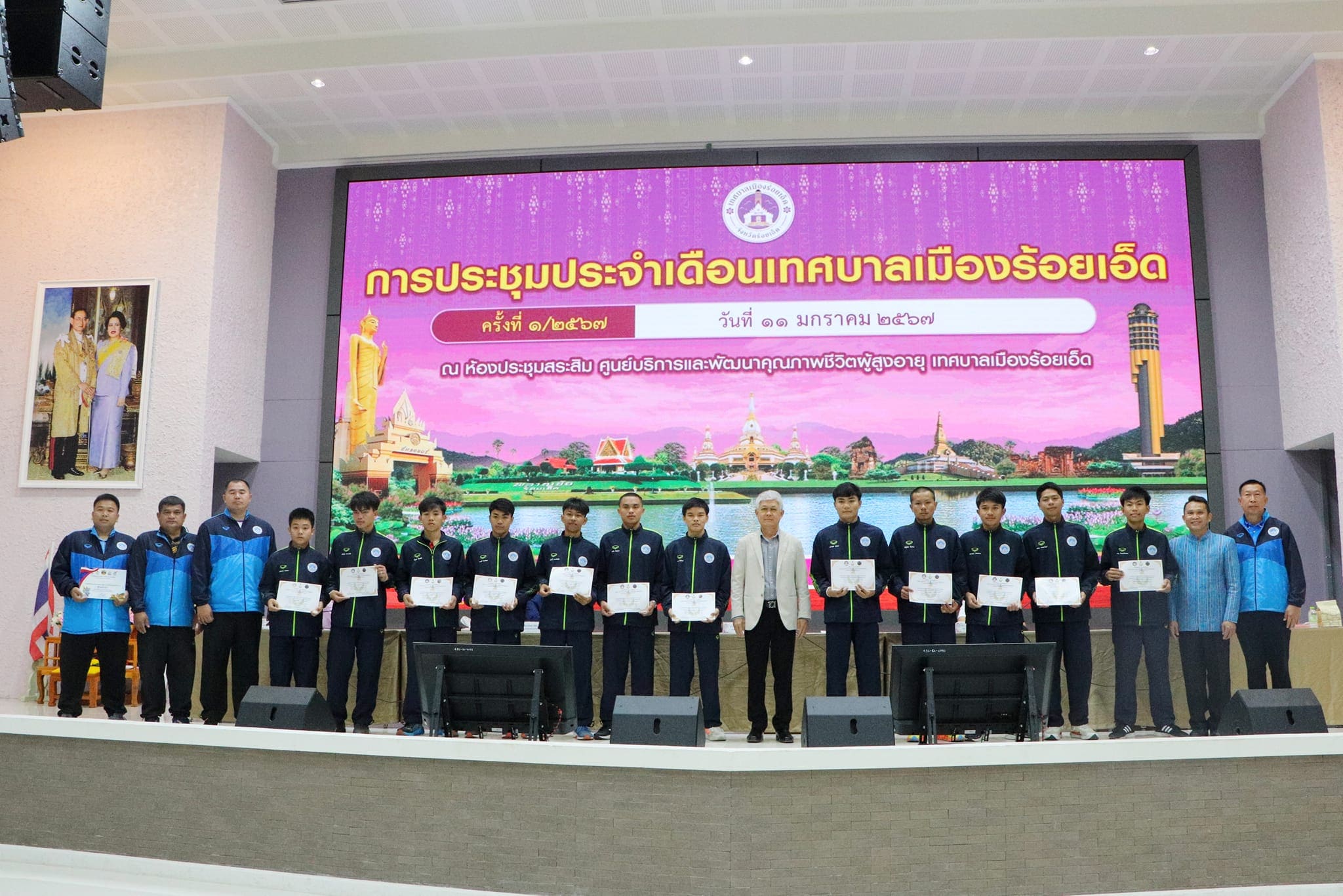 วันพฤหัสบดีที่ 11 มกราคม 2567 เวลา 08.30 น. เทศบาลเมืองร้อยเอ็ด เปิดประชุมประจำเดือนมกราคม ครั้งที่ 1/2567 โดยมี นายบรรจง โฆษิตจิรนันท์ นายกเทศมนตรีเมืองร้อยเอ็ด เป็นประธานการประชุม และร่วมบันทึกภาพพร้อมแสดงความยินดีกับผู้ที่ได้รับรางวัลต่างๆ ดังนี้ 1. งานป้องกันและบรรเทาสาธารณภัย ได้รับรางวัลชนะเลิศ การประกวดองค์กรปกครองส่วนท้องถิ่นดีเด่น ด้านการป้องกันและบรรเทาสารณภัย ประจำปีงบประมาณ 2567 ระดับประเทศ ประเภทเทศบาลเมือง 2. นายขวัญประชา พลพุทธา ครูชำนาญการพิเศษ โรงเรียนเทศบาลวัดเวฬุวัน ได้รับรางวัลผู้บังคับบัญชาลูกเสือดีเด่น ประจำปี 2566 3. โรงเรียนเทศบาลวัดป่าเรไร ได้รับรางวัลโรงเรียน อย.น้อย ดีเยี่ยม ระดับเขตสุขภาพที่ 7, รางวัลชนะเลิศ สุดยอดเครือข่ายโรงเรียน อย.น้อย ที่มีผลงานโดดเด่นดีเยี่ยม และบุคคลต้นแบบ จากสำนักงานคณะกรรมการอาหารและยา 4. นักกีฬาและผู้ฝึกสอน โรงเรียนเทศบาลหนองหญ้าม้า (โรงเรียนกีฬาท้องถิ่นเทศบาลเมืองร้อยเอ็ด) ซึ่งได้ส่งนักกีฬาเข้าร่วมการแข่งขันรายการต่างๆในภาคเรียนที่ 2 ปีการศึกษา 2566 เพื่อพัฒนาศักยภาพผู้เรียนและส่งเสริมความเป็นเลิศด้านกีฬา ซึ่งได้รับรางวัลในระดับภาค และระดับประเทศ ซึ่งมีคณะผู้บริหารเทศบาล, หัวหน้าส่วนการบริหาร, ผู้บริหารสถานศึกษา, หัวหน้าฝ่าย, หัวหน้างาน และพนักงานสังกัดเทศบาลเมืองร้อยเอ็ด ร่วมรายงานผลการดำเนินงานในรอบเดือนที่ผ่านมา และรับฟังนโยบายการทำงานจากผู้บริหารเทศบาลเมืองร้อยเอ็ด ณ ห้องประชุมสระสิม (ชั้น1) ศูนย์บริการและพัฒนาคุณภาพชีวิตผู้สูงอายุเทศบาลเมืองร้อยเอ็ด