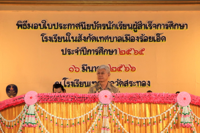 วันพฤหัสบดีที่ 16 มีนาคม 2566 เวลา 09.00 น. นายบรรจง โฆษิตจิรนันท์ นายกเทศมนตรีเมืองร้อยเอ็ด เป็นประธานพิธีมอบใบประกาศนียบัตรนักเรียนผู้สำเร็จการศึกษา โรงเรียนในสังกัดเทศบาลเมืองร้อยเอ็ด ประจำปีการศึกษา 2565 พร้อมด้วยคณะผู้บริหารเทศบาล, รองประธานสภาเทศบาล, สมาชิกสภาเทศบาล, หัวหน้าส่วนการบริหาร, ผู้บริหารสถานศึกษา, พนักงานครูเทศบาล และเจ้าหน้าที่ผู้เกี่ยวข้อง ร่วมเป็นเกียรติในพิธีฯ ณ อาคารเอนกประสงค์ โรงเรียนเทศบาลวัดสระทอง เทศบาลเมืองร้อยเอ็ด