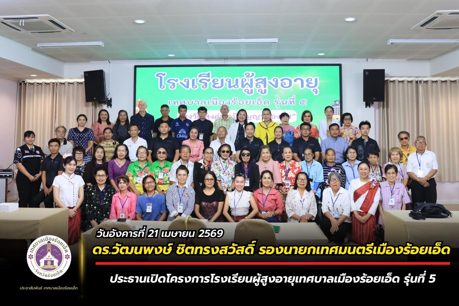 วันอังคารที่ 21 เมษายน 2569 เวลา 09.30 น. ดร.วัฒนพงษ์ ชิตทรงสวัสดิ์ รองนายกเทศมนตรีเมืองร้อยเอ็ด เป็นประธานเปิดโครงการโรงเรียนผู้สูงอายุเทศบาลเมืองร้อยเอ็ด รุ่นที่ 5 โดยมี สมาชิกสภาเทศบาล รองปลัดเทศบาล หัวหน้าส่วนการบริหาร หัวหน้าฝ่าย หัวหน้างาน และเจ้าหน้าที่ผู้เกี่ยวข้อง ร่วมเปิดโครงการครั้งนี้ ซึ่งมีวัตถุประสงค์เพื่อส่งเสริมการพัฒนาคุณภาพชีวิตและการจัดการเรียนรู้ตลอดชีวิตผู้สูงอายุ ส่งเสริมการพัฒนาตนเอง การดูแล คุ้มครอง และพิทักษ์สิทธิผู้สูงอายุ ส่งเสริมปัญญาและวัฒนธรรมท้องถิ่น และส่งเสริมสุขภาพที่ดีของผู้สูงอายุ ทั้งด้านร่างกาย จิตใจ อารมณ์ สังคม และจิตวิญญาณของผู้สูงอายุ การใช้เวลาว่างให้เกิดประโยชน์ ได้พบประสบการณ์ใหม่ สามารถนำความรู้มาใช้ประโยชน์ต่อตนเองและสังคม ณ ห้องประชุมสระสิม 2 (ชั้น 2) โรงพยาบาลส่งเสริมสุขภาพเทศบาล 2 (สระสิม) เทศบาลเมืองร้อยเอ็ด