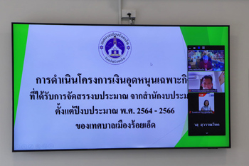 วันอังคารที่ 27 มิถุนายน 2566 เวลา 16.00 น. นายบรรจง โฆษิตจิรนันท์ นายกเทศมนตรีเมืองร้อยเอ็ด พร้อมด้วย นายสถิตย์ ศรีสงคราม ปลัดเทศบาลเมืองร้อยเอ็ด, หัวหน้าส่วนการบริหาร, หัวหน้าฝ่าย, หัวหน้างาน และเจ้าหน้าที่ผู้เกี่ยวข้อง ร่วมให้สัมภาษณ์ผ่านระบบออนไลน์ หัวข้อ “การดำเนินโครงการจากเงินอุดหนุนเฉพาะกิจขององค์กรปกครองส่วนท้องถิ่น” พร้อมตอบข้อซักถาม กับคณะนักวิจัยสถาบันบัณฑิตพัฒนบริหารศาสตร์ ณ ห้องประชุมปัทมานนท์ Smart Room (ชั้น 2) สำนักงานเทศบาลเมืองร้อยเอ็ด
