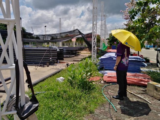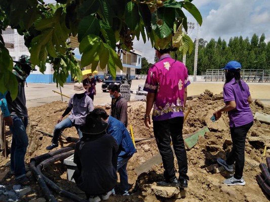 ออกตรวจงานอยู่ในระหว่างการก่อสร้างหลังคาโดมสนามฟุตซอล