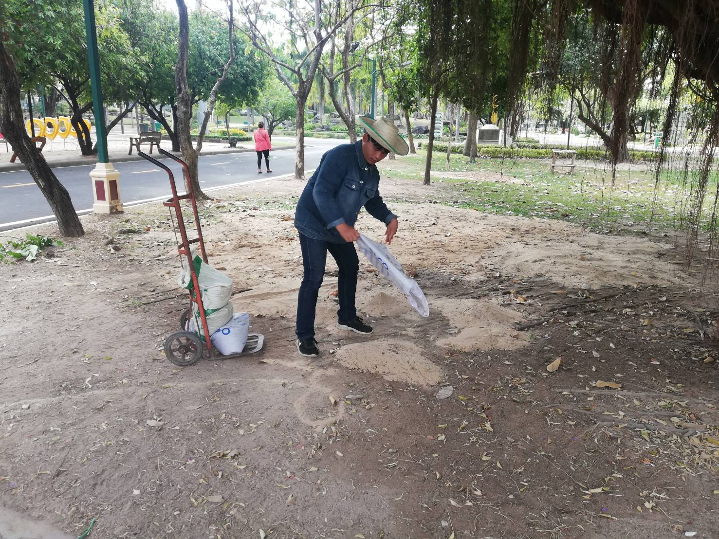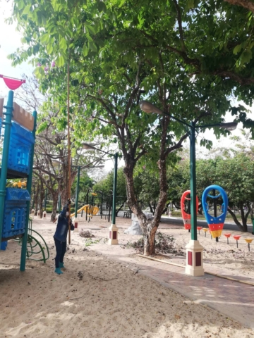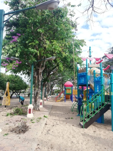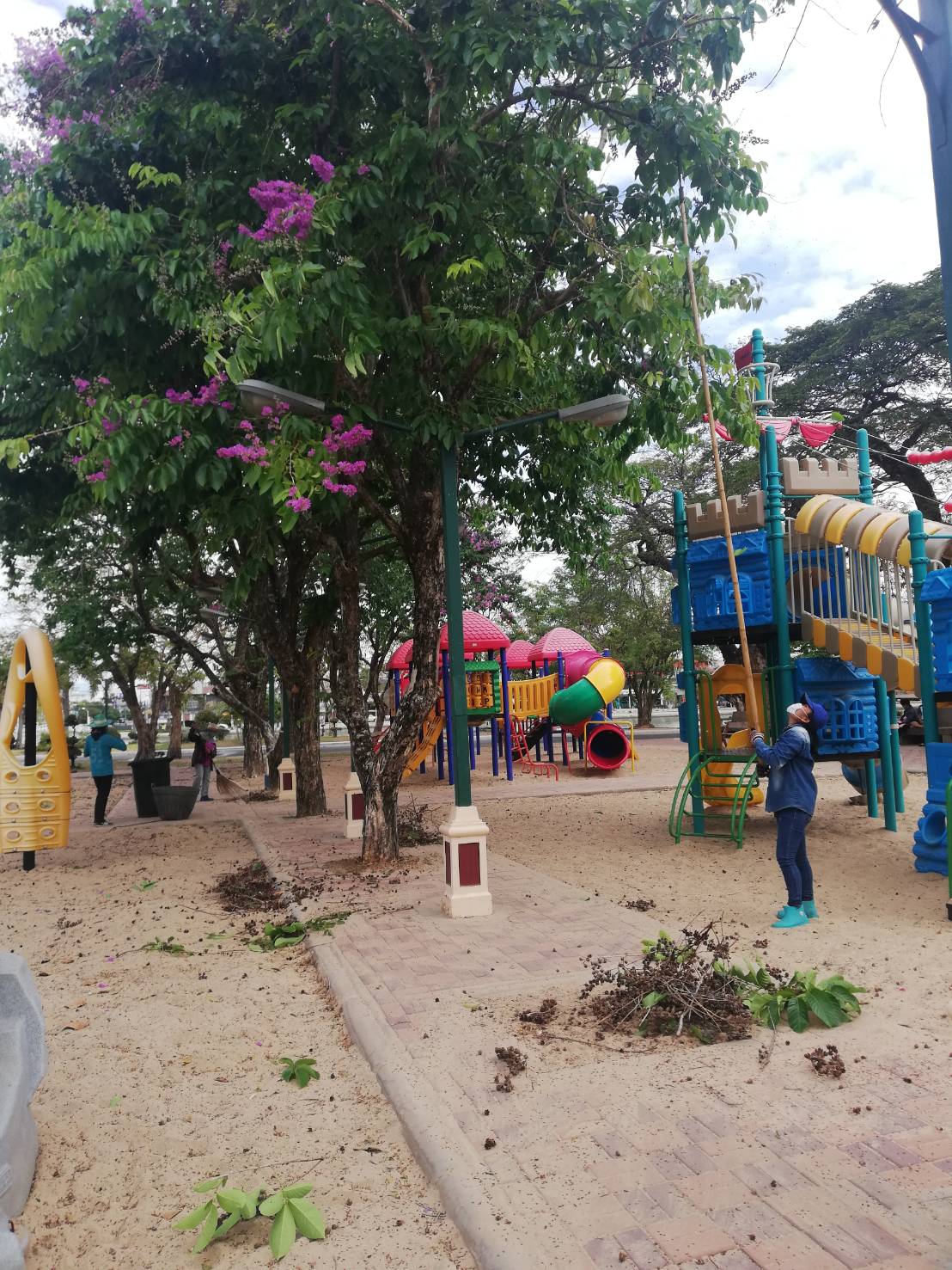 เทศบาลเมืองร้อยเอ็ด ดำเนินการตัดแต่งกิ่งไม้แห้งต้นอินทนิลบกบริเวณสนามเด็ก พร้อมกับตักทรายมาเติมพื้นที่บริเวณที่เป็นหลุม เป็นร่อง