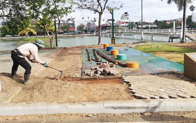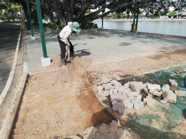 เทศบาลเมืองร้อยเอ็ด ดำเนินการปรับดินเตรียมปูตัวหนอน ข้างจุดออกกำลังกาย สะพานเกิดวรามิตร ภายในบึงพลาญชัย