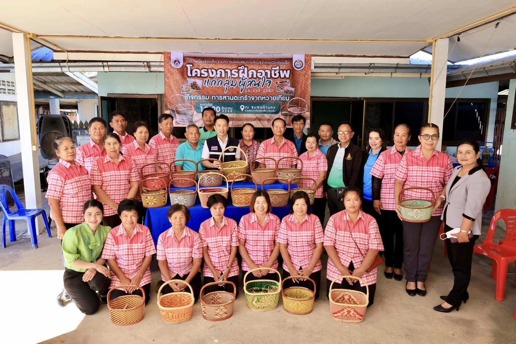 วันพุธที่ 20 ธันวาคม 2566 เวลา 10.00 น. ดร.วัฒนพงษ์ ชิตทรงสวัสดิ์ รองนายกเทศมนตรีเมืองร้อยเอ็ด เป็นประธานปิดโครงการฝึกอาชีพแก่กลุ่มผู้สนใจ กิจกรรมการสานตะกร้าจากหวายเทียม ประจำปี 2567 โดยมี สมาชิกสภาเทศบาล, หัวหน้าส่วนการบริหาร, หัวหน้าฝ่าย, หัวหน้างาน, ประธานชุมชน, คณะกรรมการชุมชน, อสม. และเจ้าหน้าที่ผู้เกี่ยวข้อง ร่วมปิดโครงการในครั้งนี้ ณ ชุมชนท่านคร