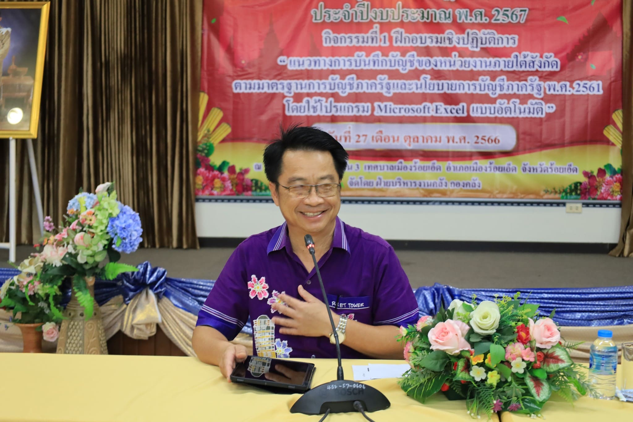 วันศุกร์ที่ 27 ตุลาคม 2566 เวลา 09.00 น. นายสถิตย์ ศรีสงคราม ปลัดเทศบาลเมืองร้อยเอ็ด เป็นประธานเปิดโครงการพัฒนาบุคลากรที่ปฏิบัติงานด้านการเงิน ประจำปีงบประมาณ พ.ศ. 2567 กิจกรรมที่ 1 ฝึกอบรมเชิงปฏิบัติการ “แนวทางการบันทึกบัญชีของหน่วยงานภายใต้สังกัด ตามมาตรฐานการบัญชีภาครัฐและนโนบายการบัญชีภาครัฐ พ.ศ. 2561 โดยใช้โปรแกรม Microsoft-Excel แบบอัตโนมัติ” โดยมี ว่าที่ ร.ท.อนันต์ เมาะราษี รองปลัดเทศบาลเมืองร้อยเอ็ด, หัวหน้าส่วนการบริหาร, ผู้บริหารสถานศึกษา, พนักงานครูเทศบาล และพนักงานในสังกัดเทศบาลเมืองร้อยเอ็ด เข้าร่วมการอบรม ในครั้งนี้ ณ ห้องประชุมสุนทรเทพ (ชั้น3) สำนักงานเทศบาลเมืองร้อยเอ็ด