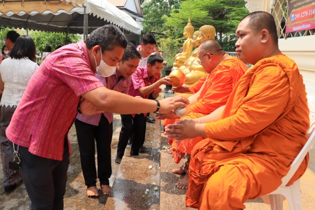 วันอังคารที่ 11 เมษายน 2566 เวลา 10.00 น. ผศ.ดร.สาธิต กฤตลักษณ์ เลขานุการนายกเทศมนตรีเมืองร้อยเอ็ด และประธานสภาวัฒนธรรมจังหวัดร้อยเอ็ด เป็นประธานพิธีสรงน้ำพระเพื่อความเป็นสิริมงคล และส่งเสริมประเพณีวัฒนธรรมอันดีงามในช่วงเทศกาลสงกรานต์ โครงการสรงน้ำพระ 9 วัด รับน้ำพระพุทธมนต์เสริมมงคลชีวิต “สืบสานสงกรานต์วิถีไทย ร่วมสานใจสู่สากล” ประจำปี 2566 โดยมี พระครูสุวรรณสรานุกิจ เจ้าคณะอำเภอเมืองร้อยเอ็ด เจ้าอาวาสวัดสระทอง เป็นประธานฝ่ายสงฆ์ พร้อมด้วย ผู้บริหารสถานศึกษา, หัวหน้าฝ่าย, หัวหน้างาน และพนักงานในสังกัดเทศบาลเมืองร้อยเอ็ด ร่วมพิธี ในครั้งนี้ ณ วัดสระทอง อำเภอเมืองร้อยเอ็ด จังหวัดร้อยเอ็ด